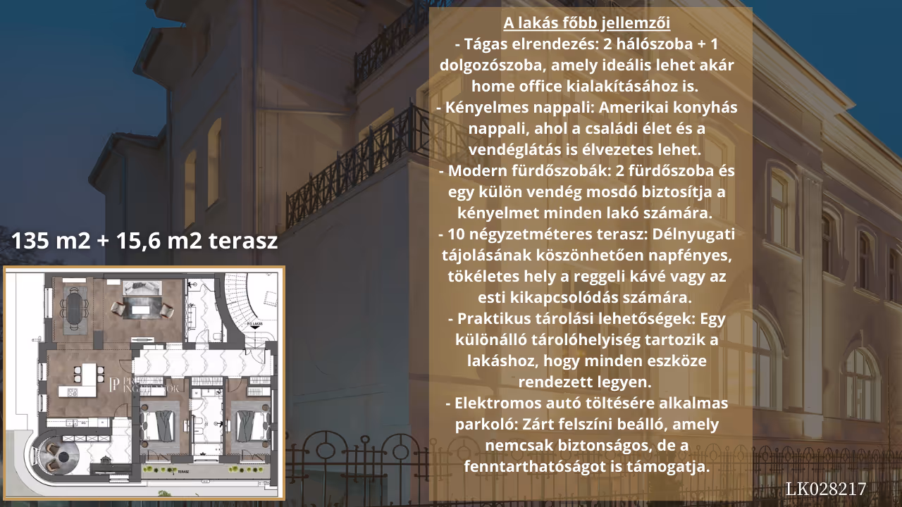 A teljes tartószerkezeti megerősítés mellett új vasbeton födémek, hő- és vízszigetelések, modern gépészeti rendszerek kerültek beépítésre. Az ingatlan a mai kor prémium igényeit kiszolgáló okosotthon-rendszert is kapott.