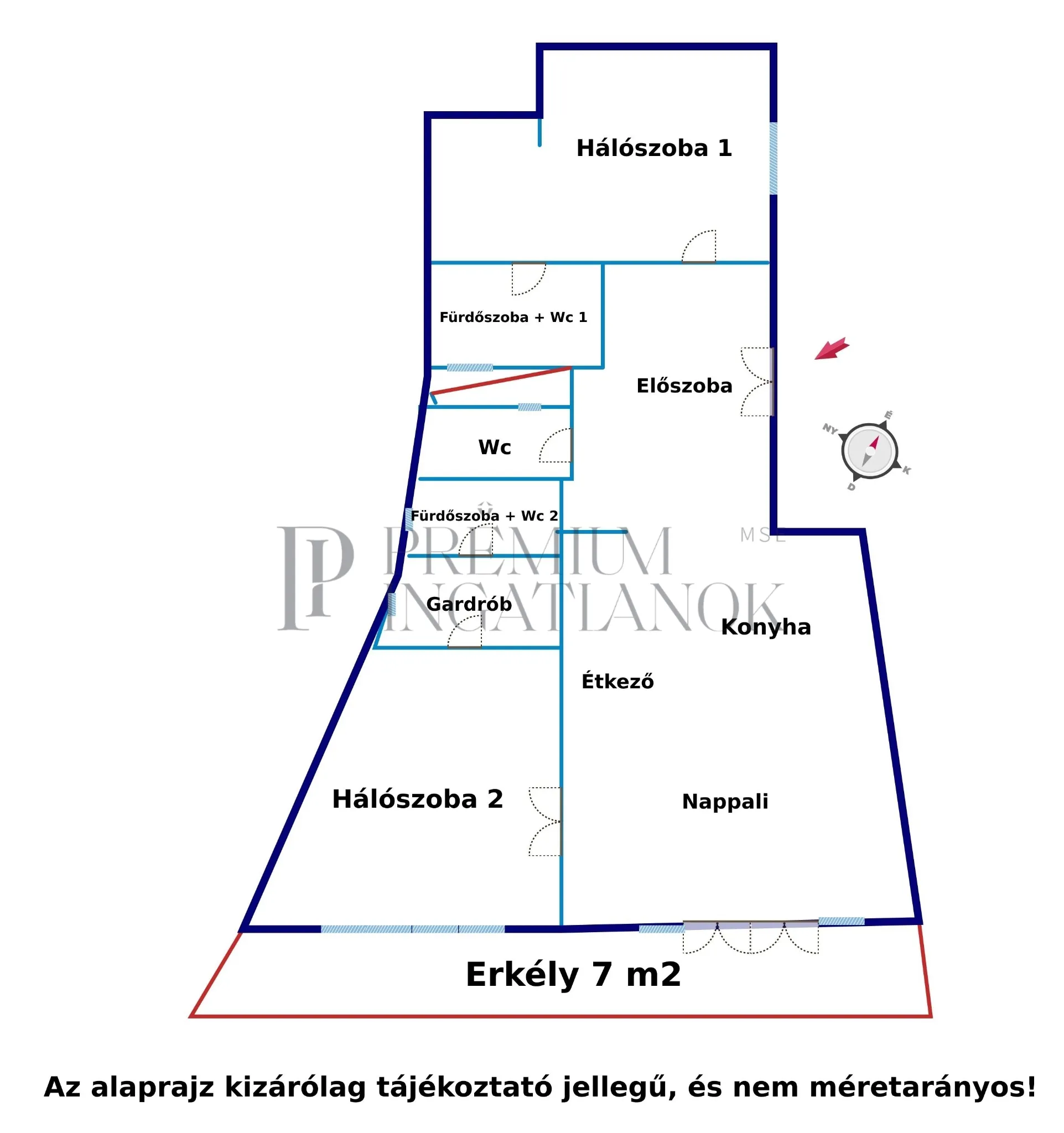 Elrendezés: A lakásban egy tágas nappali, 2 hálószoba, 2 fürdőszoba (mindegyik külön WC-vel), egy különálló WC és egy elegáns előszoba található.