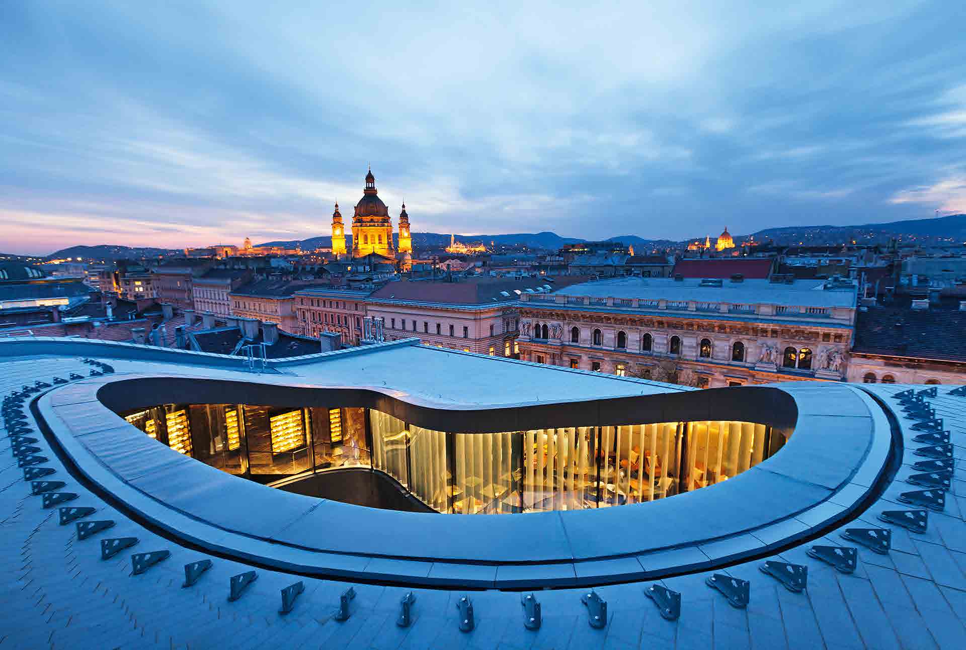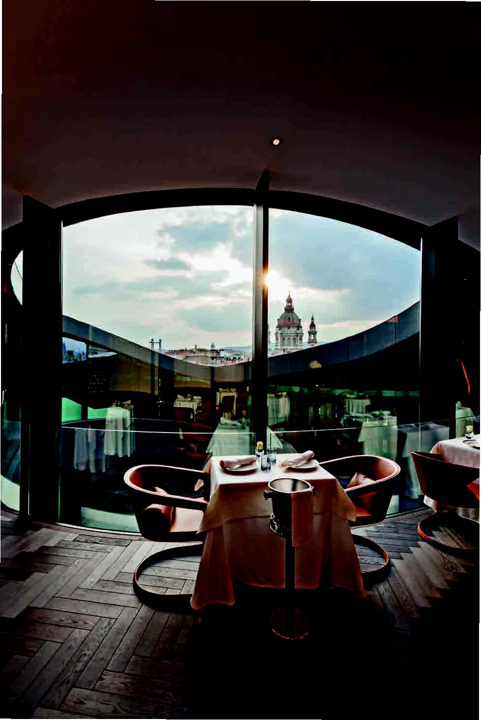 Lounge & Restaurant a legfelső szinten (~600 m²), páratlan panorámával a Bazilikára és a Budai hegyekre.