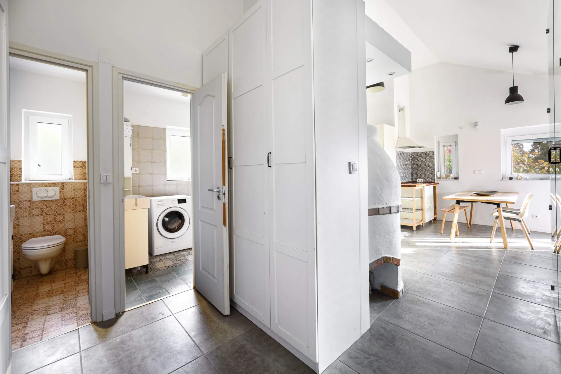 Az emeleti amerikai konyhás nappali különlegessége a szemet gyönyörködtető panorámán kívül, a 3, 86 méteres belmagasság , melynek köszönhetően igazán tágas térérzetet kapunk. Ennek a térnek a központi eleme az autentikus kemence. A sok üvegfelületnek ,és a déli tájolásnak köszönhetően napfényes, világos helyiségek jellemzik a házat. A nyílászárók három rétegű hő, -és hangszigetelt műanyag nyílászárók, a nappaliban elektromos redőnnyel kiegészítve.