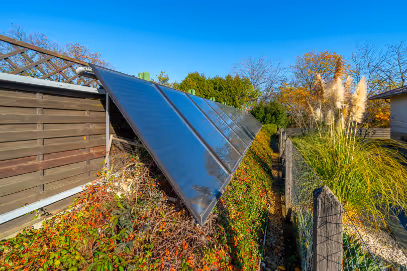 - a medence mellett található 16 db napkollektor, amelyek télen 960 literes hőcserélőn keresztül a fűtésbe dolgoznak be, nyáron pedig a medence fűtését látják el