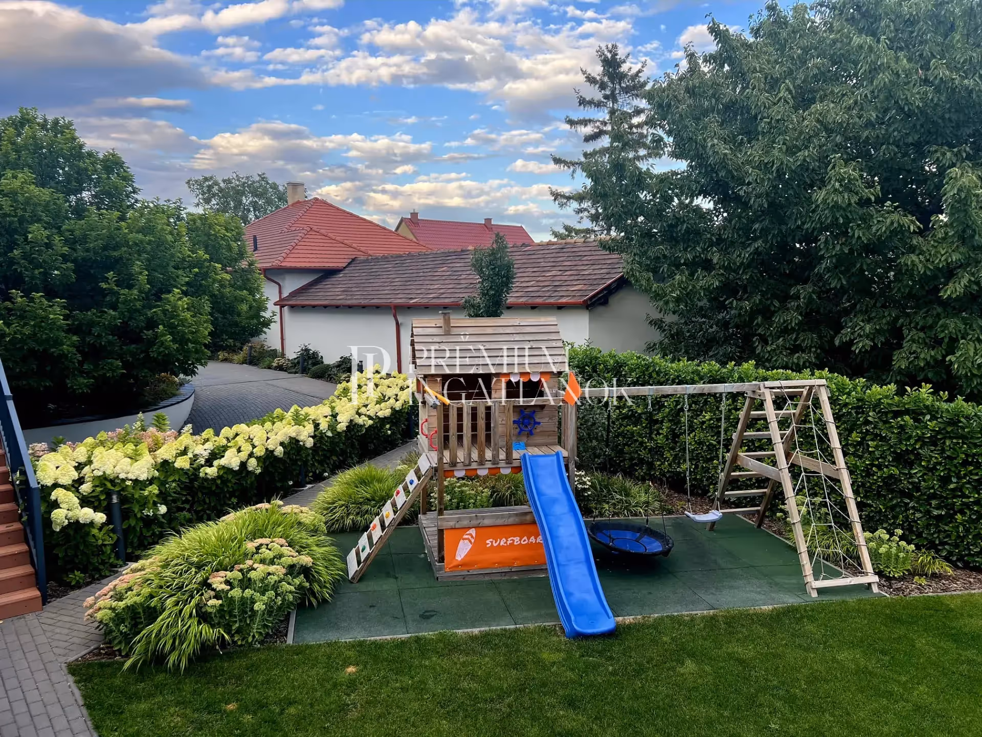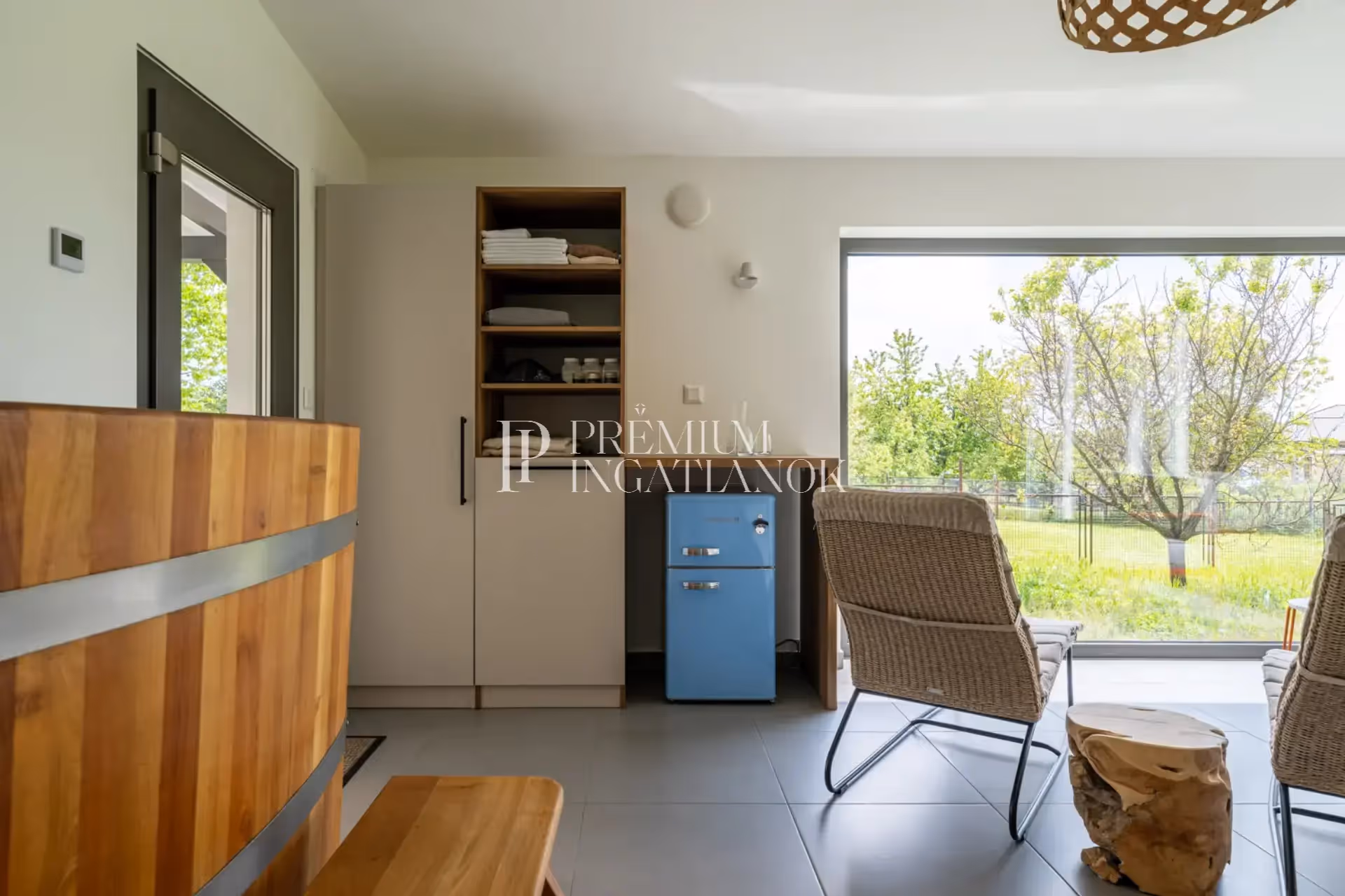 A hatalmas nyári konyha kemencével a kerti partik központja, míg a kibővített wellness részleg – finn- és infraszaunával, épített merülőmedencével, külön zuhanyzóval és panorámaablakos pihenővel – a mindennapi feltöltődést szolgálja.