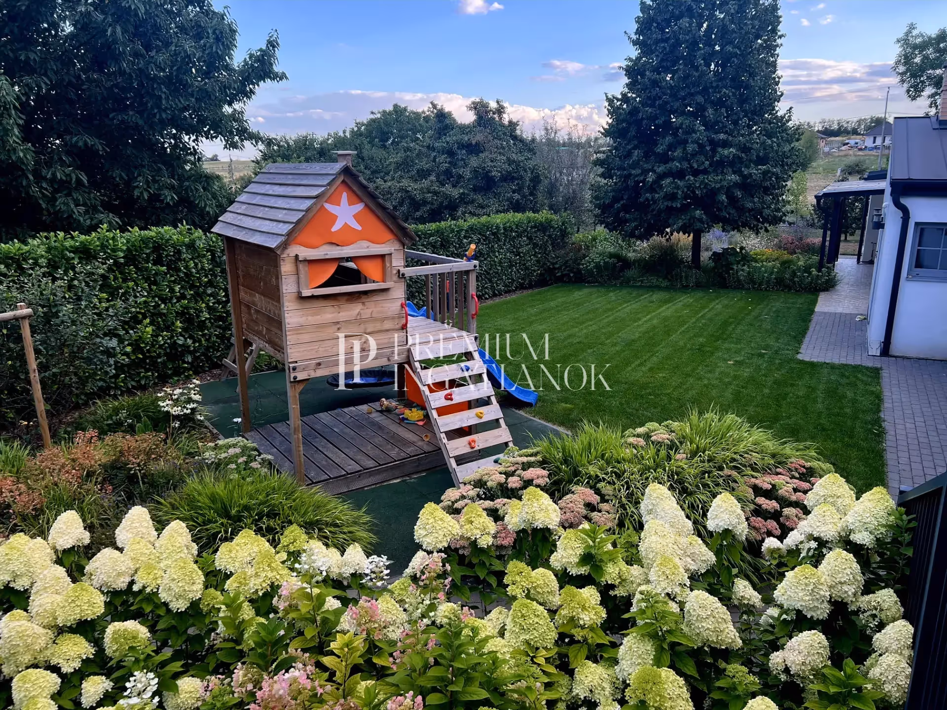 Az 1500 m2-es, profin tervezett kert egy önfenntartó oázis. A föld alatti ciszternából táplált öntözőrendszer gondoskodik a díszkertről, a termő gyümölcsfákról (füge, cseresznye, málna, birs) és az öntözött magaságyásokról.
