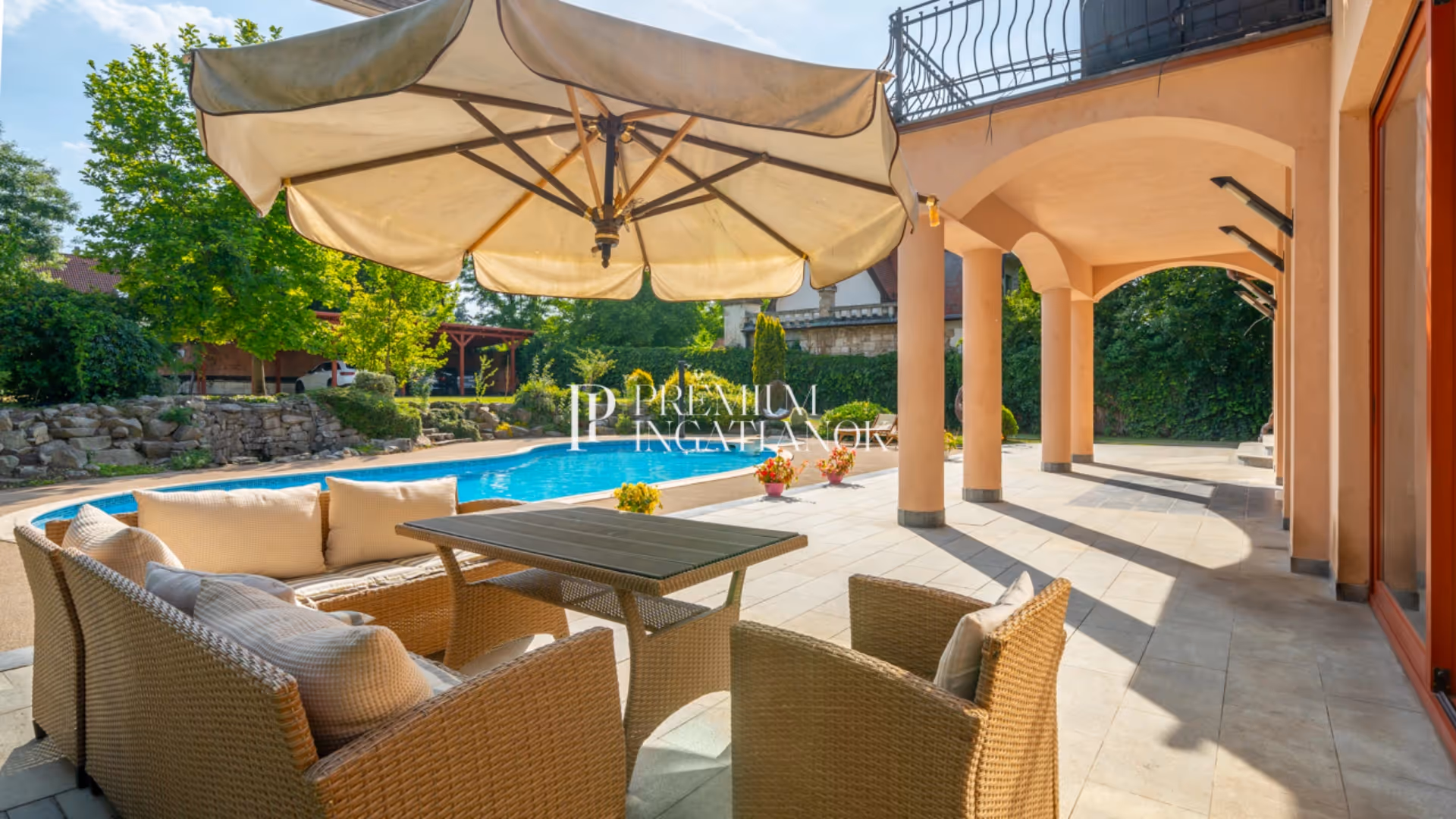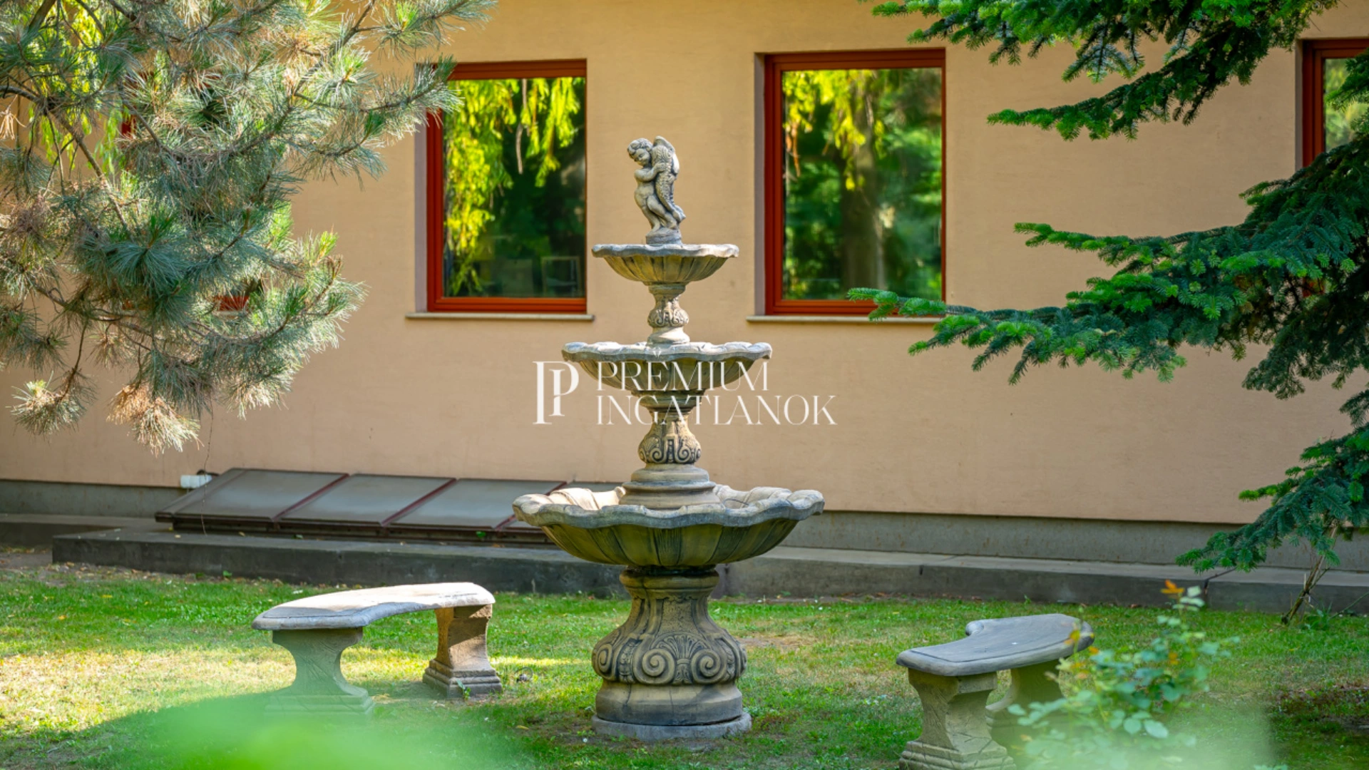 - Parkosított oázis: 2 472 m²-es, gondozott park saját kerti tóval és úszómedencével; az ősfás kert varázslatos hangulata privát, nyugodt menedéket teremt.