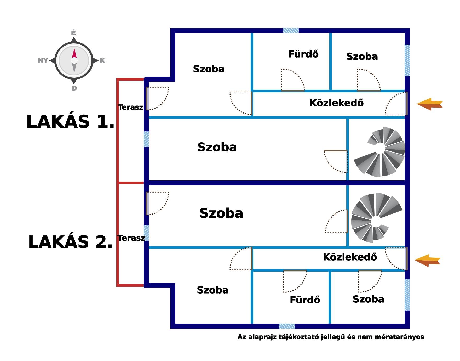 - 1. emelet: 35 m²-es amerikai konyhás nappali, egy 14,2 m²-es szoba, 7 m²-es fürdőszoba és egy hatalmas, 32,5 m²-es fedett terasz.
