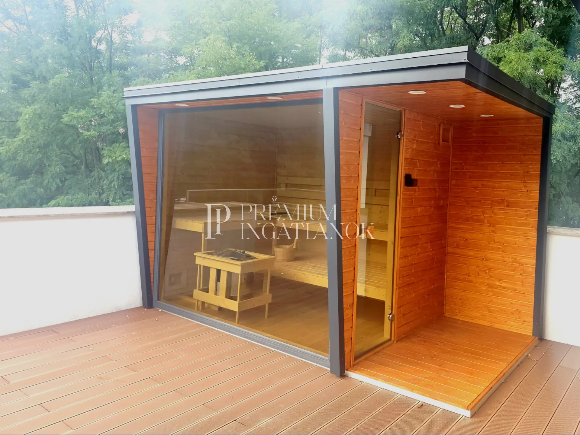 Emeleti, üvegfalú szauna az intim teraszon, közvetlenül a szülői lakosztályból megközelíthetően négy évszakos kikapcsolódás zöldpanorámával.