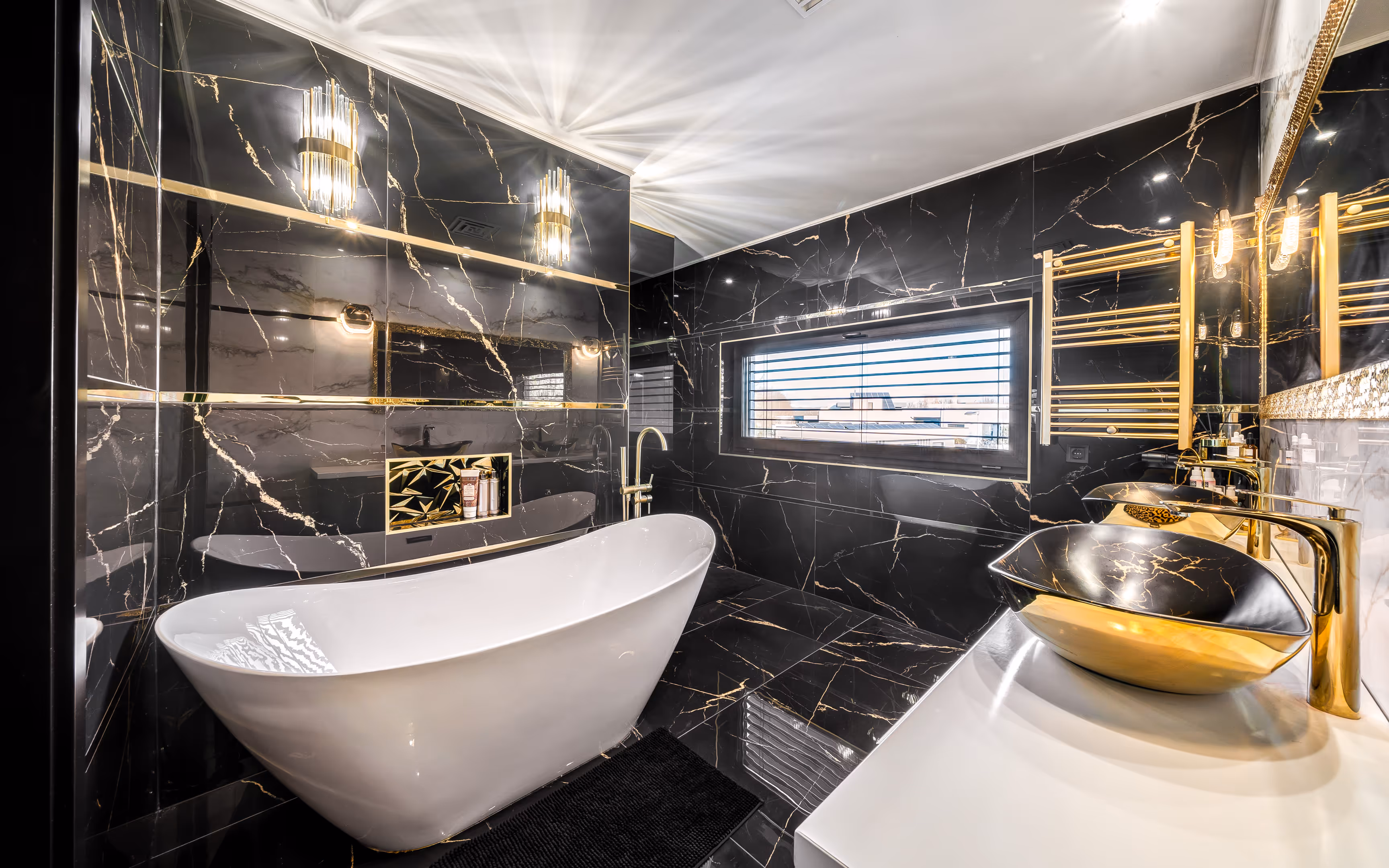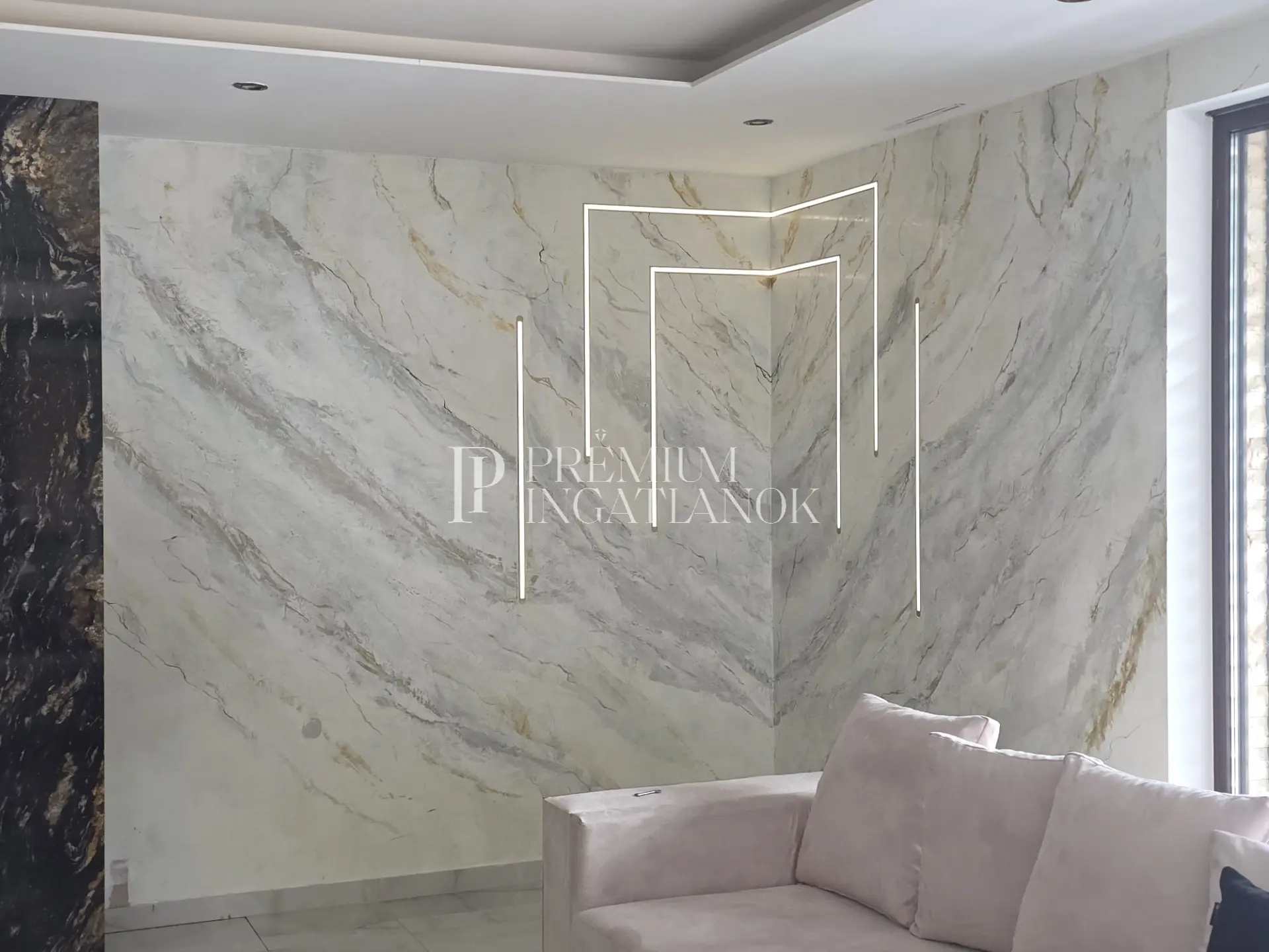 Nagyformátumú kőburkolatok és egyedi fényépítészet a reprezentatív belső terekben (dizájn LED-vonalvilágítás a márványhatású falon).