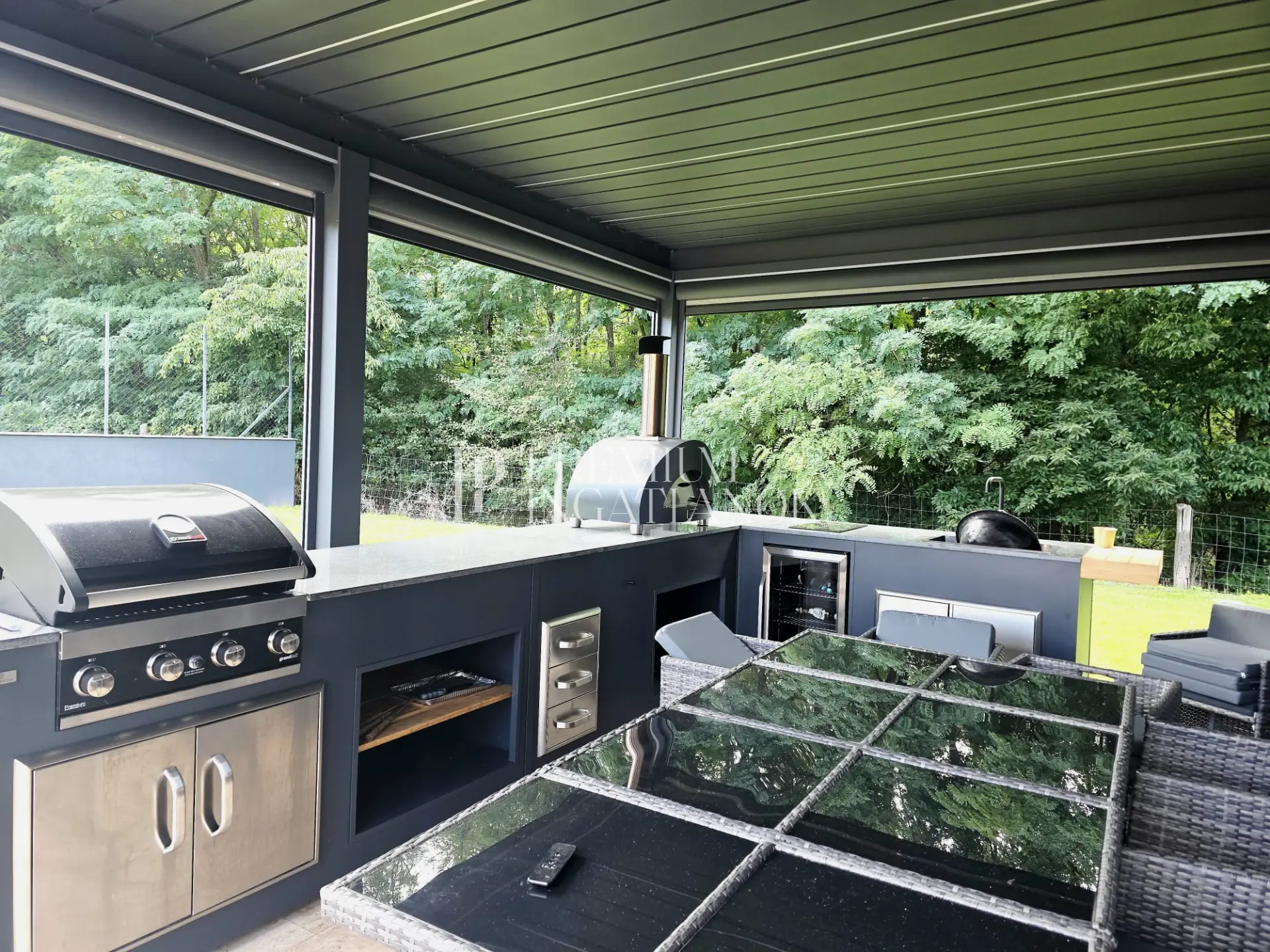 Fedett kerti grillkonyha professzionális beépített gépekkel: nagyméretű gázgrill, mosogató, hűtő/fiókos tárolók, munkapult, külön pizzasütő kemence tökéletes szabadtéri vendéglátó tér.