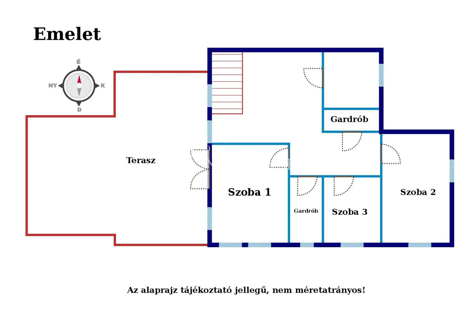 Az emeleti szülői lakosztály saját gardróbbal és fürdővel, valamint a szaunához nyíló privát teraszkapcsolattal rendelkezik; a további hálók külön fürdőblokkhoz csatlakoznak.