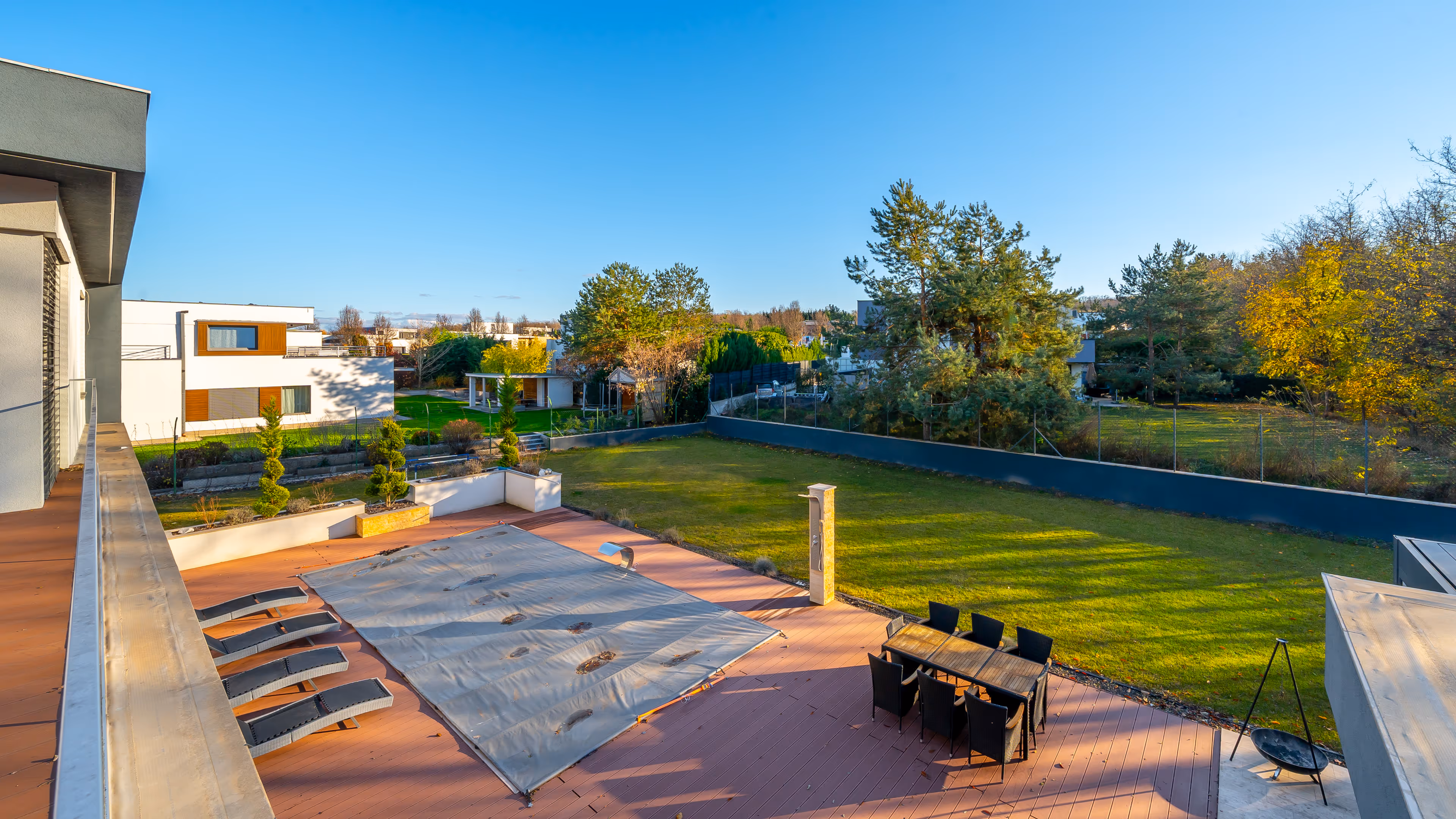Parkosított, intim, zöldövezeti telek, prémium burkolatok és hatalmas, fedett/nyitott teraszfelületek