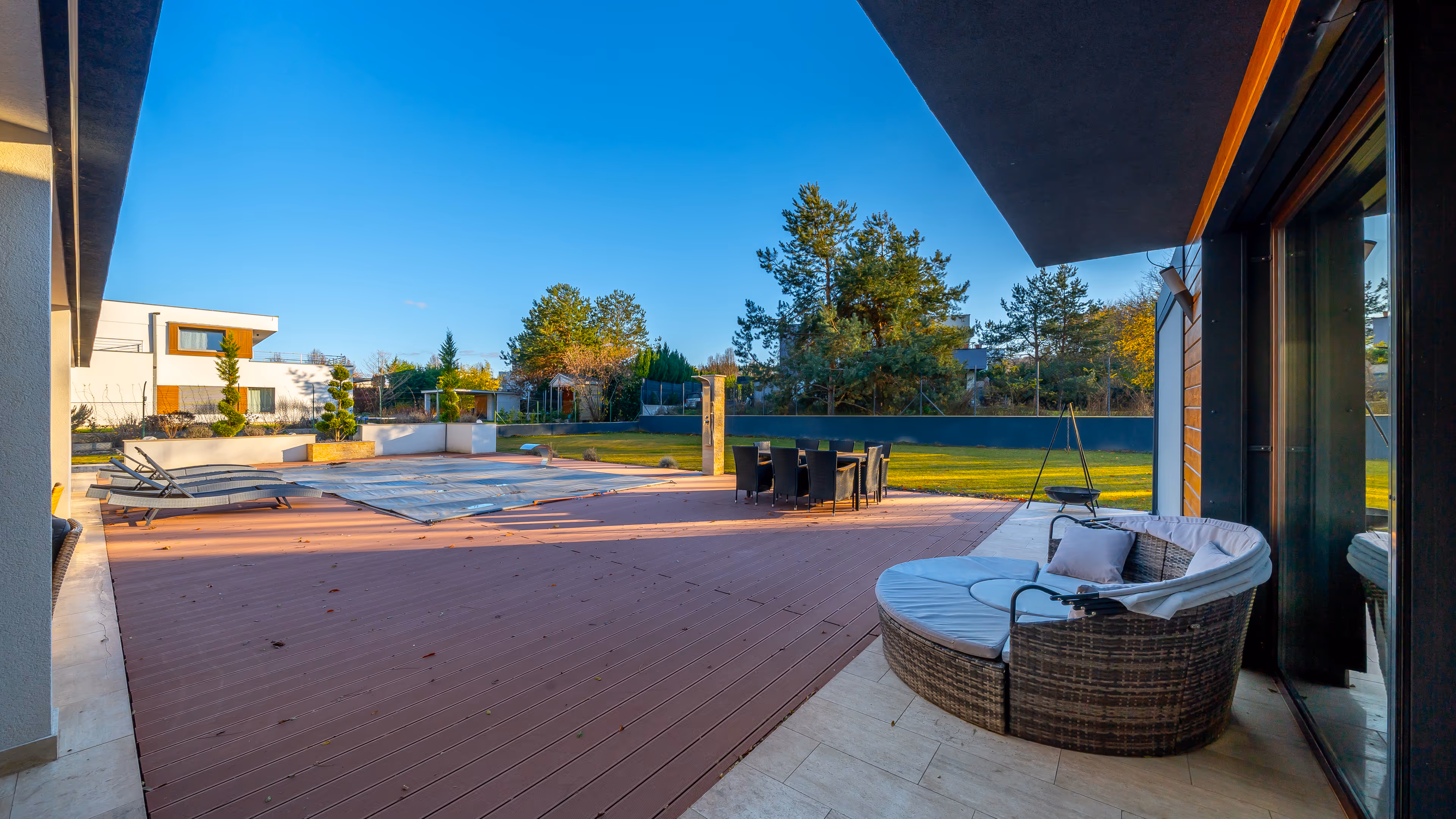 Elegáns, fedett teraszok kőburkolattal, közvetlen kapcsolattal a kerthez és a medencéhez.