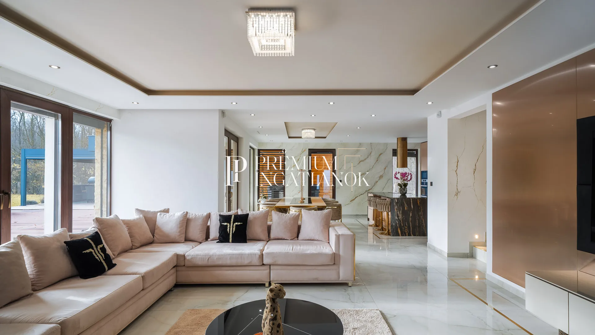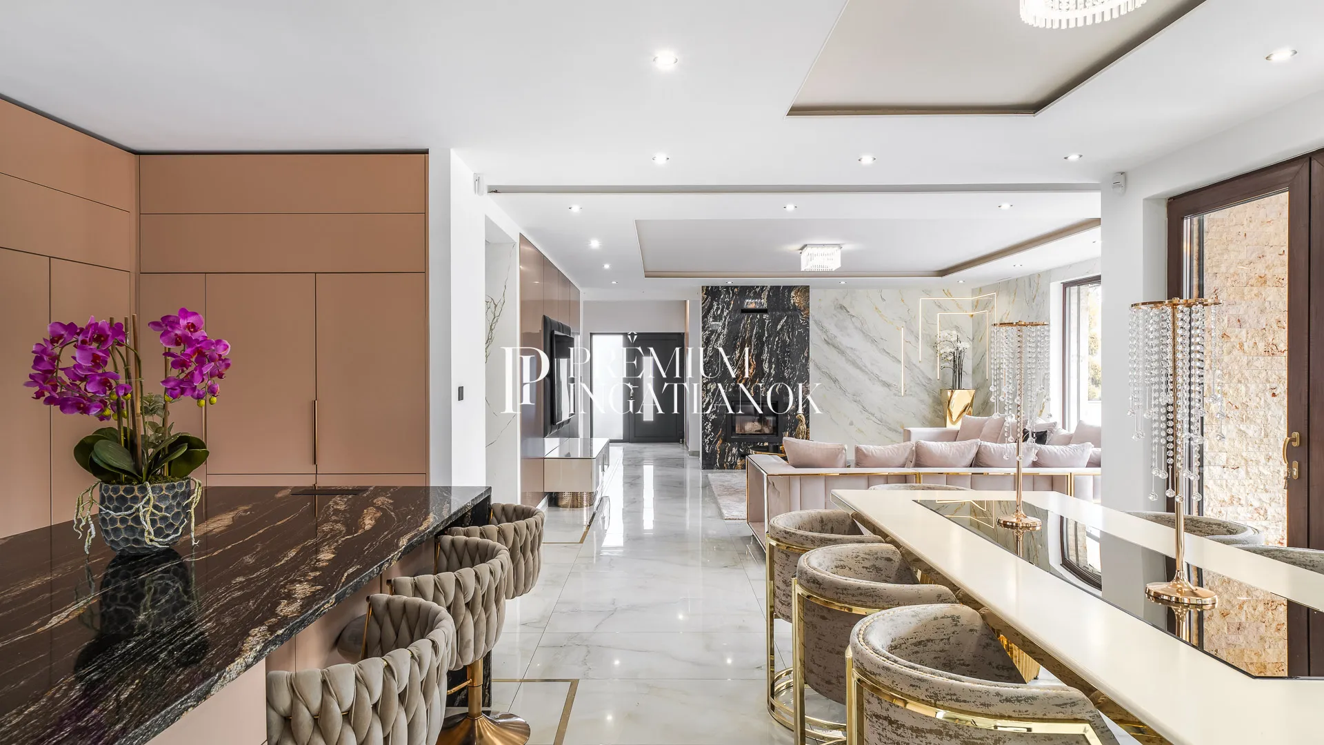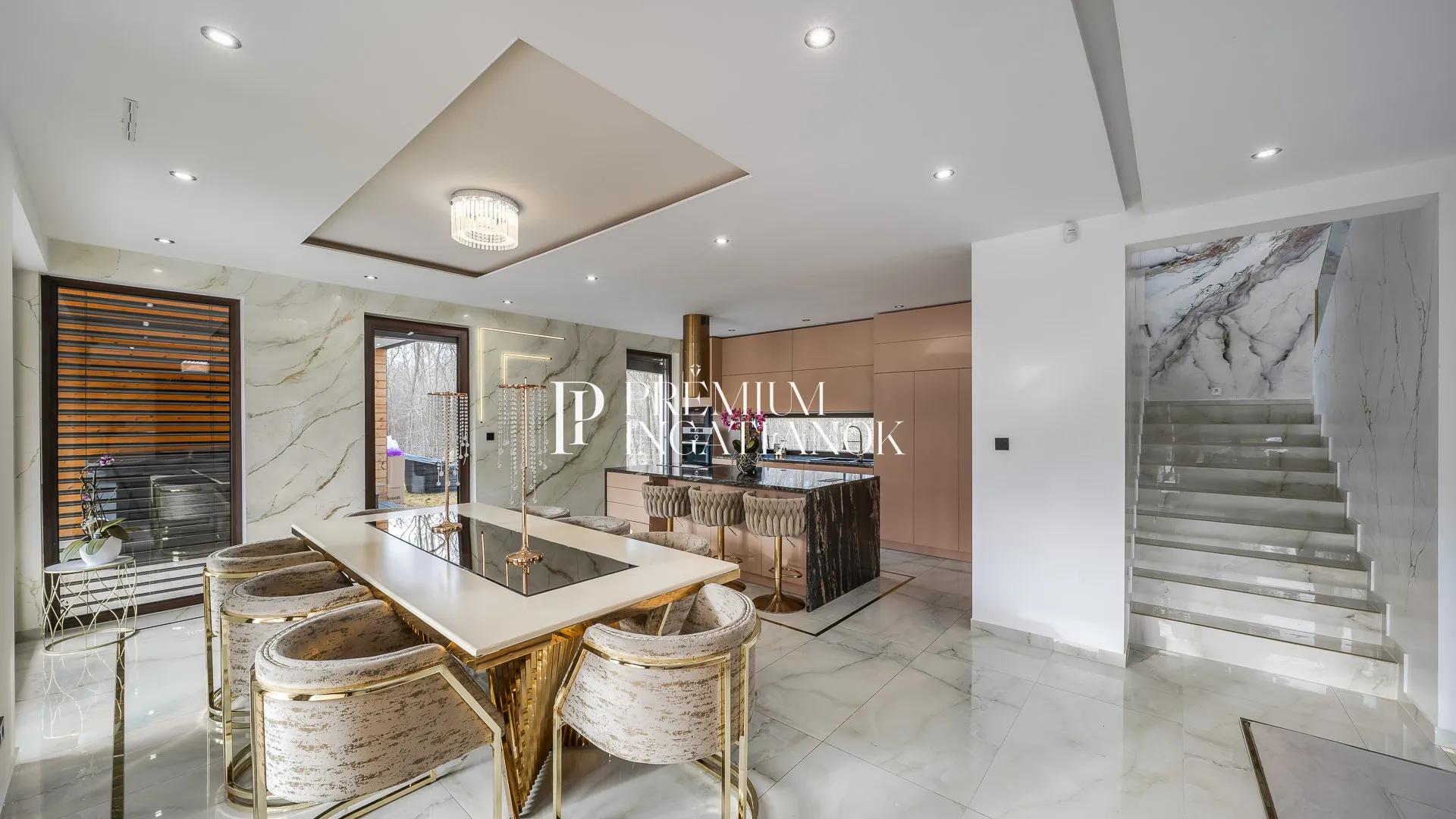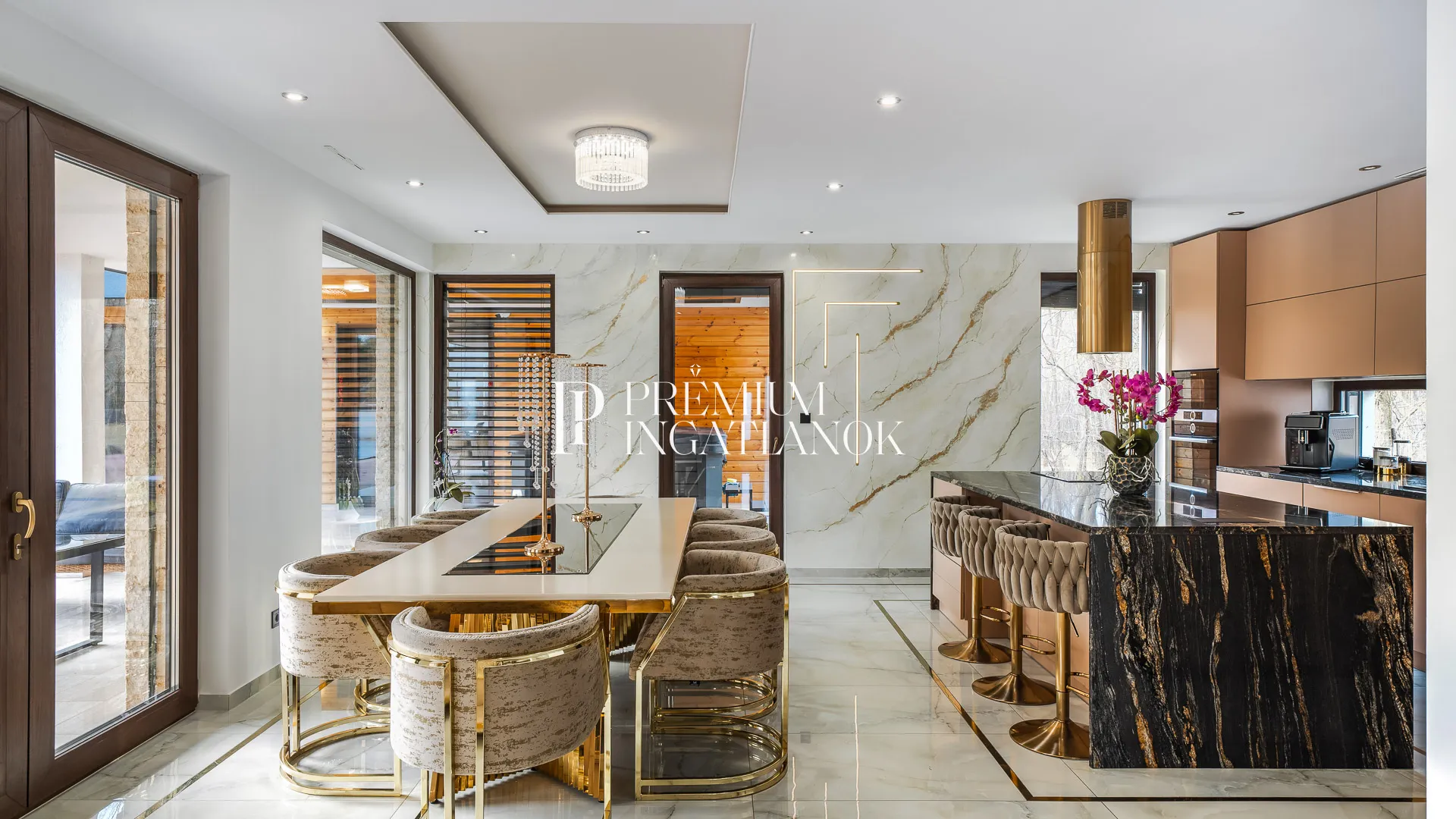 Az óriási üvegfelületekkel megnyitott nappali-étkező-konyha tér a kertre és a medencére nyílik. A konyha márványpulttal és prémium gépparkkal felszerelt. Nagyformátumú kőburkolatok, dizájn LED-világítás, vízteres kandalló és egyedileg gyártott prémium beltéri ajtók emelik az otthon esztétikáját.