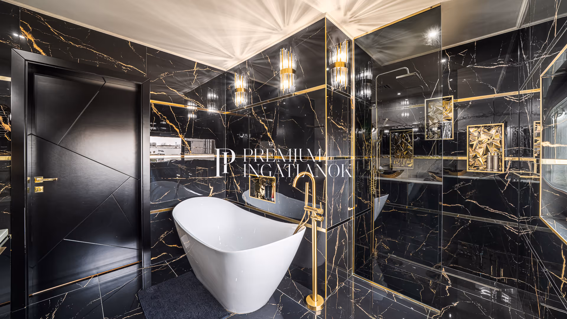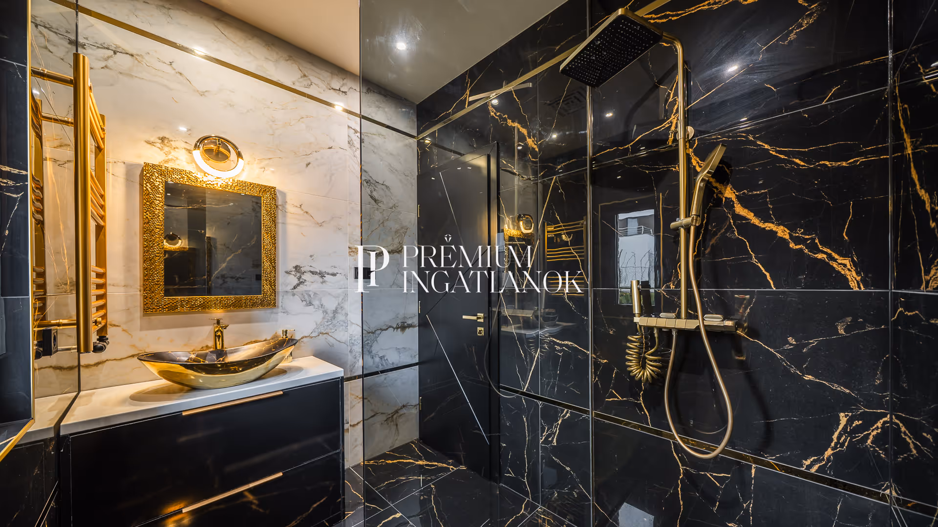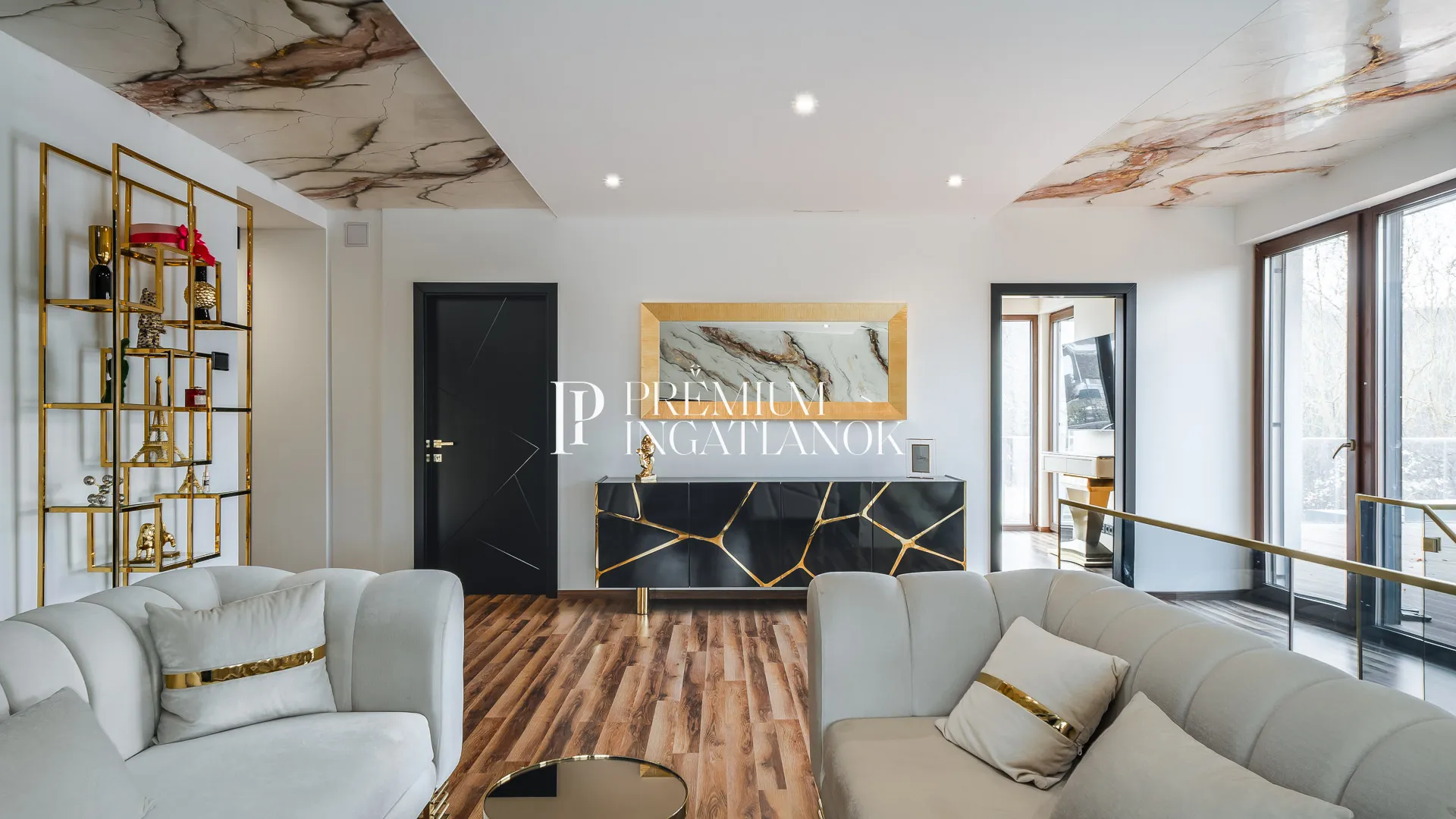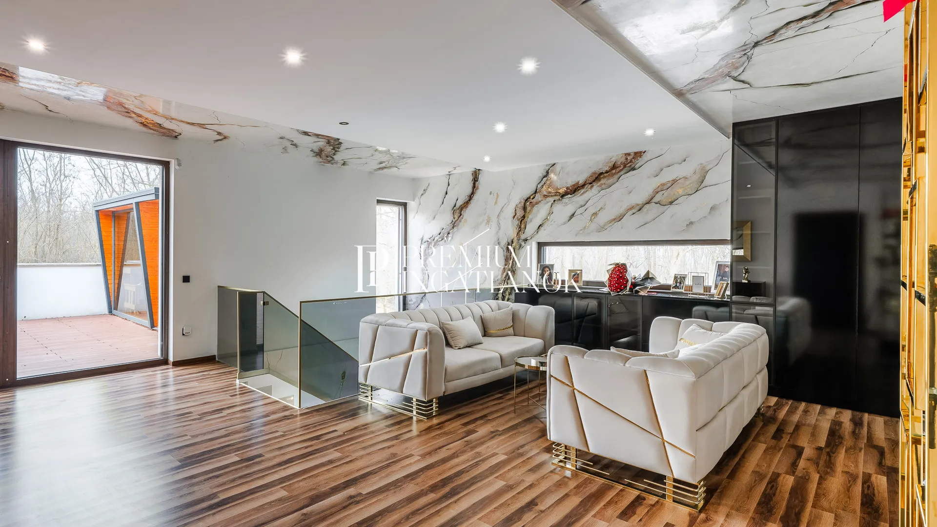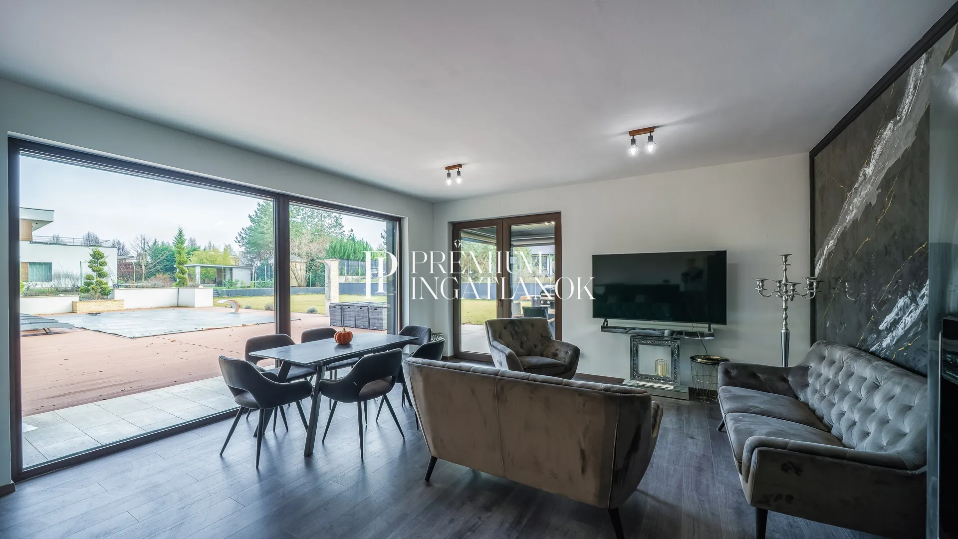 Az óriási üvegfelületekkel megnyitott nappali-étkező-konyha tér a kertre és a medencére nyílik. A konyha márványpulttal és prémium gépparkkal felszerelt. Nagyformátumú kőburkolatok, dizájn LED-világítás, vízteres kandalló és egyedileg gyártott prémium beltéri ajtók emelik az otthon esztétikáját.
