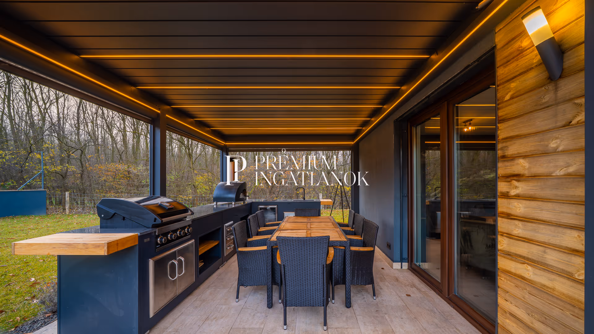 A fedett, távirányítóval zárható, motoros screenelős bioklimatikus pergola alatt helyezkedik el a „Grillandia” felsőkategóriás kültéri konyha – gázgrillel, pizzasütő kemencével, beépített hűtőkkel, tárolókkal és márványmunkapulttal. Az automata öntözőrendszerrel karbantartott kert diszkrét intimitást biztosít.