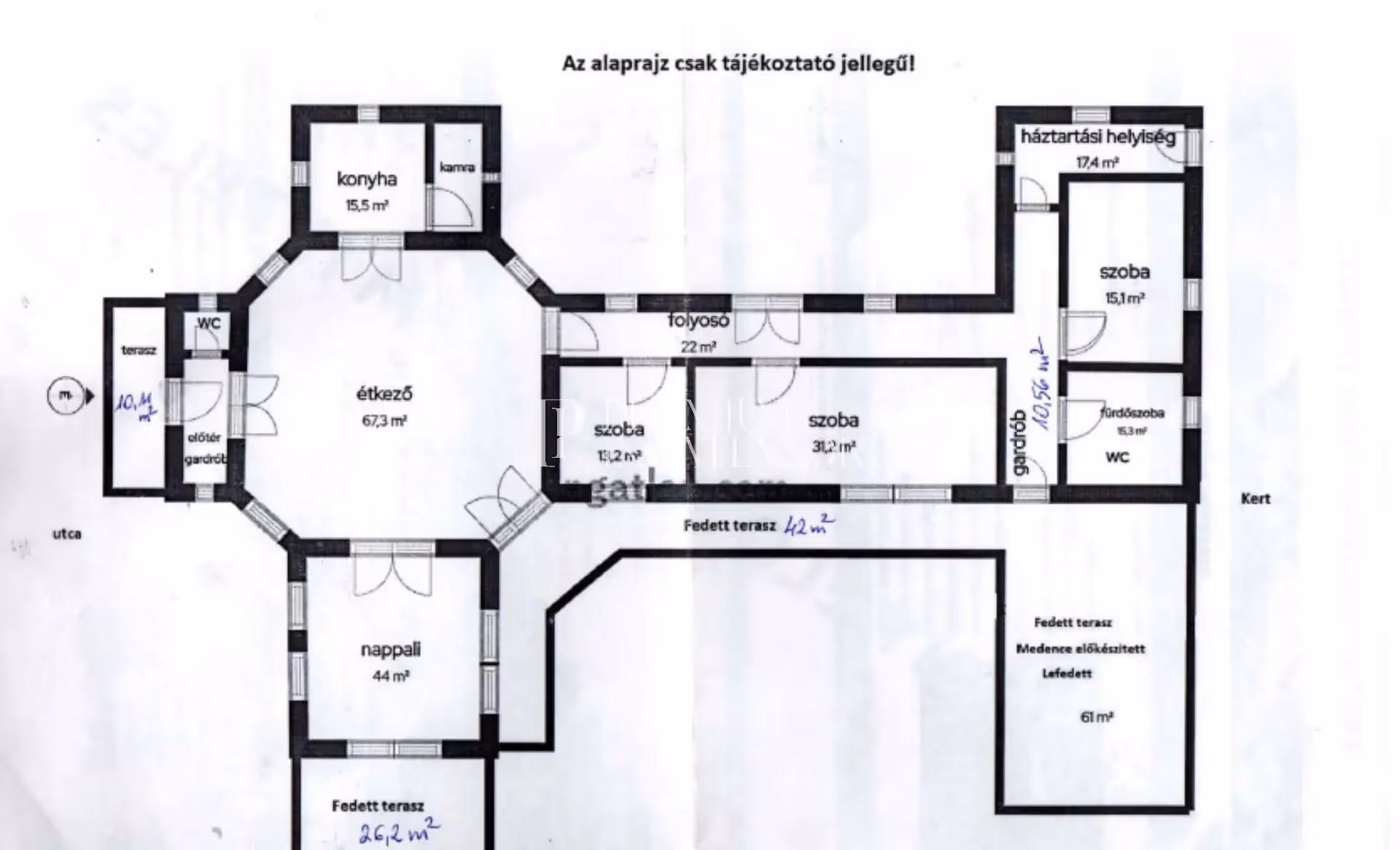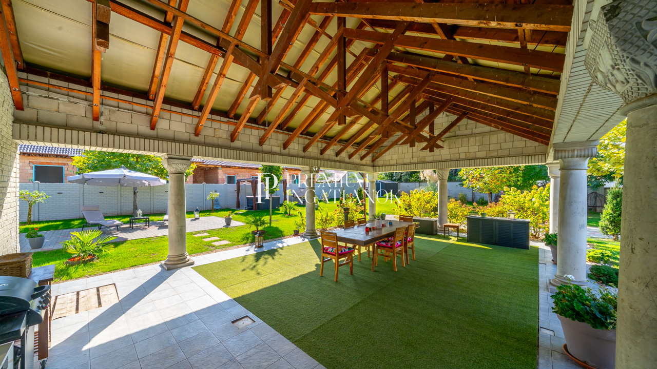 Az ingatlan közel 2 100 m²-es telken helyezkedik el, ahol fedett teraszok, napozóterasz és parkosított kert biztosítanak nyugodt pihenést. A medence elhelyezésére az előkészítés megtörtént.