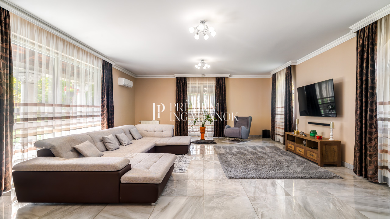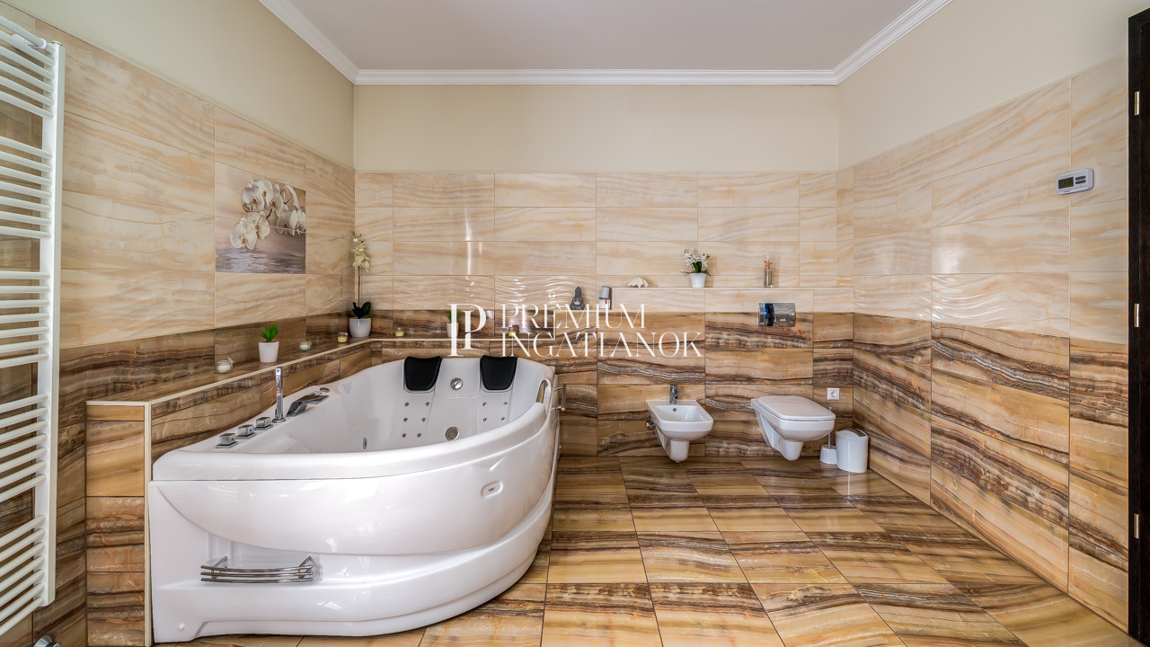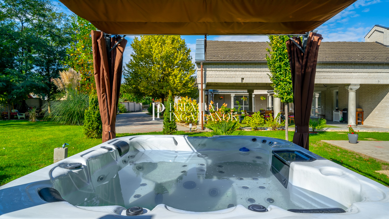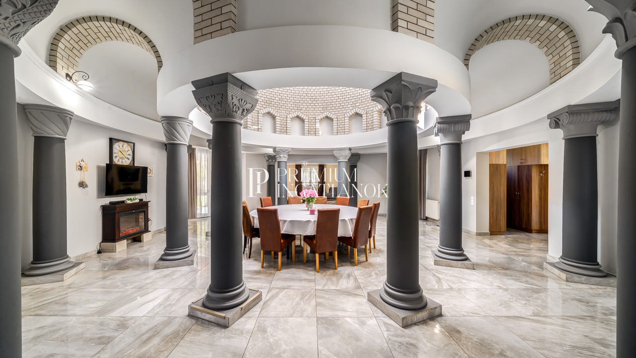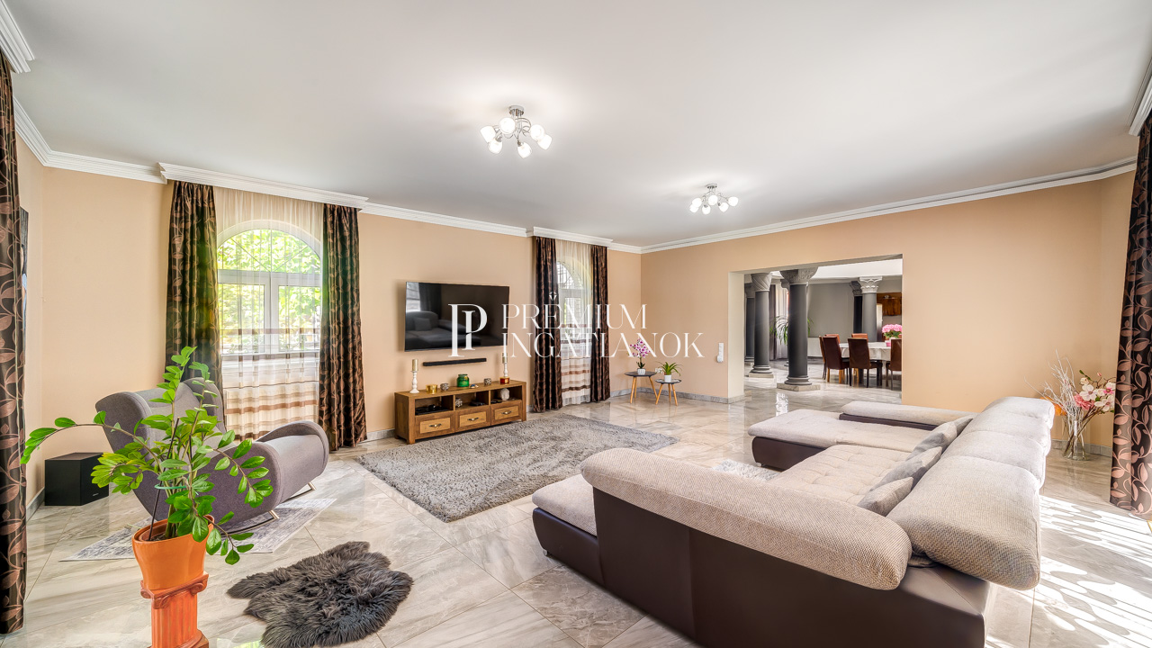 A közel 270 m²-es lakótér egy szinten helyezkedik el, tágas és jól átgondolt alaprajzzal. A központi étkezőterem impozáns oszlopsorral övezve különleges atmoszférát teremt, ideális családi összejövetelekhez és vendégek fogadásához. A nappali világos és tágas, a hálószobák kényelmes méretűek, a fürdőszobában jakuzzis fürdőkád található, emellett infraszauna és praktikus háztartási helyiség is szolgálja a mindennapokat.