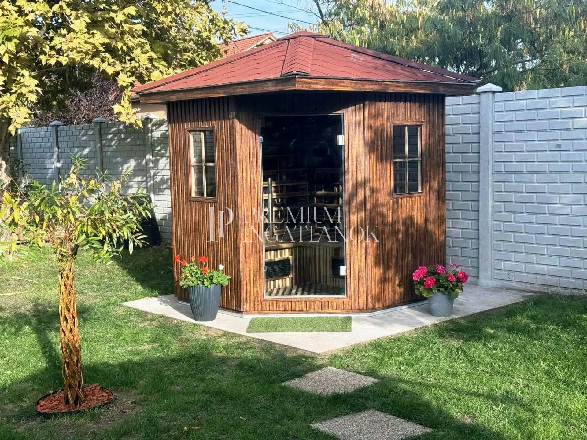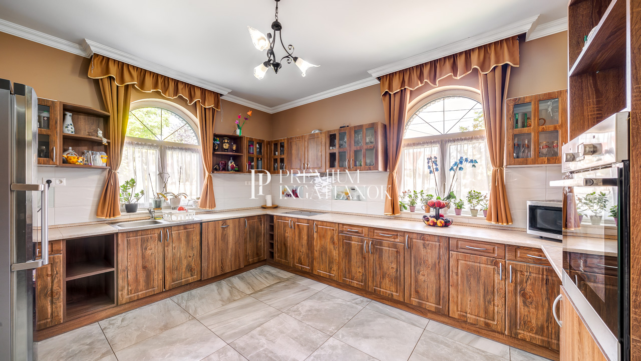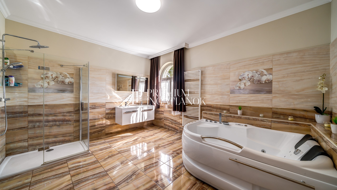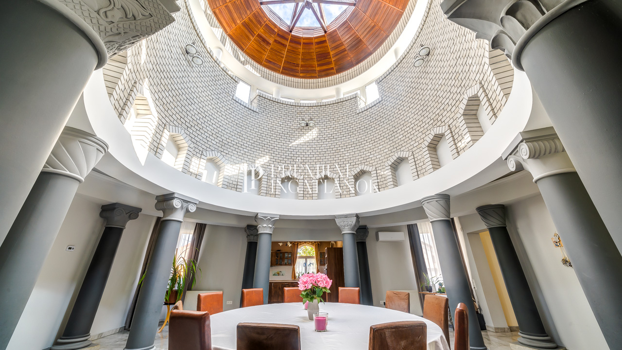 A közel 270 m²-es lakótér egy szinten helyezkedik el, tágas és jól átgondolt alaprajzzal. A központi étkezőterem impozáns oszlopsorral övezve különleges atmoszférát teremt, ideális családi összejövetelekhez és vendégek fogadásához. A nappali világos és tágas, a hálószobák kényelmes méretűek, a fürdőszobában jakuzzis fürdőkád található, emellett infraszauna és praktikus háztartási helyiség is szolgálja a mindennapokat.