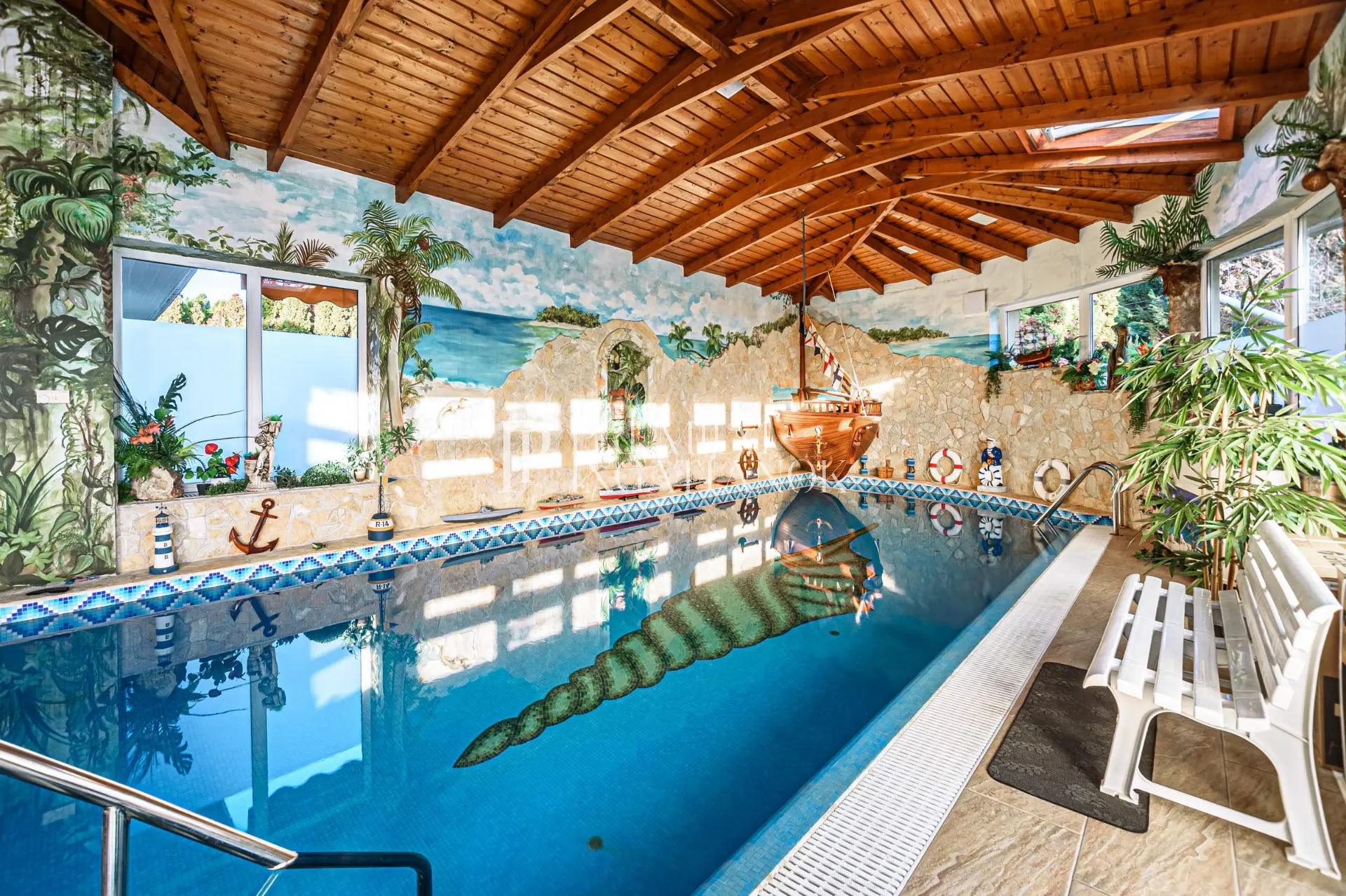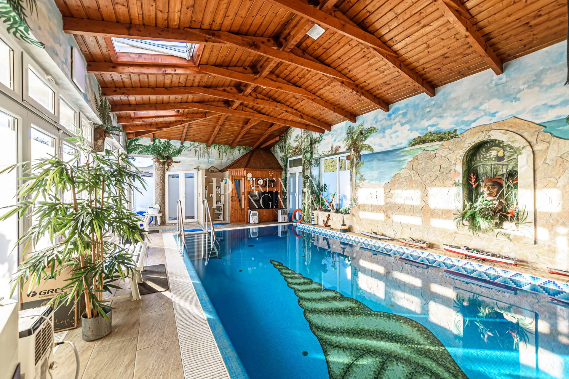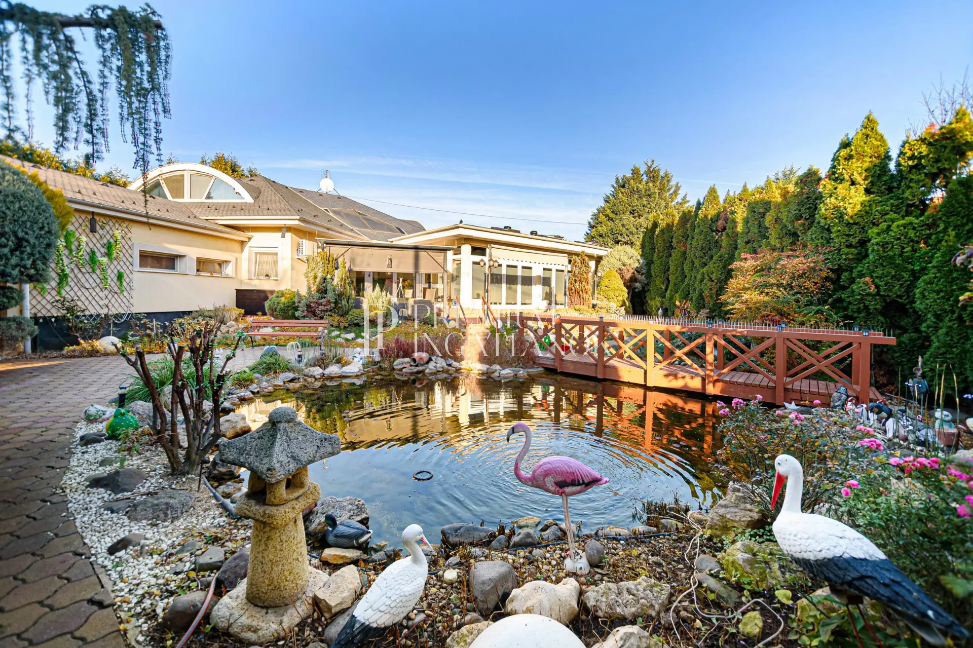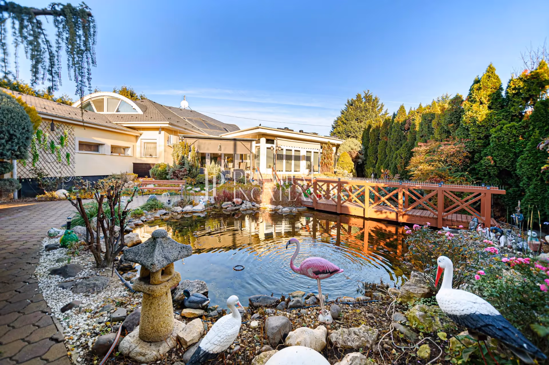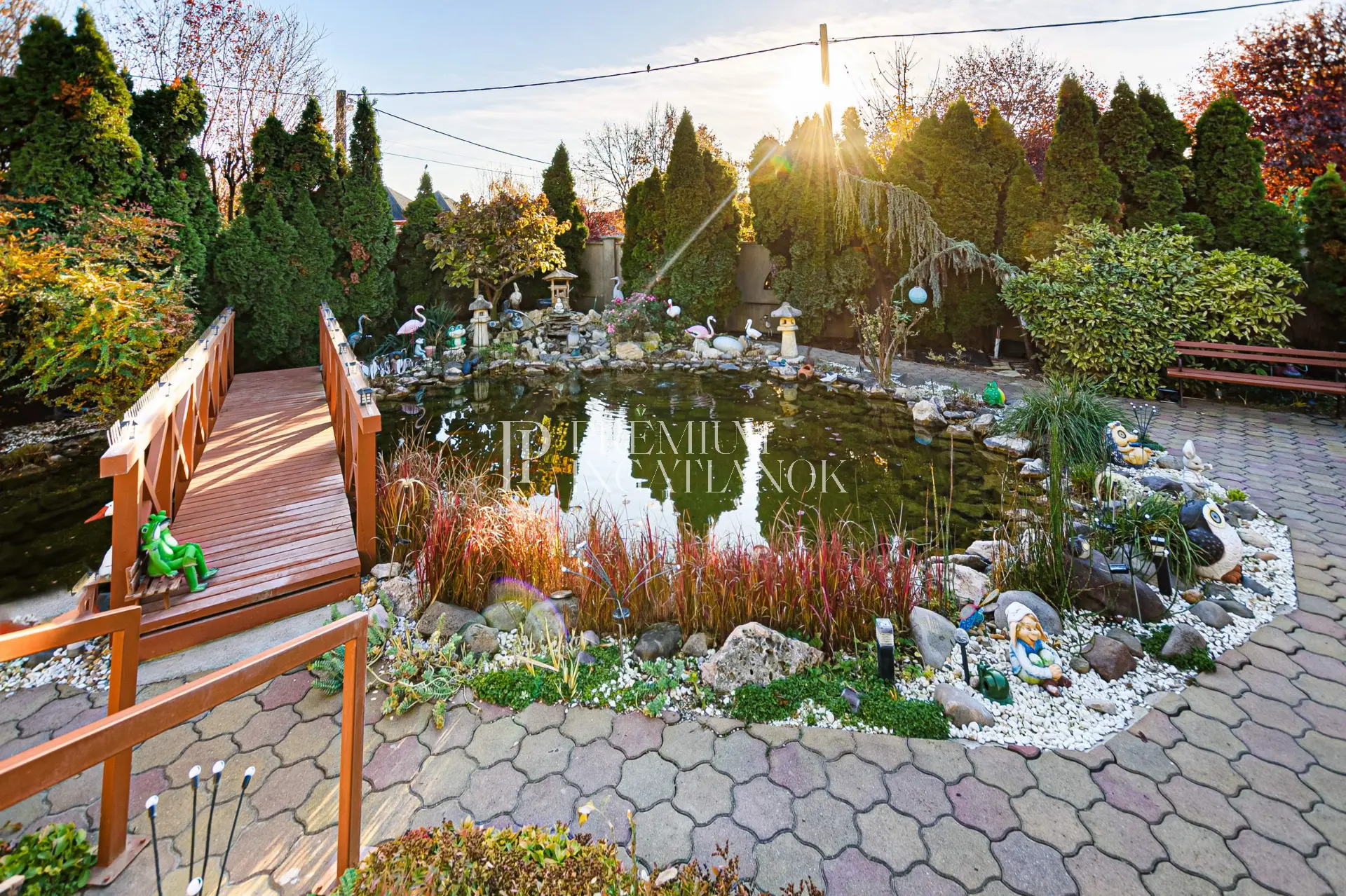 Az ingatlanhoz tartozik egy különálló, teljes értékű közművesített vendégház is, így vendégei vagy akár egy nagyobb család tagjai is kényelmesen élvezhetik a privát terek adta lehetőségeket.A kert napfényes, jól karbantartott, gyönyörű díszkerttel, saját romantikus tóval, melynek varázsa minden évszakban egyedi. A kertben található egy fedett, nagyméretű uszoda is, mely révén a nyári napokat a legnagyobb kényelemben töltheti el a család és barátaik. Az öntözőrendszer gondoskodik a kert zavartalan gondozásáról.