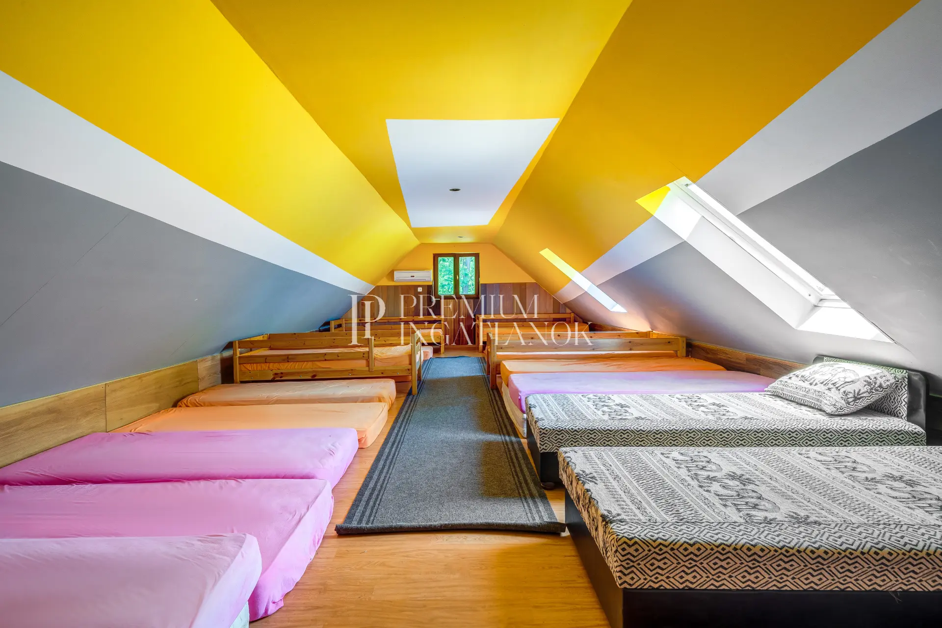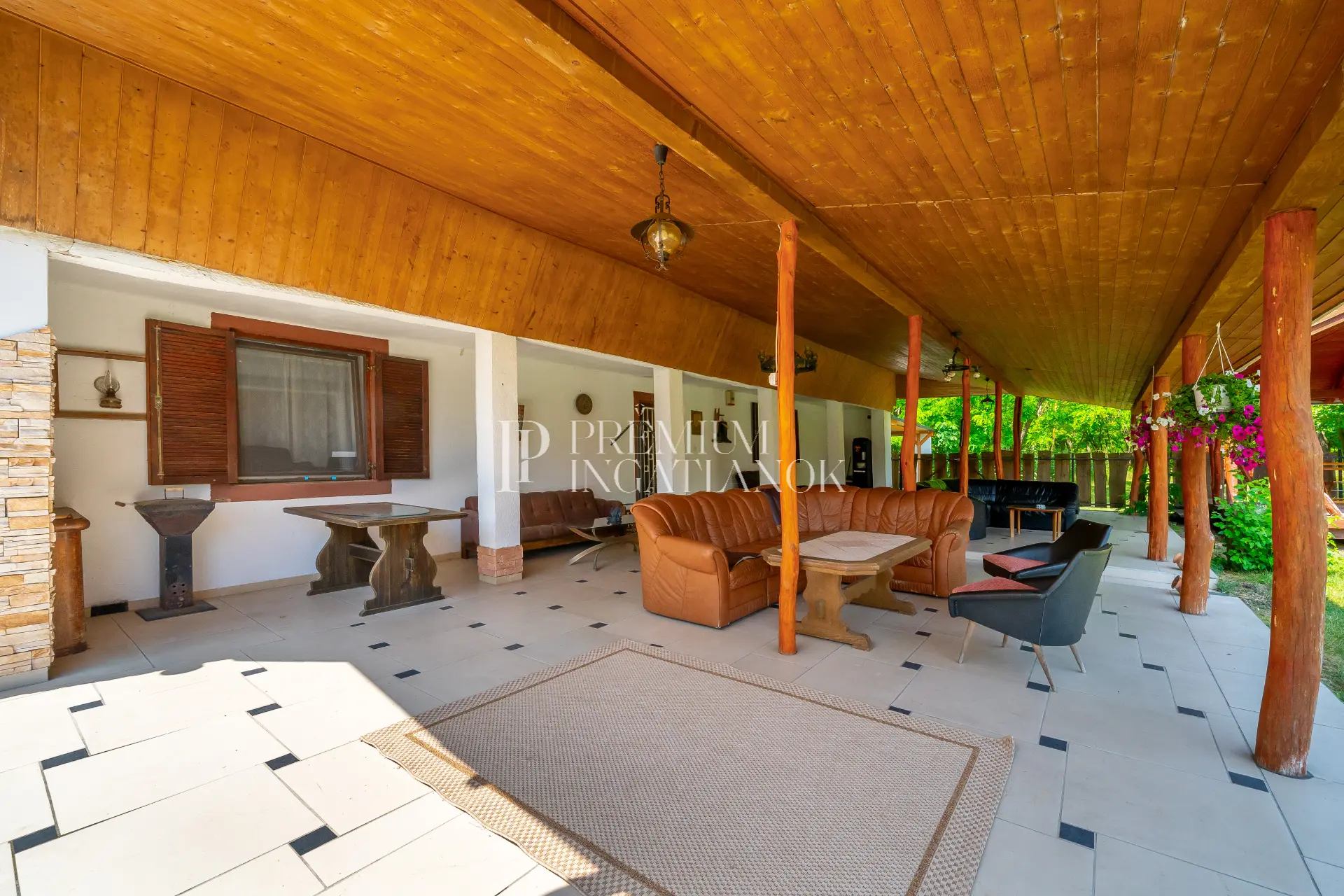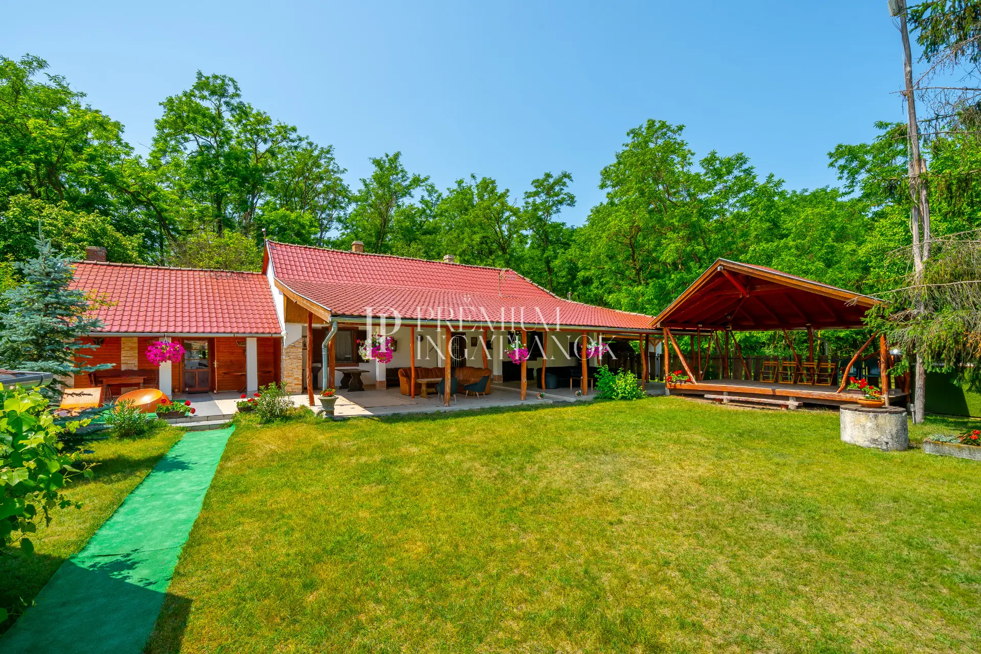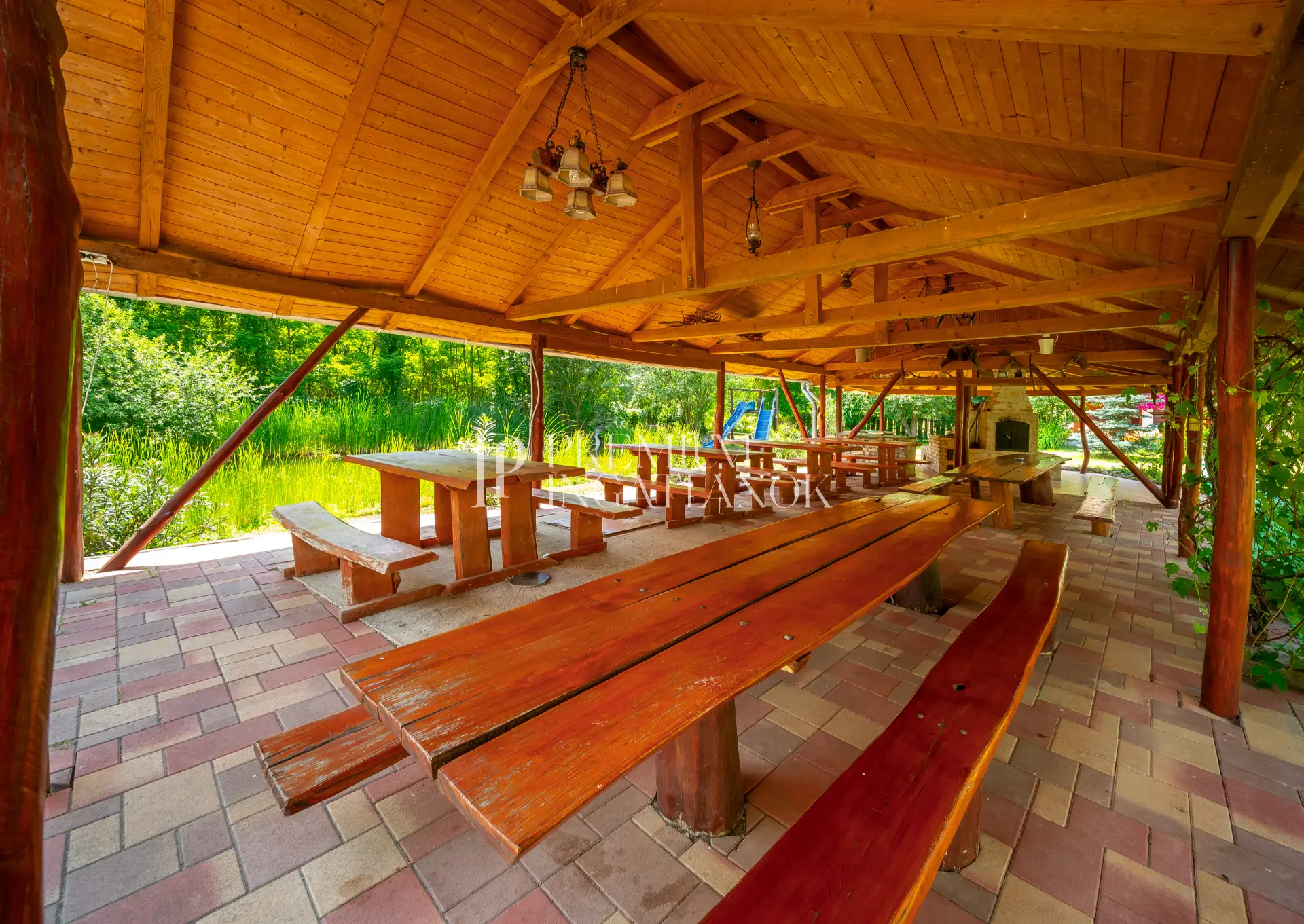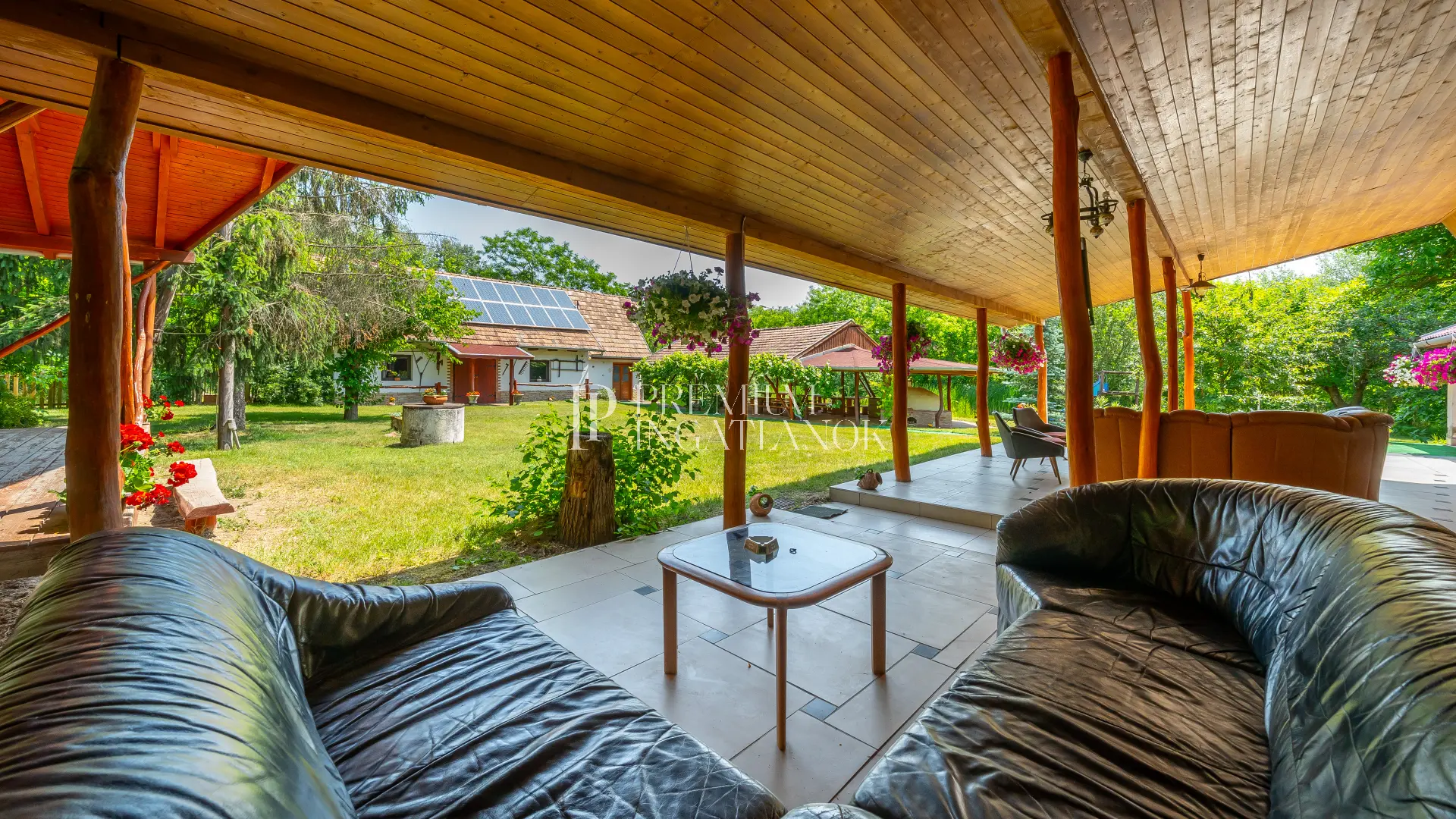 A vendégek kényelmét szolgálja a 90 m2 területű szaletni, melynek hangulatát emeli a tűzhellyel egybeépített búbos kemence. A 120 m2-es teraszon keresztül jutunk a főépületbe ahol előszobát, két szobát, fürdő+wc, konyhát, tárolót illetve egy boros pincét találunk. Az épület melegéről Dán rendszerű korona kályha és elektromos padlófűtés gondoskodik. A műhelynek, garázsnak is egyaránt használható épület mellett helyezkedik el egy 70 m2-es színpad. A terület fenntartásához szükséges gépek a vételár részét képezik.Ha felkeltette érdeklődését az ingatlan, keressen bizalommal akár hétvégén is.