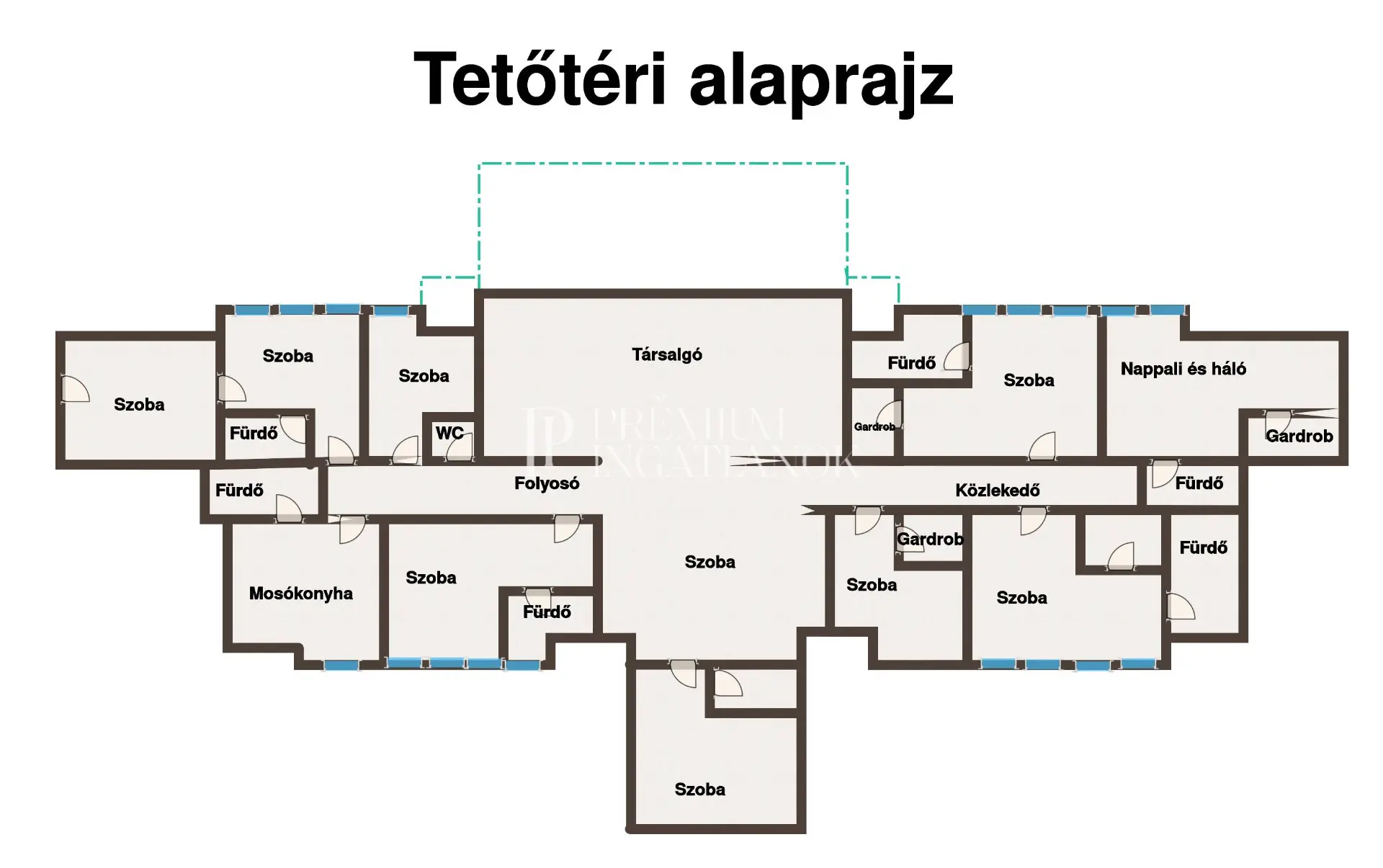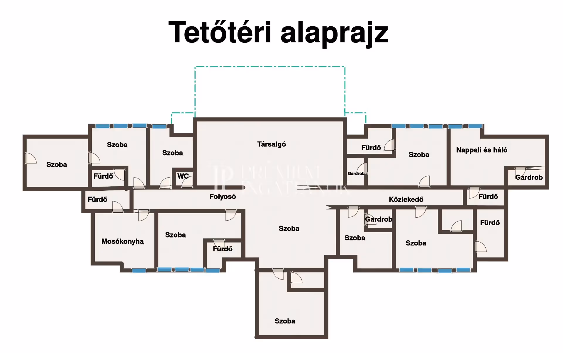 -Emelet: 8 fürdőszobás szoba, társalgó, zeneszoba, teakonyha