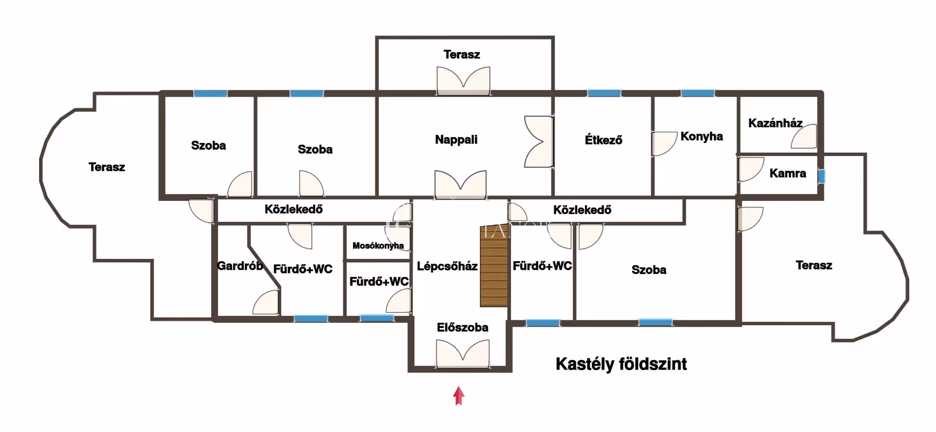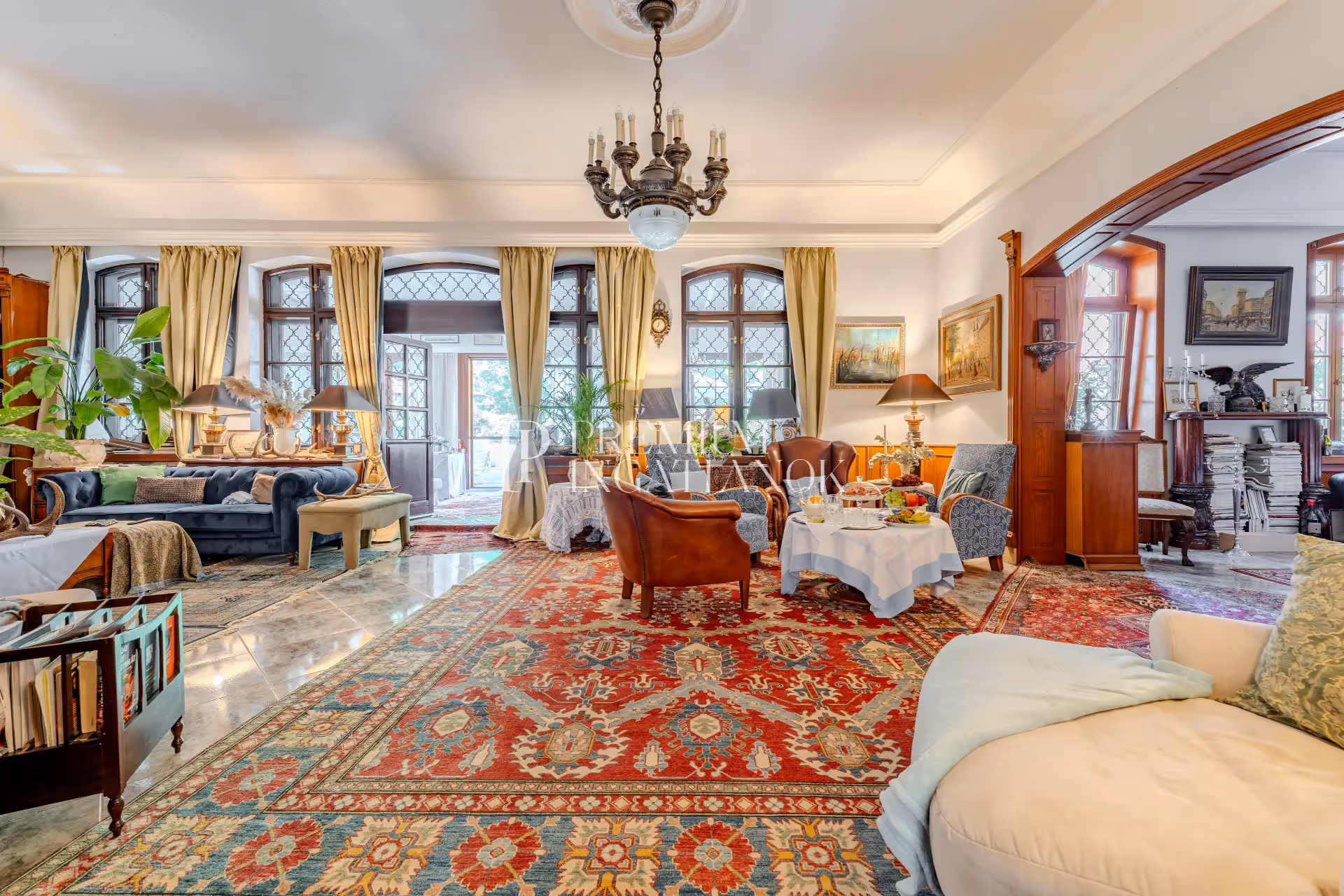 -Földszint: exkluzív nappali kandallóval, házi könyvtár, képgaléria, gourmet konyha, étkező, télikert, veranda, 4 fürdőszobás lakosztály, vendégszalon és gardrób