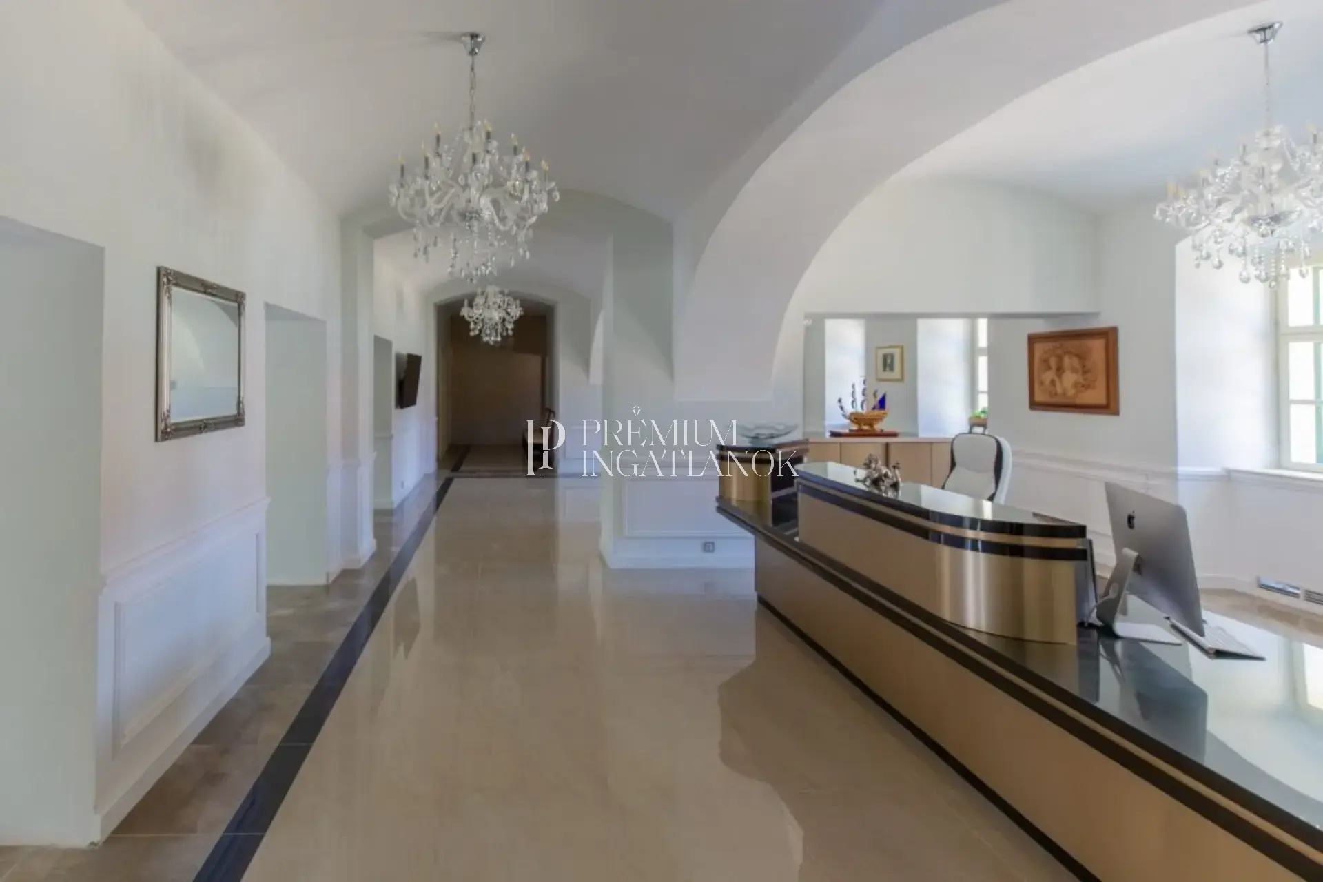The approx. 2,300 m², three-level main building includes an inner courtyard with fountain and landscaped surroundings. The property is in excellent technical and aesthetic condition, renovated using high-quality materials.