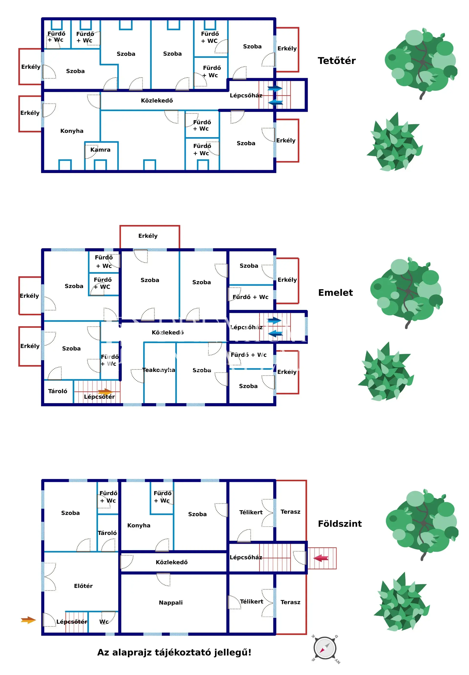 Az ingatlan 2 lakásos társasházként nyilvántartott, 14 + 3 szobás, 3 szintes ’okos otthon’, 1.069 nm-es parkosított telken.A ház 637 nm, 9 db erkéllyel és 2 db nyitott terasszal valamint 40 nm pincével rendelkezik, melyben kazánház, mosókonyha, raktár, vasaló szoba található.