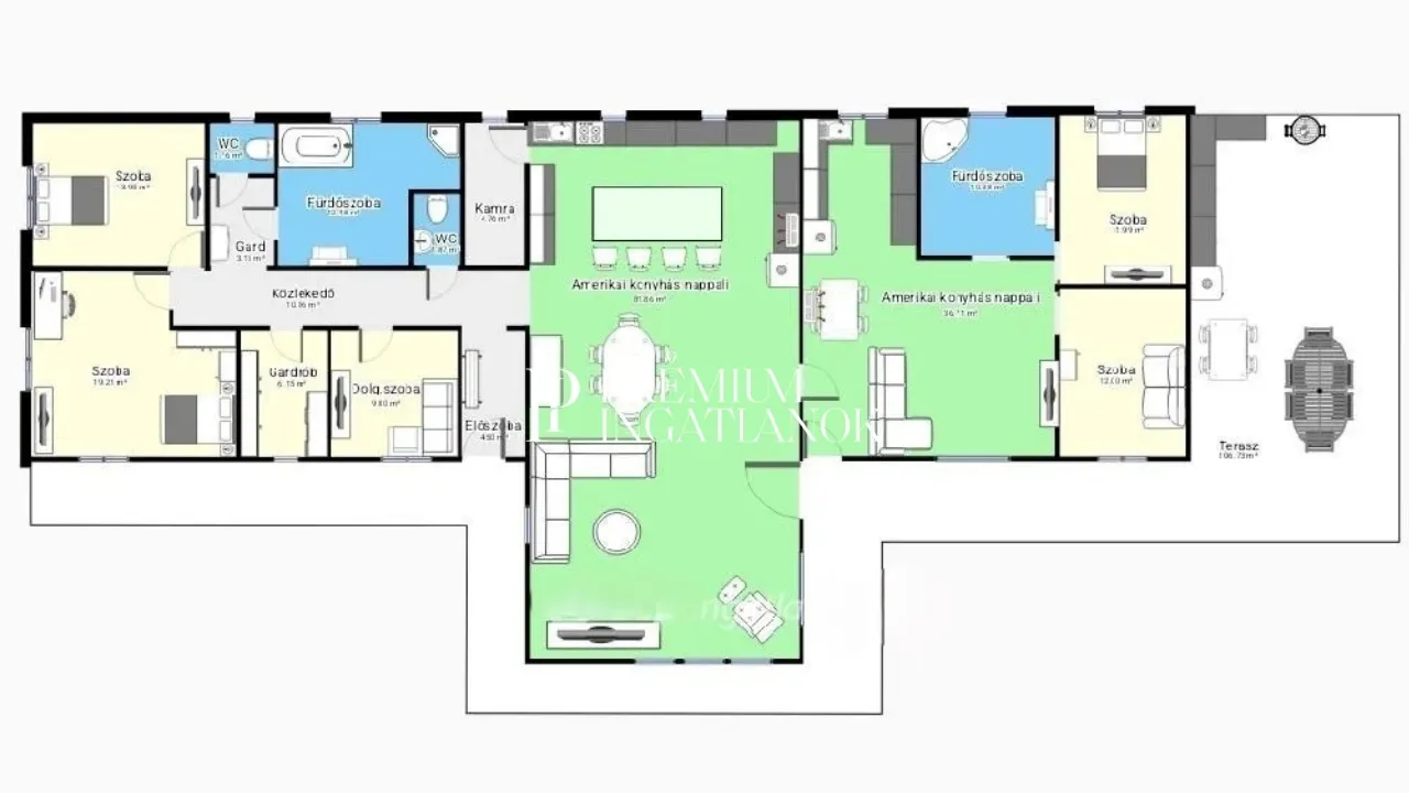 • Bruttó 360 m² (nettó 240 m²) alapterületű családi ház két lakrésszel, BB energetikai besorolással