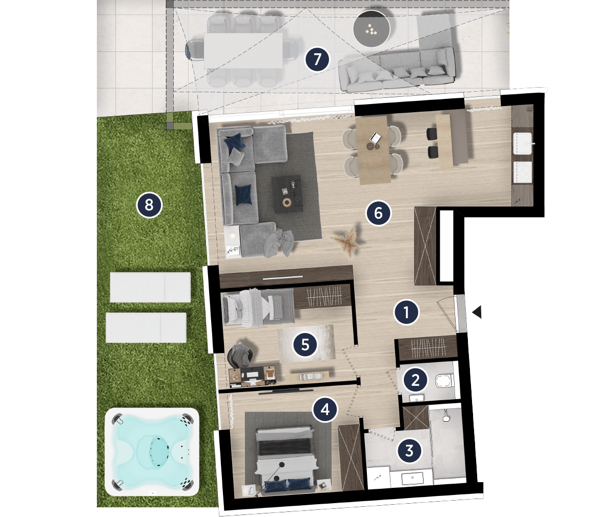 - Penthouse lakások 68 m²-es, napvitorlás vagy fedett tetőterasszal és jakuzzival