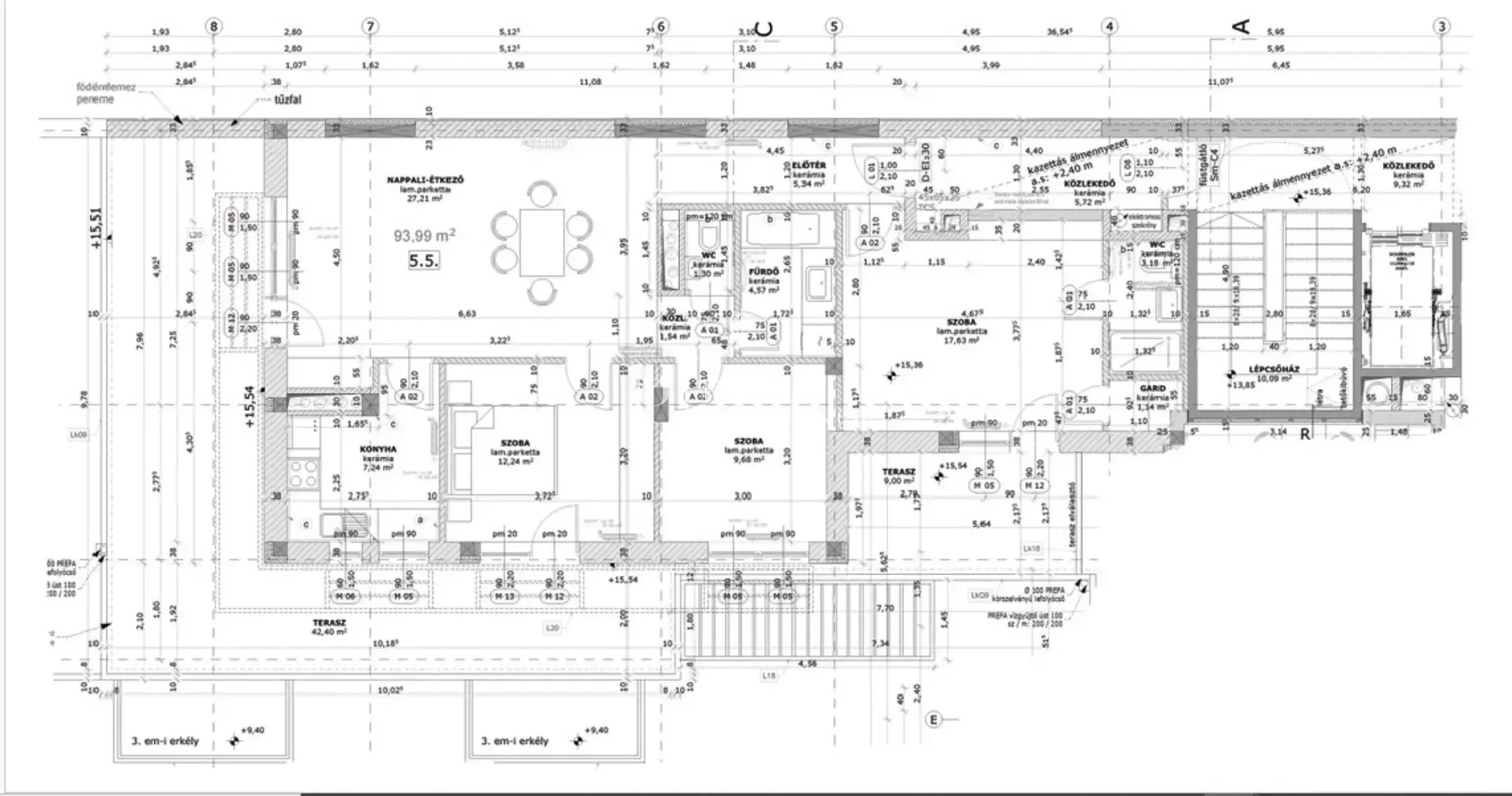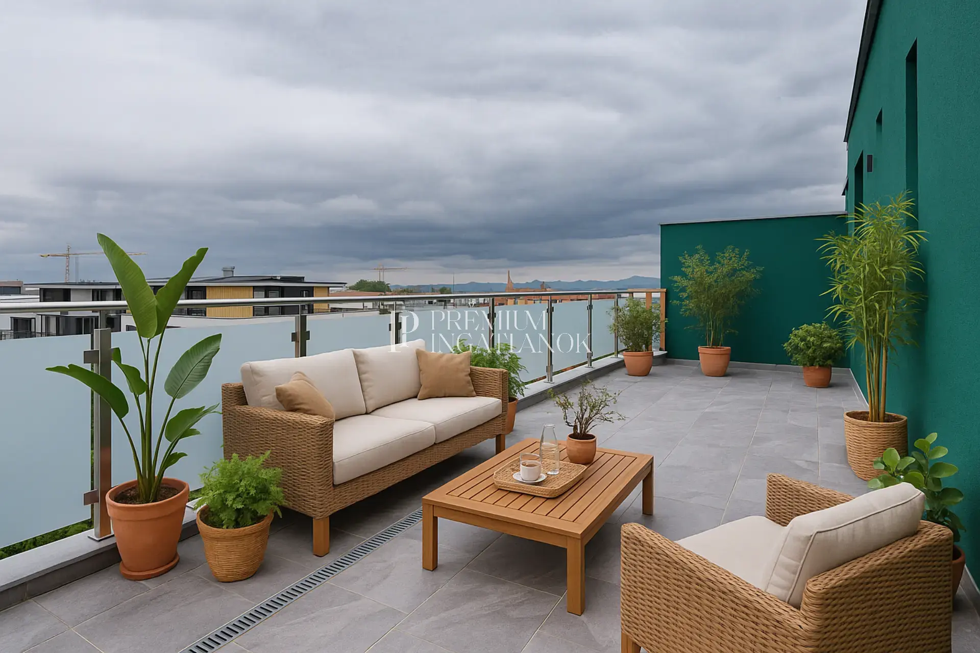 A délies tájolásnak köszönhetően az otthon egész nap világos, a közel 44 m²-es terasz pedig valódi élettérként funkcionál: reggeli kávé, esti vacsorák, pihenés – mindez zöld környezetre néző panorámával.