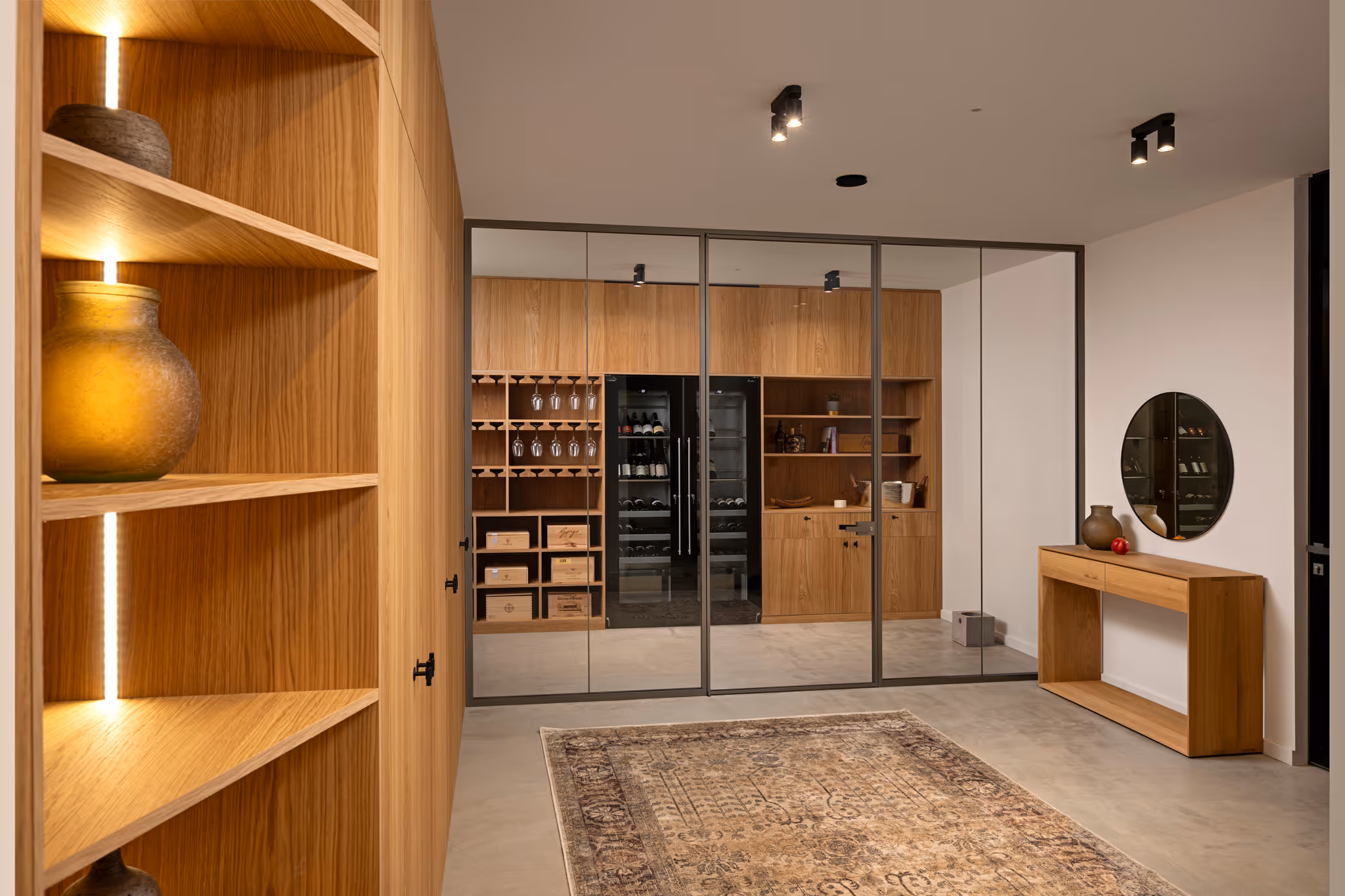 Custom wine cellar with integrated wine safe and a bespoke climate-control system capacity for approximately 300 bottles