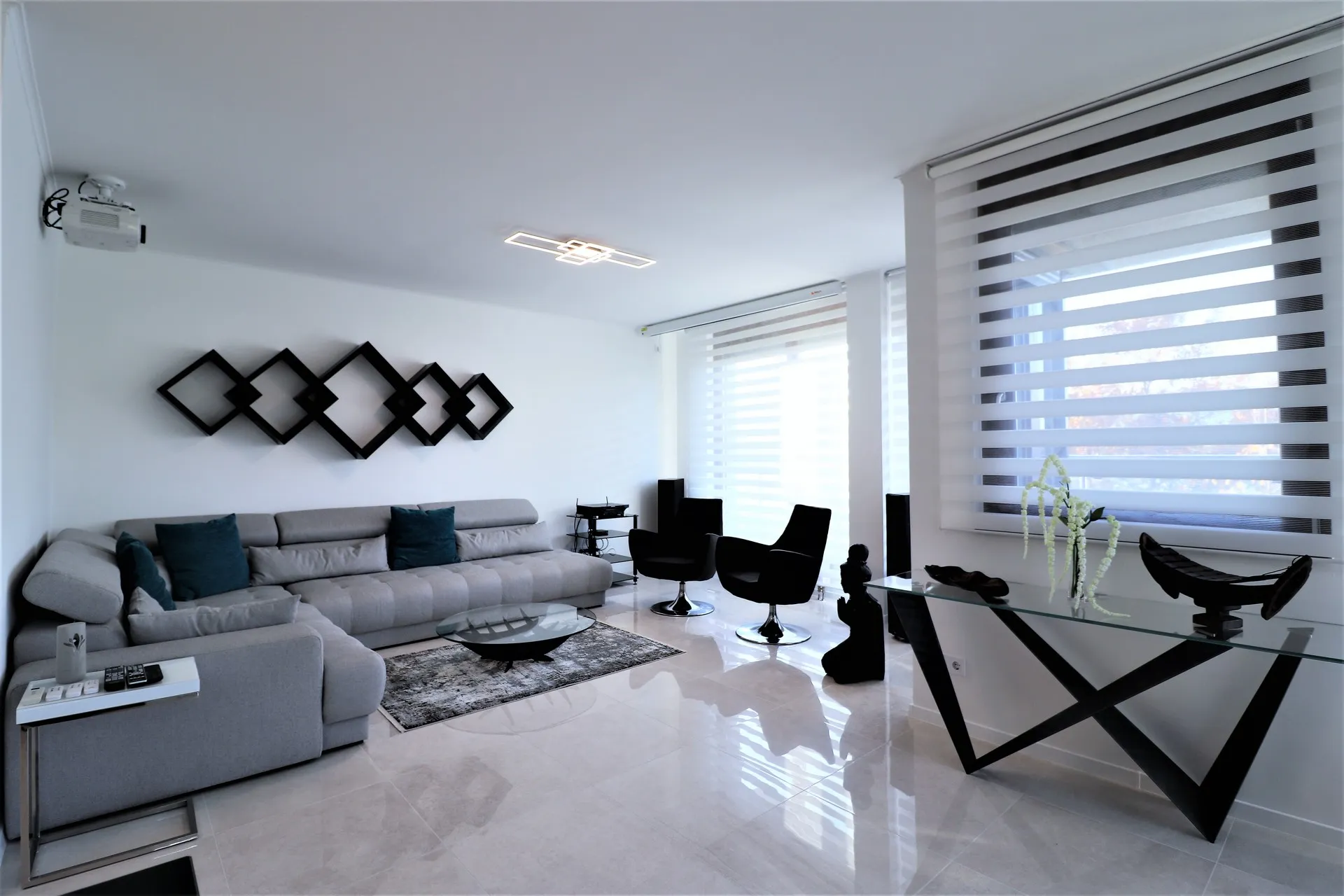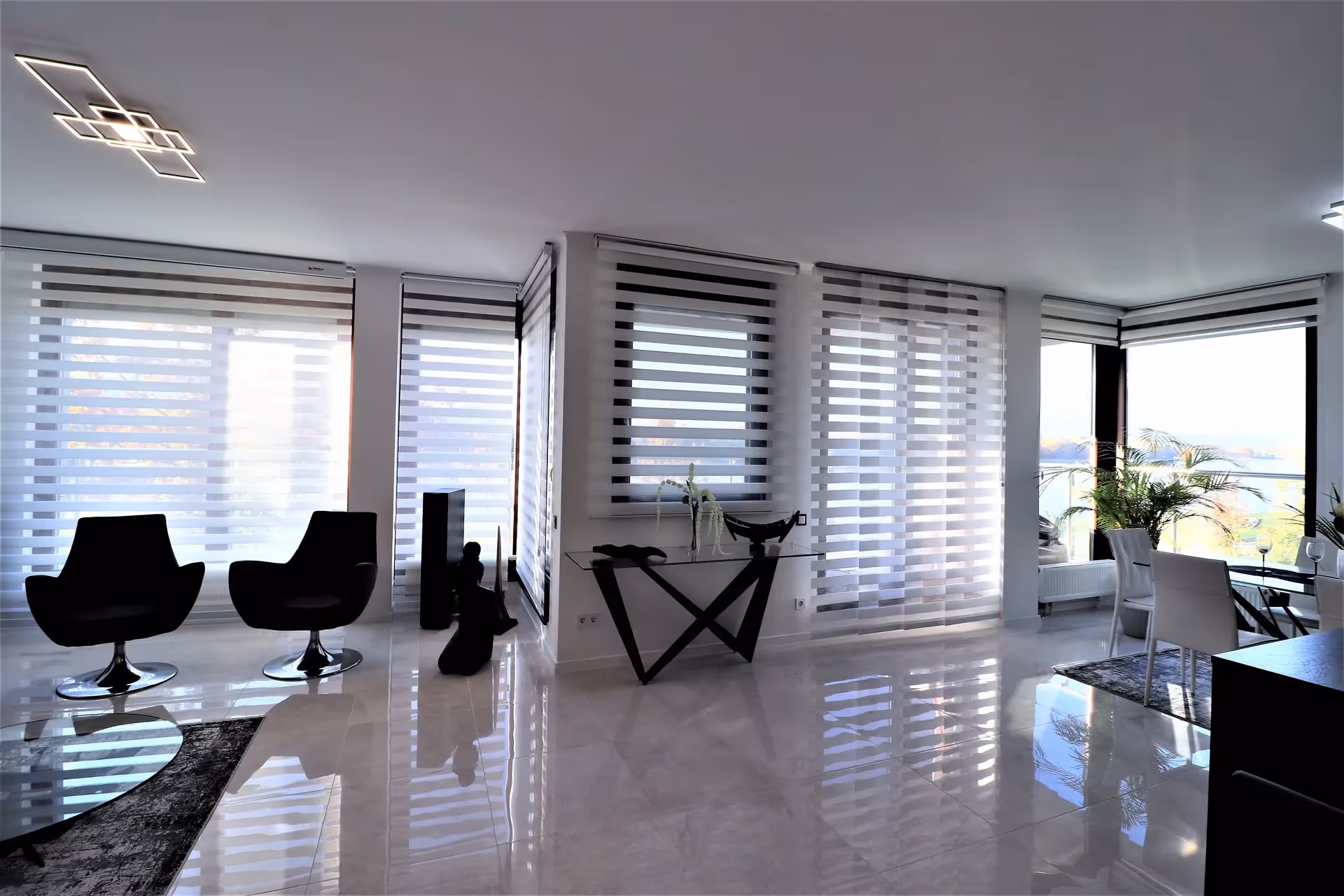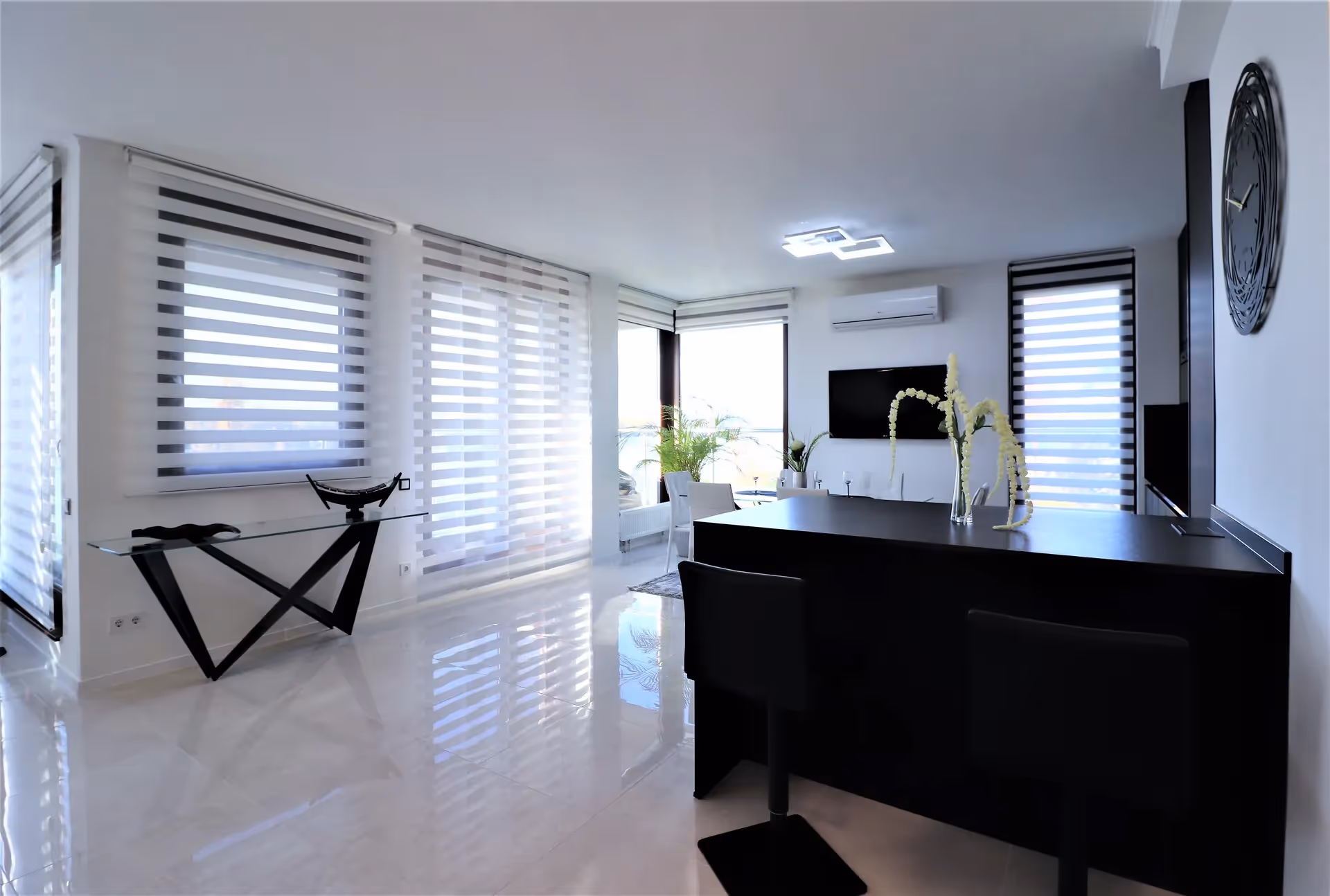 A lakás, teljes körűen, minőségi anyagokkal felújított. A padlóig érő összes ablak elektromos redőnnyel szerelt, az ajtókon szúnyogháló.A konyhabútor Nolte, német ,prémium minőségű, gépesített, a bútorok egyedi olasz dizájn, felső kategóriás, nívós, amelyeket az elegancia és az időtállóság jellemez.