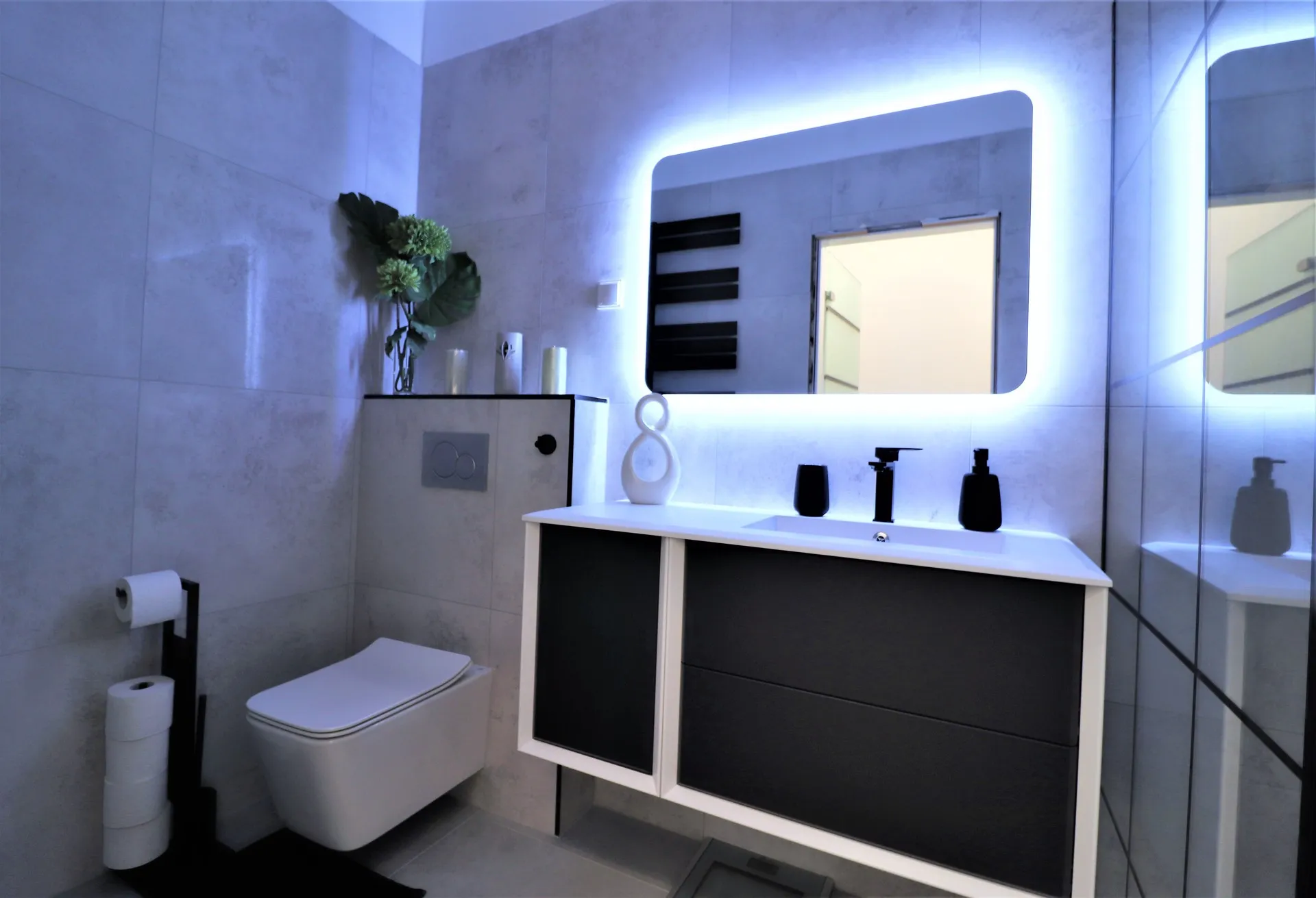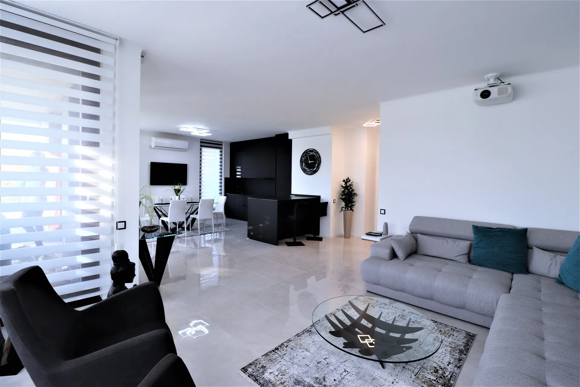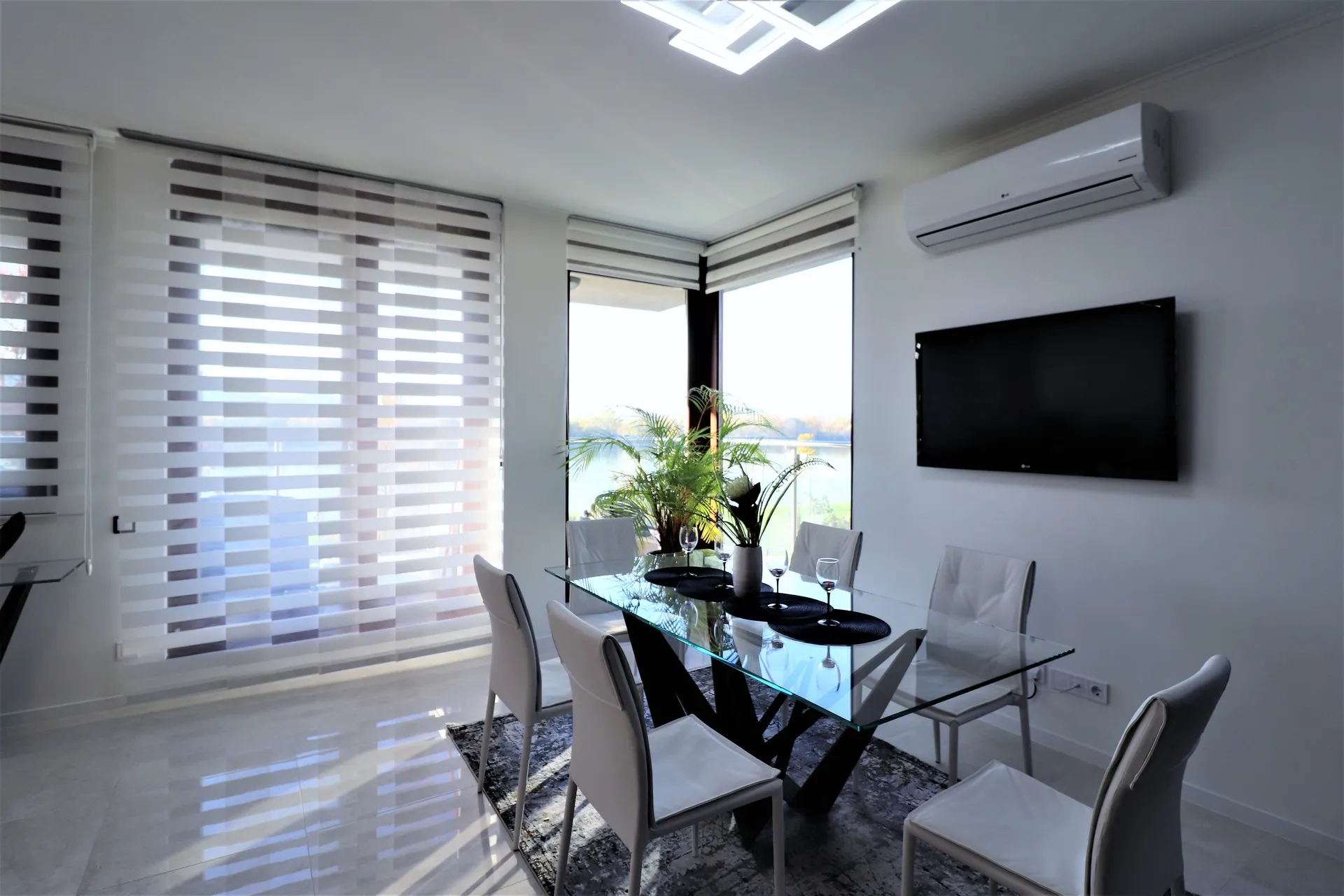 A lakás, teljes körűen, minőségi anyagokkal felújított. A padlóig érő összes ablak elektromos redőnnyel szerelt, az ajtókon szúnyogháló.A konyhabútor Nolte, német ,prémium minőségű, gépesített, a bútorok egyedi olasz dizájn, felső kategóriás, nívós, amelyeket az elegancia és az időtállóság jellemez.