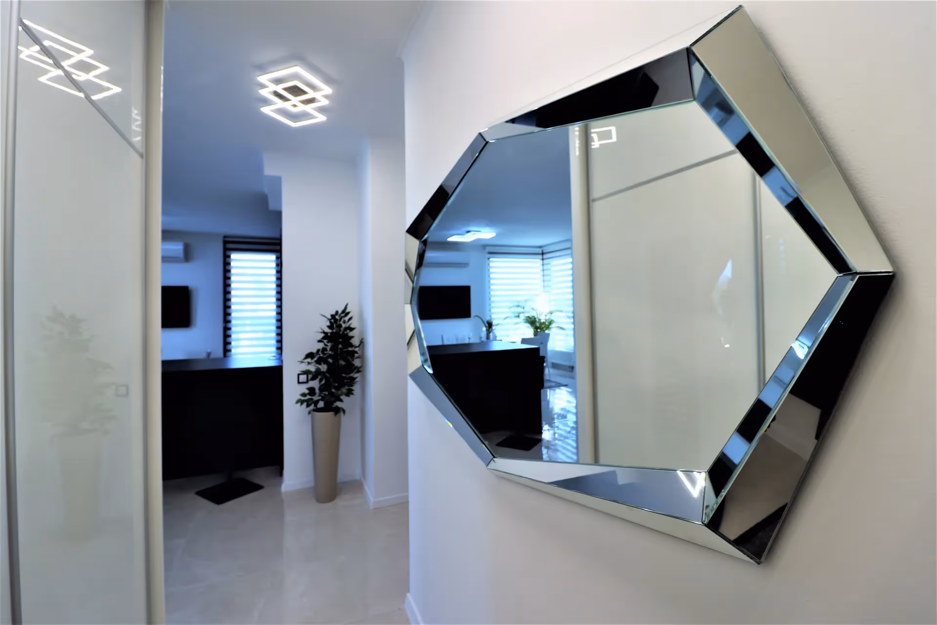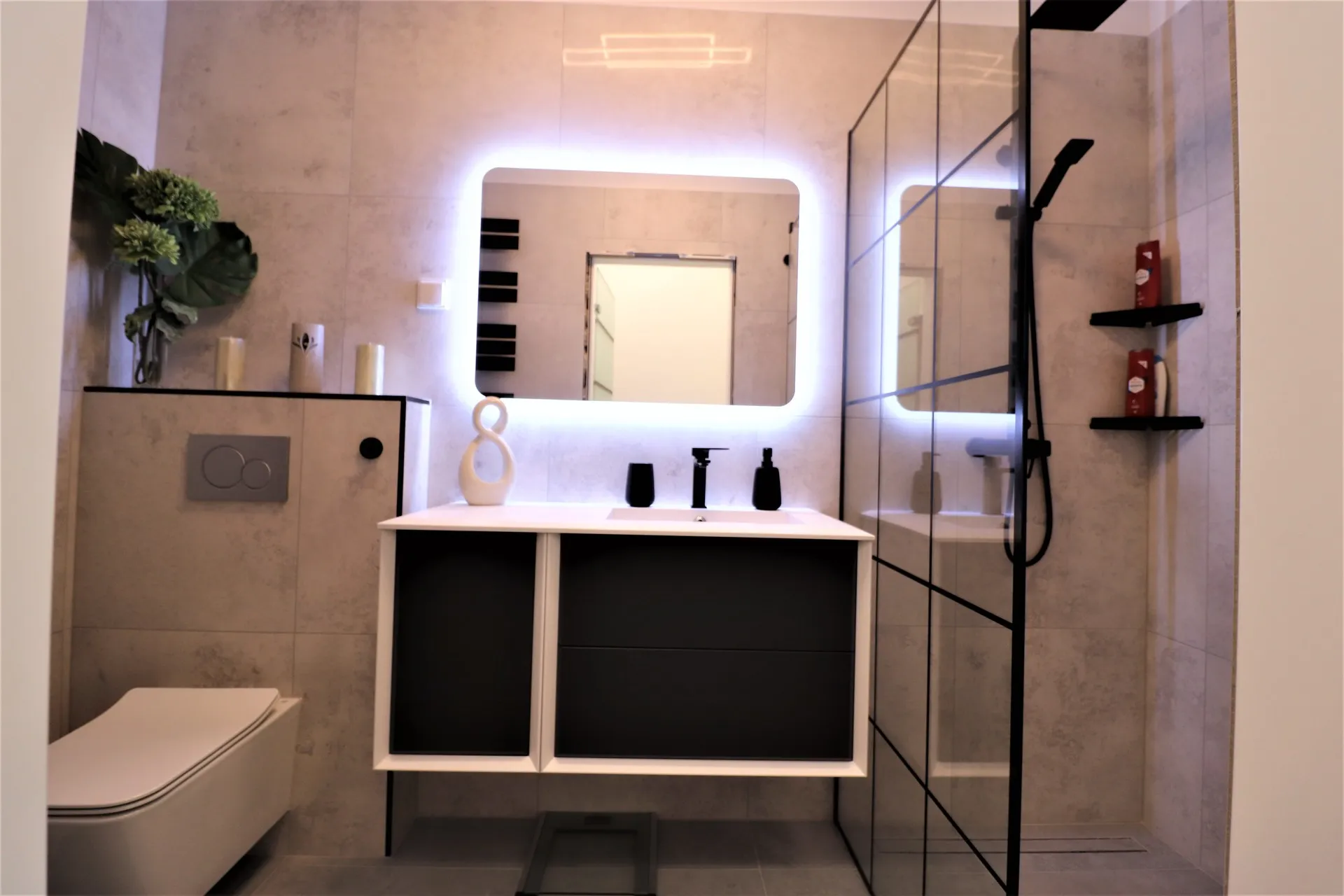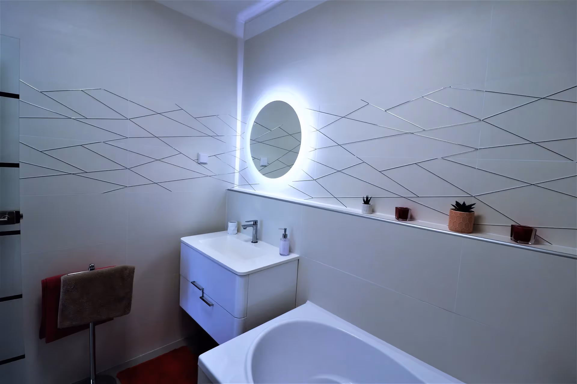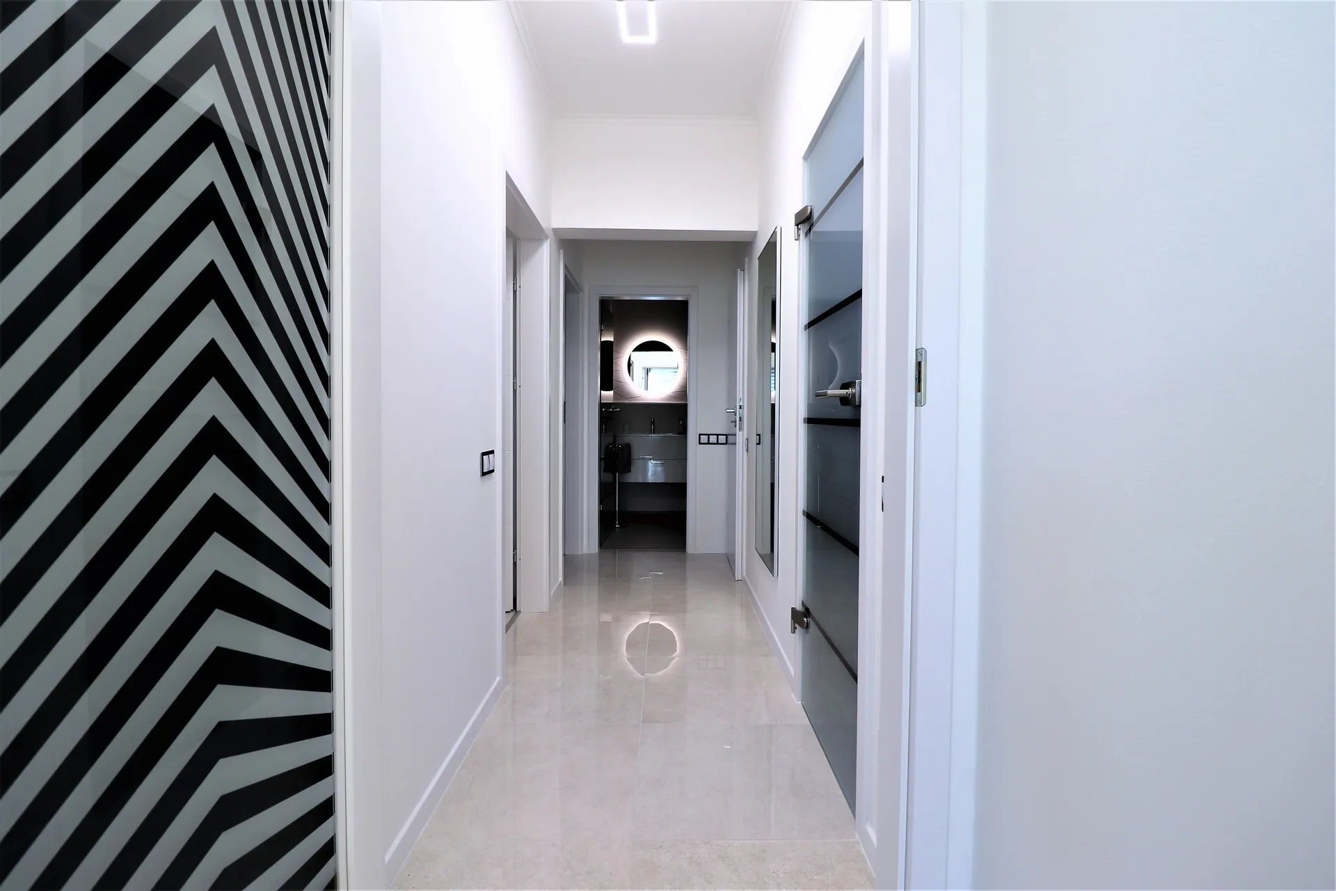 A mindent elrejtő beépített gardróbok a plafonig érnek. A burkolatok elsőrendűek, a nappali olasz Valentino padlóval burkolt.
