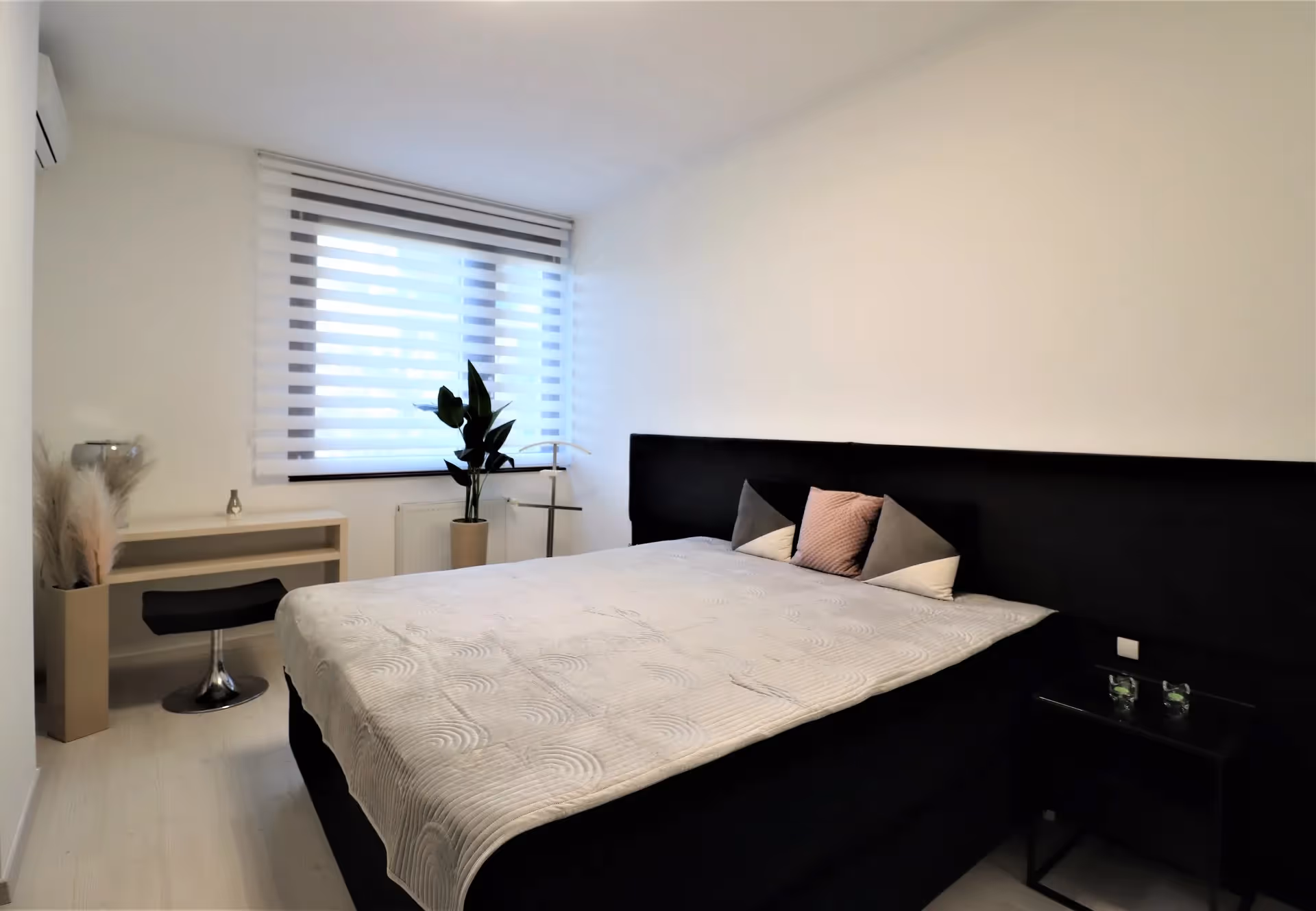 Az ingatlan liftes társasház 1. emeleten helyezkedik el, nagy méretű amerikai konyhás-nappalival terasszal, két hálószobával, két fürdőszoba toalettel, és kamra elrendezéssel.