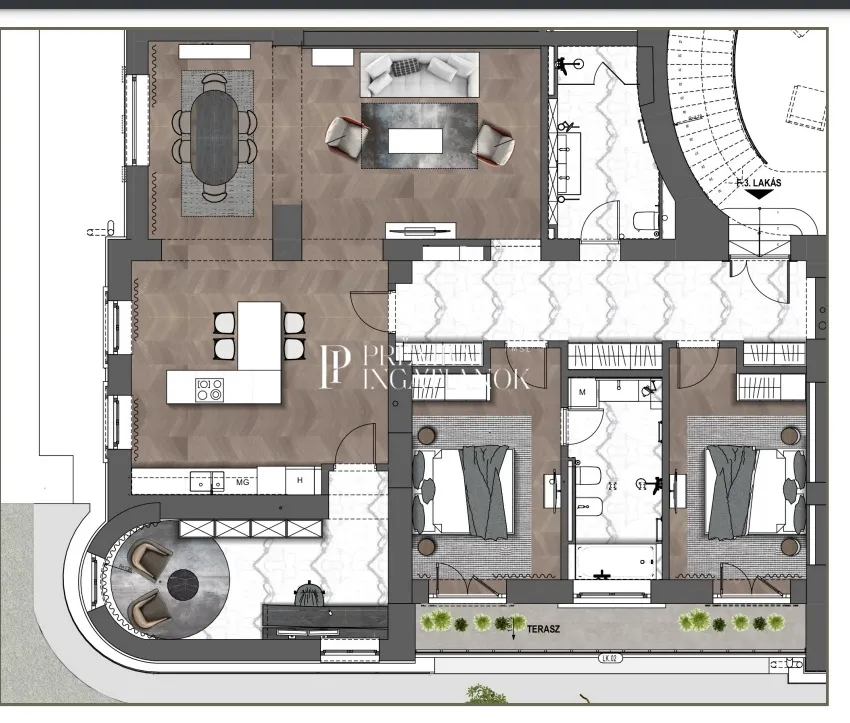 - Tágas elrendezés: 2 hálószoba + 1 dolgozószoba, amely ideális lehet akár home office kialakításához is.