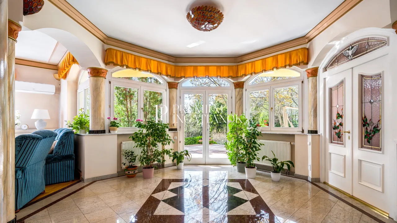 o 20 m²-es hallo 35 m²-es fedett terasz, amely a zöld kertre néz