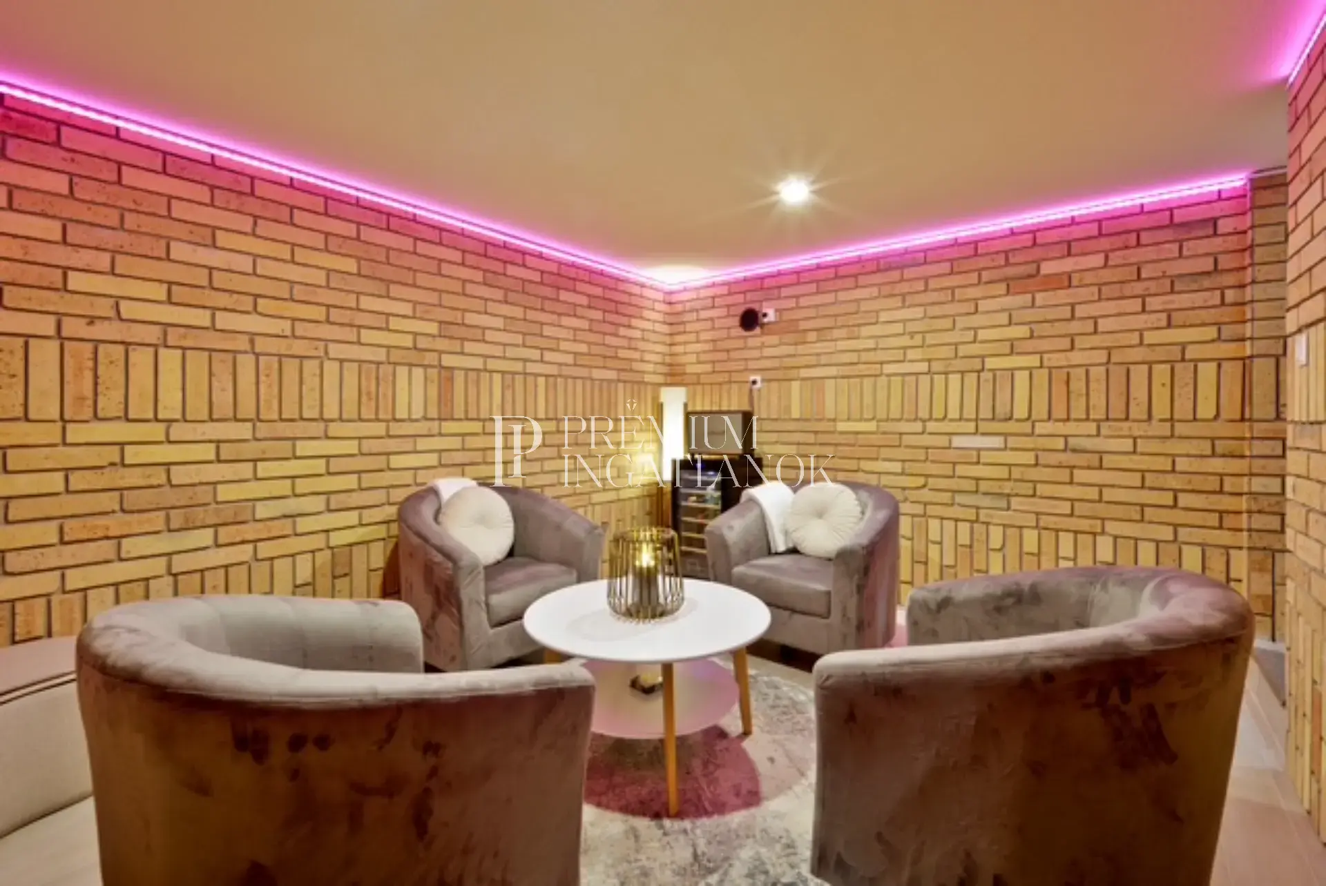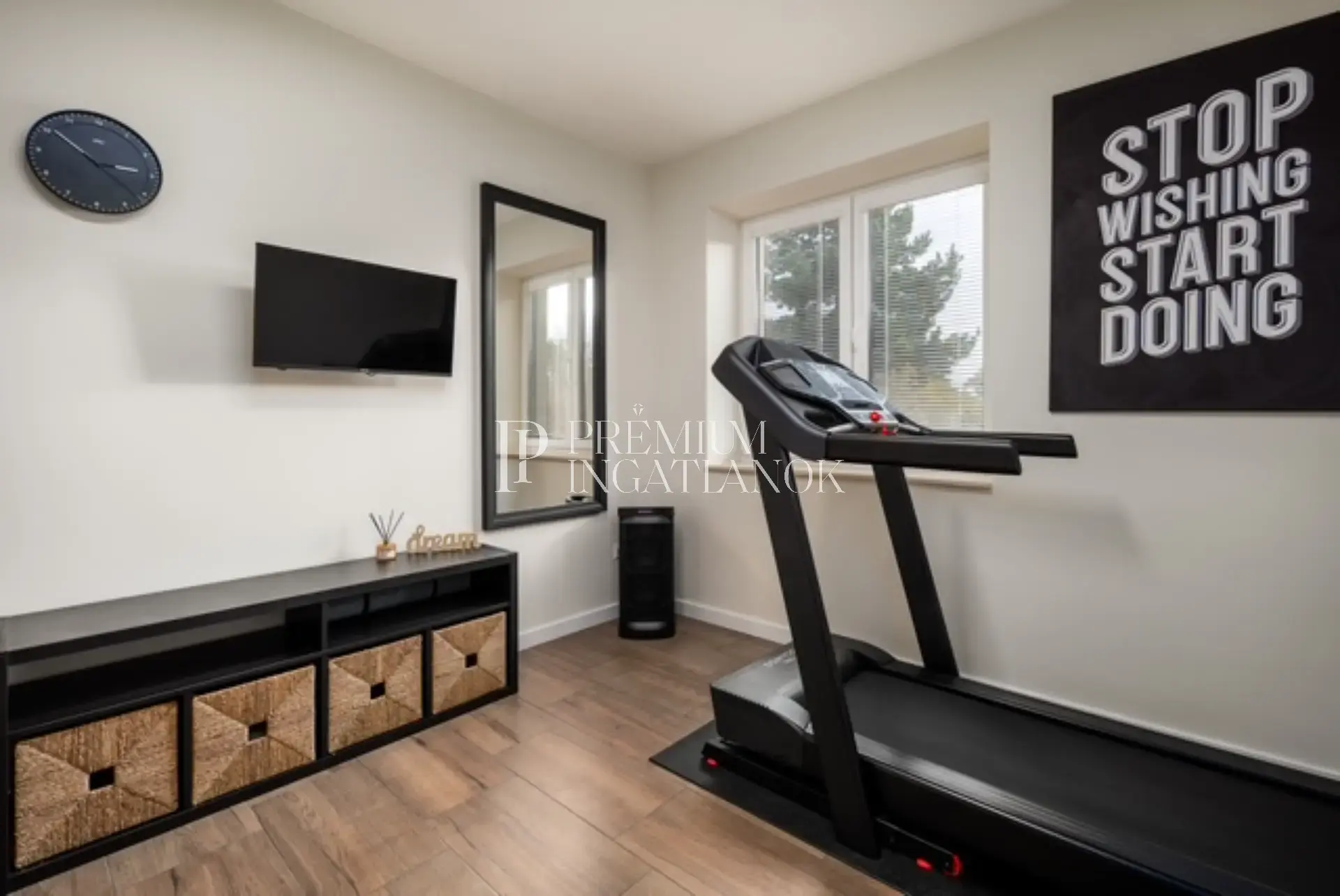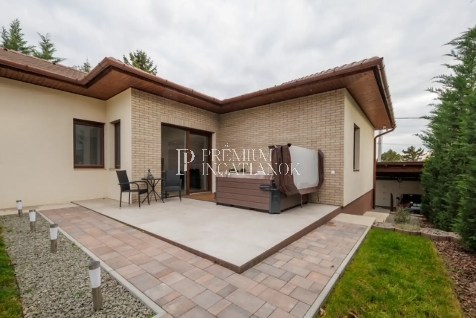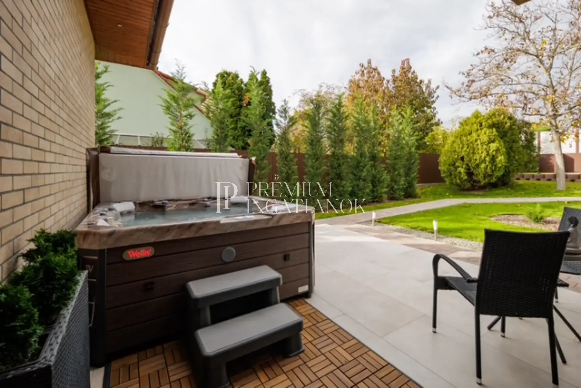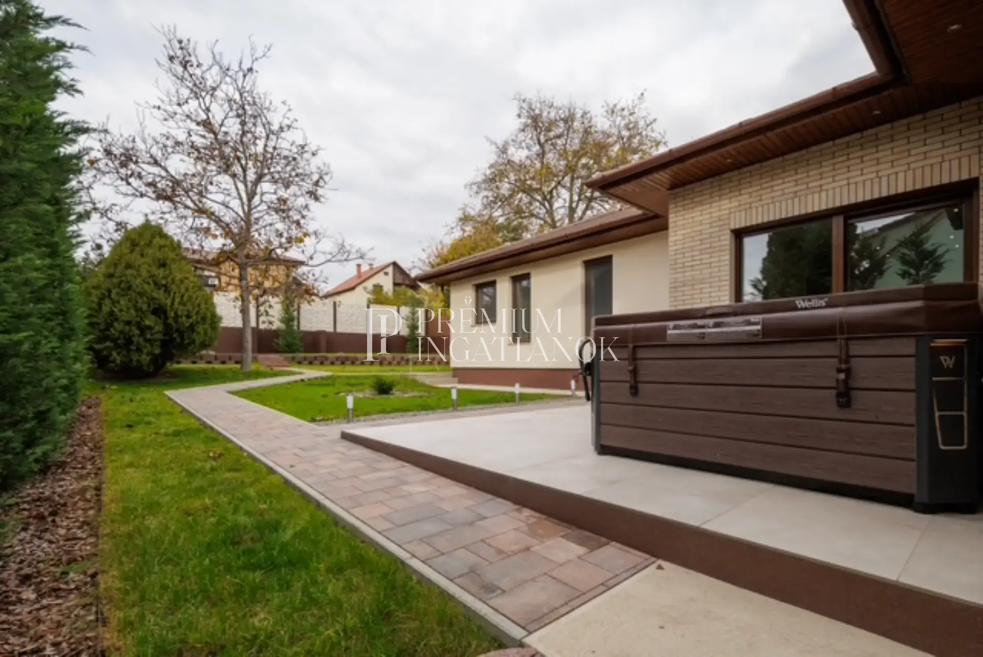 A pihenésre és feltöltődésre a ház is ad okot: egyedi tervezésű Szaunaking finn szauna, valamint egy közel 18,5 m²-es terasz, ahol egy Wellis energiatakarékos jacuzzi teszi teljessé a „hazai wellness” élményét. A gépkocsibeállás is megoldott: két férőhelyes beálló áll rendelkezésre, valamint önálló, 19 m²-es garázs is tartozik az ingatlanhoz.
