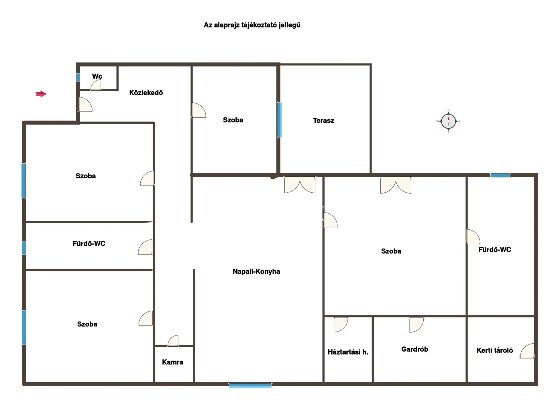 A téglaépítésű ingatlan kívül-belül „nagyon jó” állapotú, napfényes terekkel, kertre néző környezettel és egy jól használható, egyszintes alaprajzzal. A belső kialakítás kifejezetten praktikus: amerikai konyhás nappali, összesen 5 szoba, két fürdőszoba, vendégmosdó, mosószoba, kamra, valamint egy hangulatos borospince is helyet kapott. A hálószoba saját fürdővel és nagy gardróbbal biztosít privát, hotelszintű kényelmet.