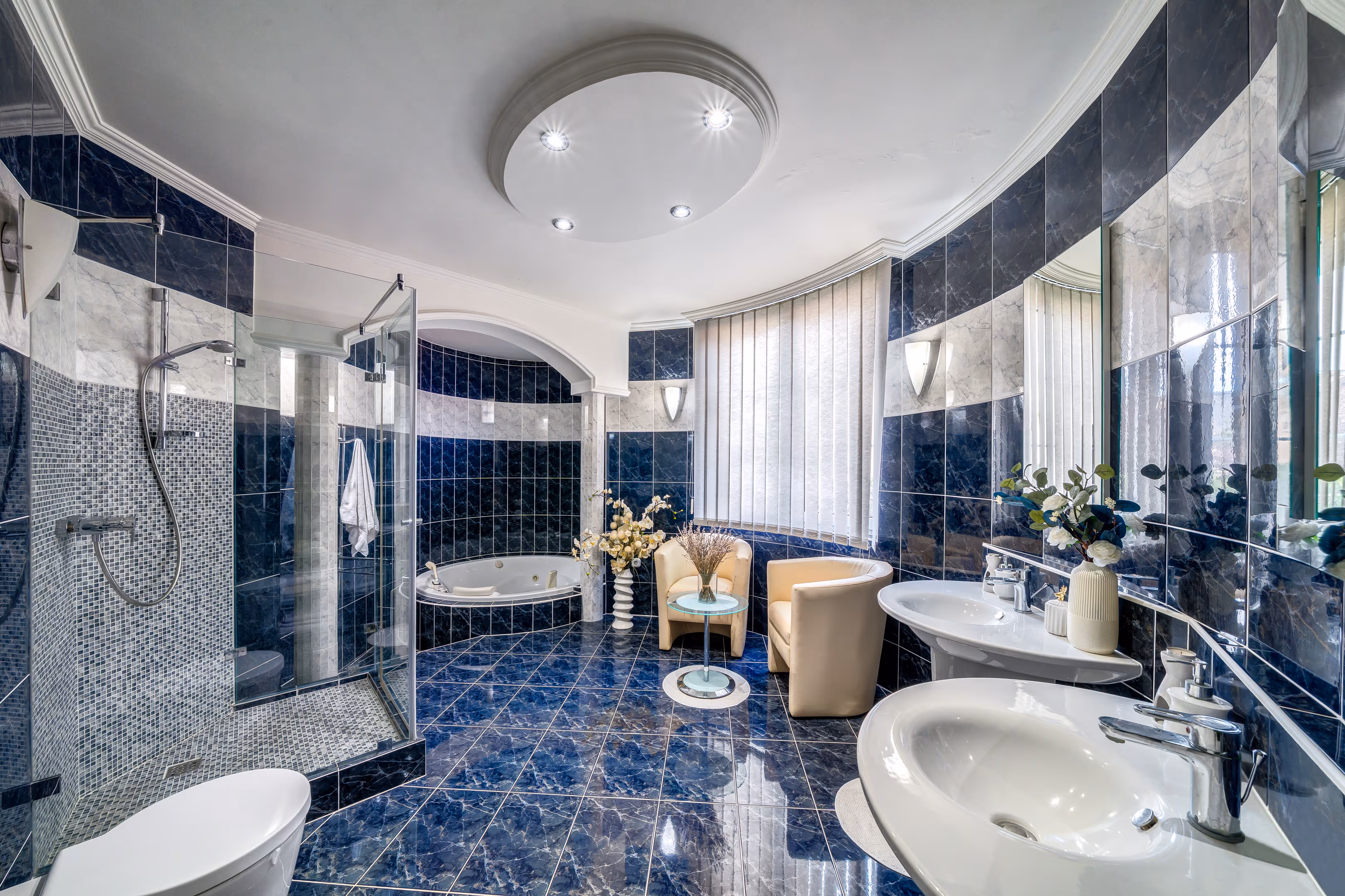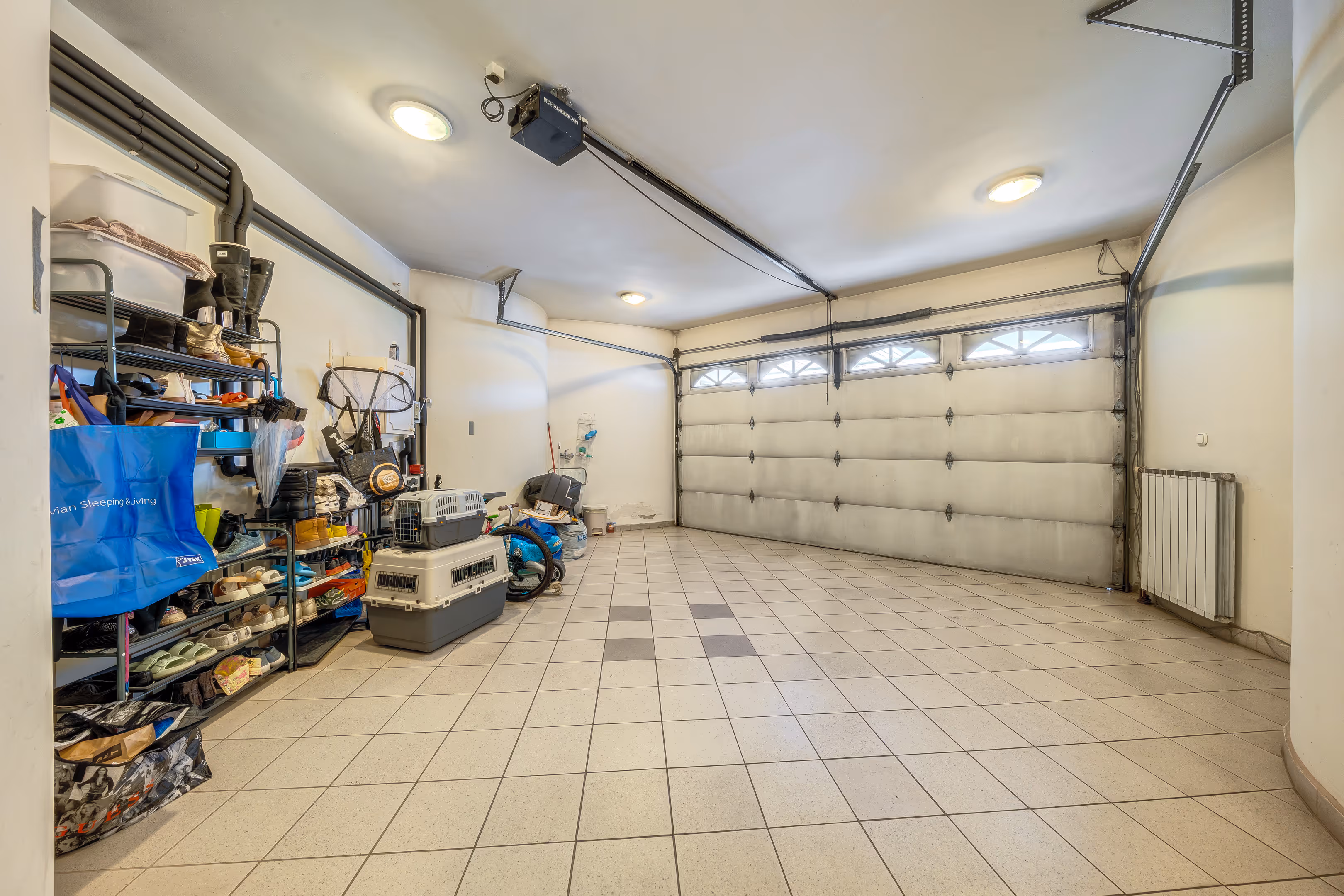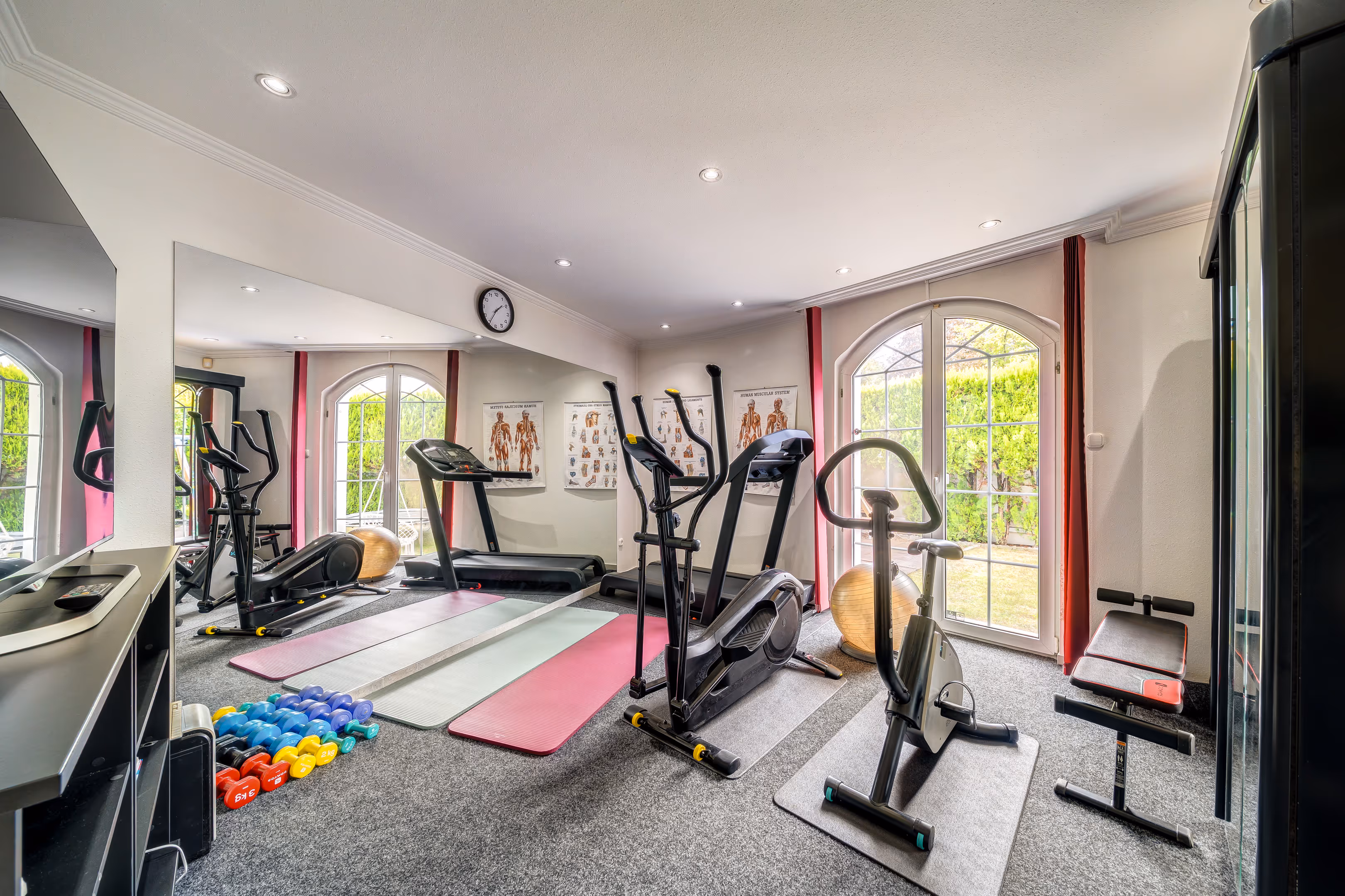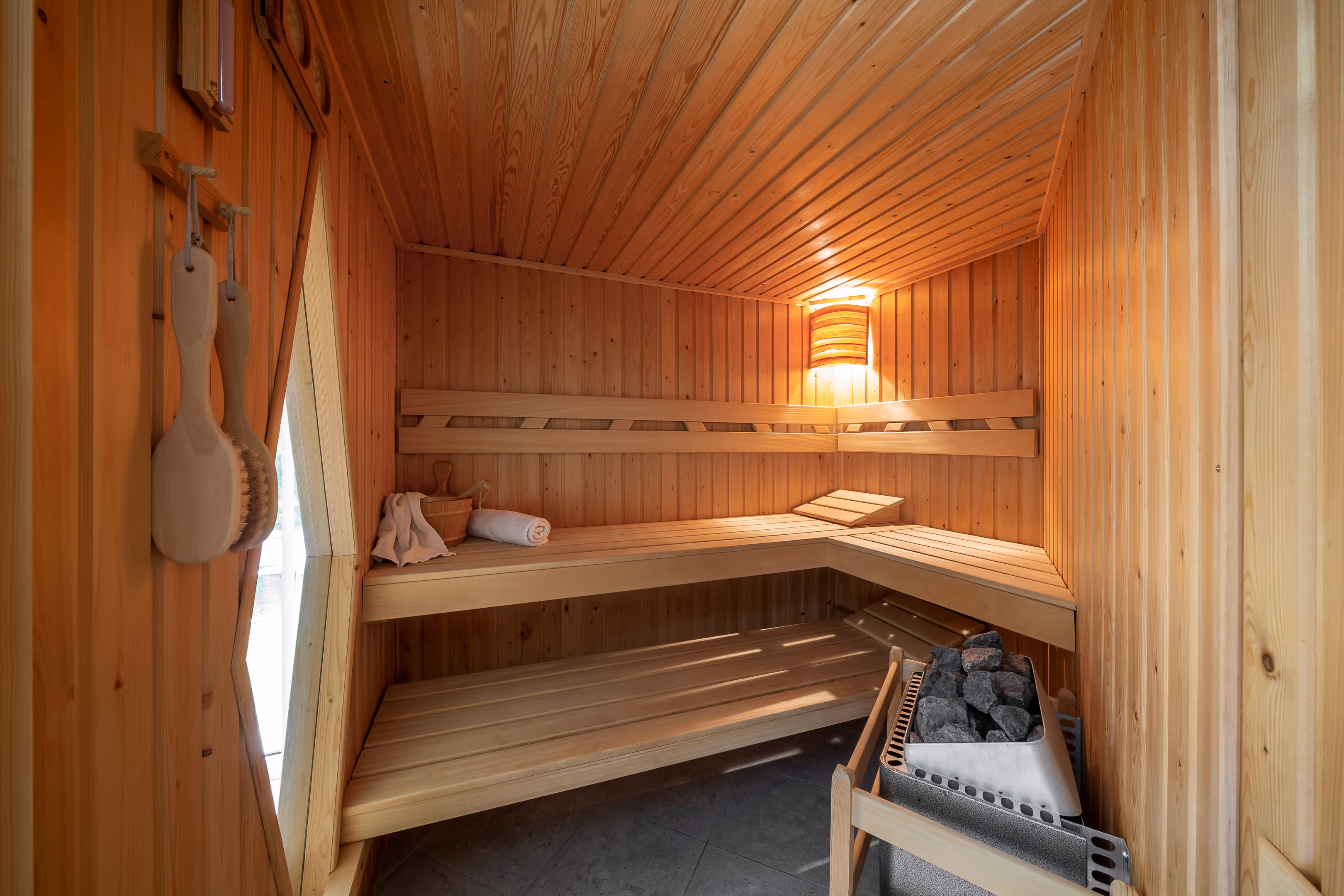 A ház belső elrendezése átgondolt és elegáns. A földszinten gránitburkolat, fa és fabrikett lehetőségű tüzelésű kandallóval díszített nappali, gépesített, kőpultos konyha, étkező, edzőterem, szauna, jacuzzi szoba, valamint egy nagyméretű, kétállásos garázs található.Az emeleti szinten több hálószoba és egy tágas fürdőszoba kapott helyet, míg az alacsonyabb belmagasságú részek gardróbként funkcionálnak. A belmagasság 2,4 - 2,6 méter. A pince szinten került kialakításra a gépészeti részleg, hobbiszoba, valamint a medence és a ház energiaellátását biztosító berendezések.