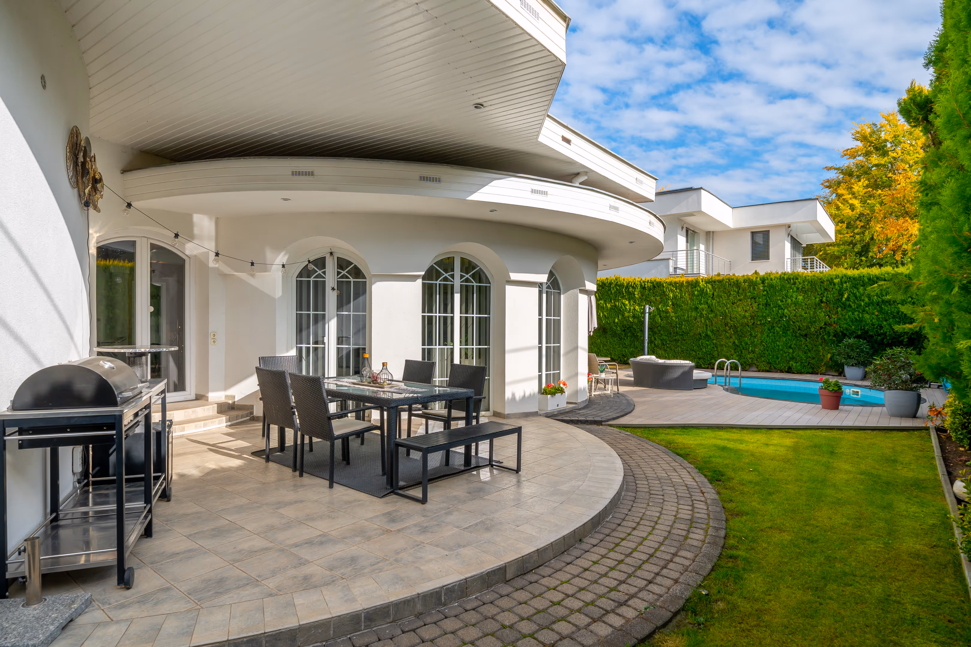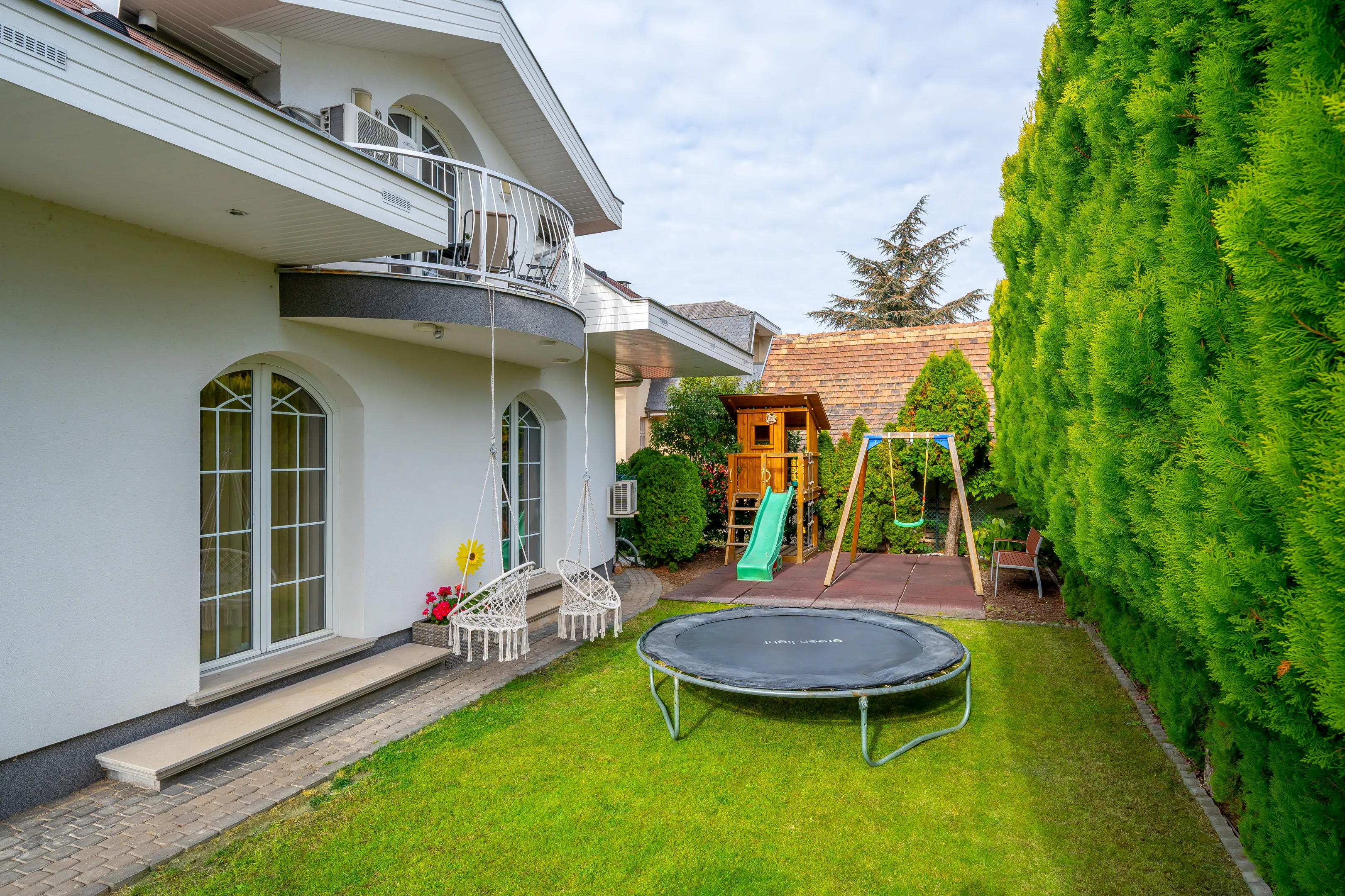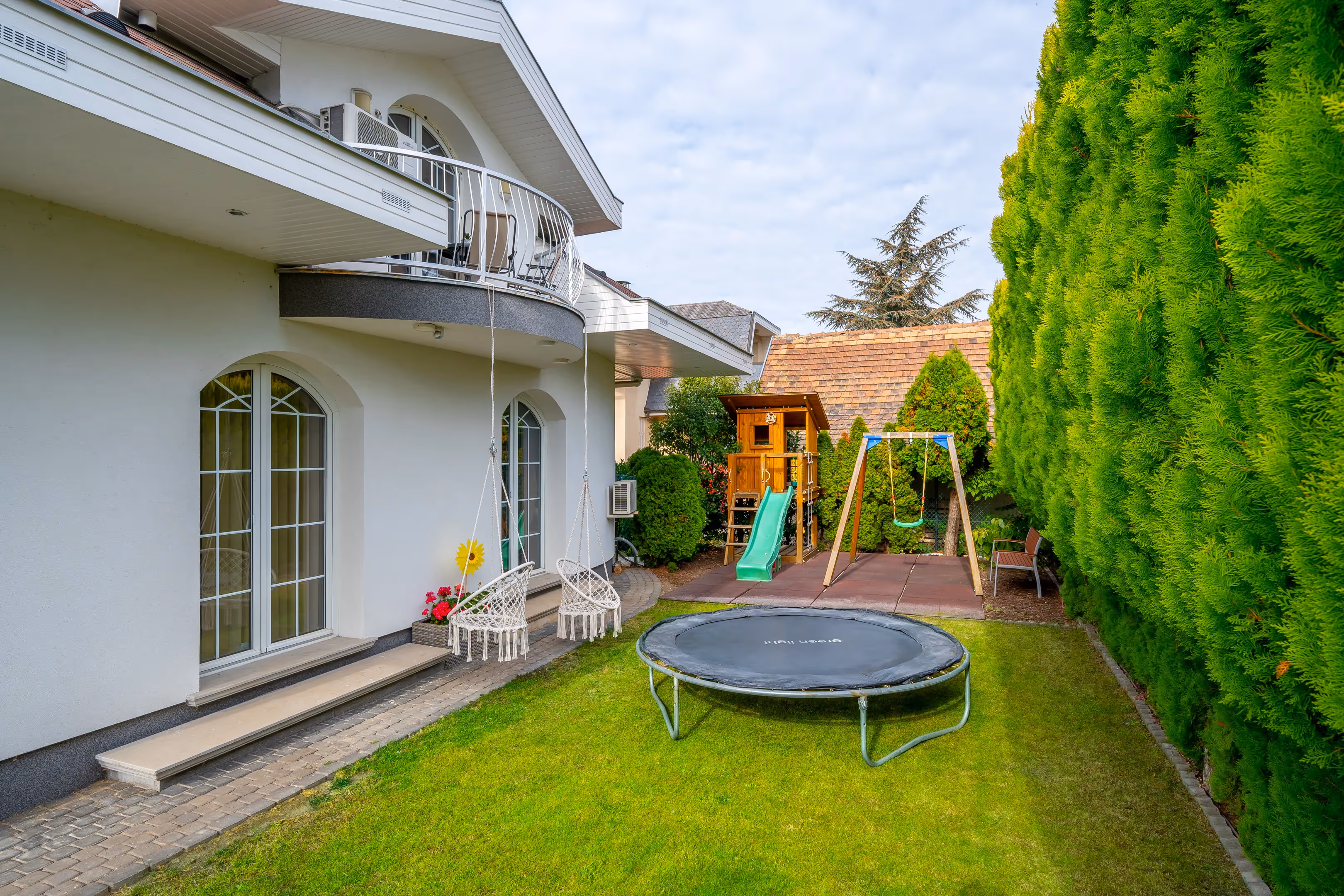 Az ingatlan egy 727 m²-es, saroktelken helyezkedik el, 488 m²-es alapterületű, háromszintes családi ház, amely 1996-ban épült. A gondosan karbantartott, parkosított kert öntözését hat zónás automata öntözőrendszer biztosítja, a pihenést pedig egy kb. 10 m³-es medence teszi teljessé. A ház külső homlokzata és kerítése 2023-ban új festést kapott, így kifogástalan állapotban van.