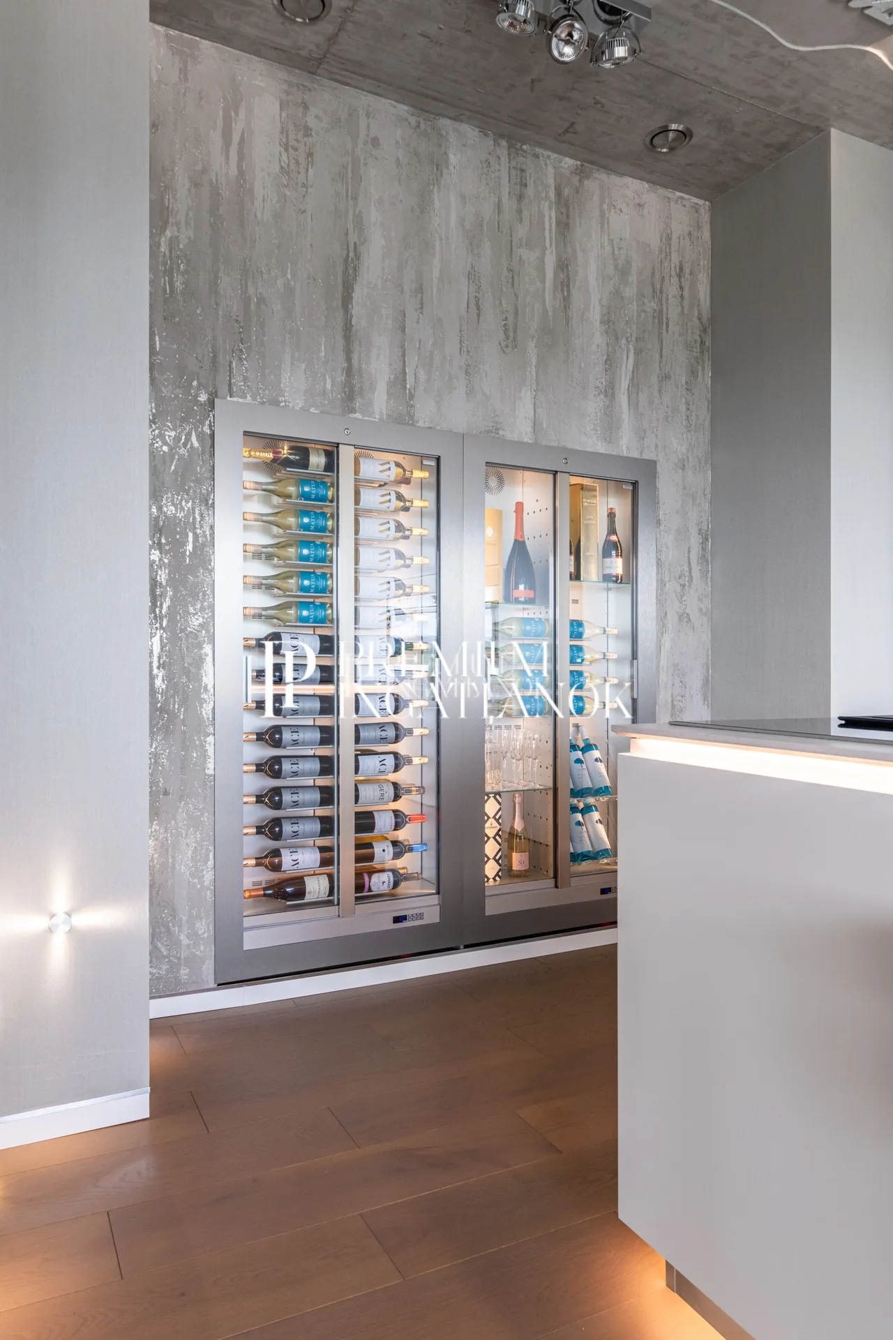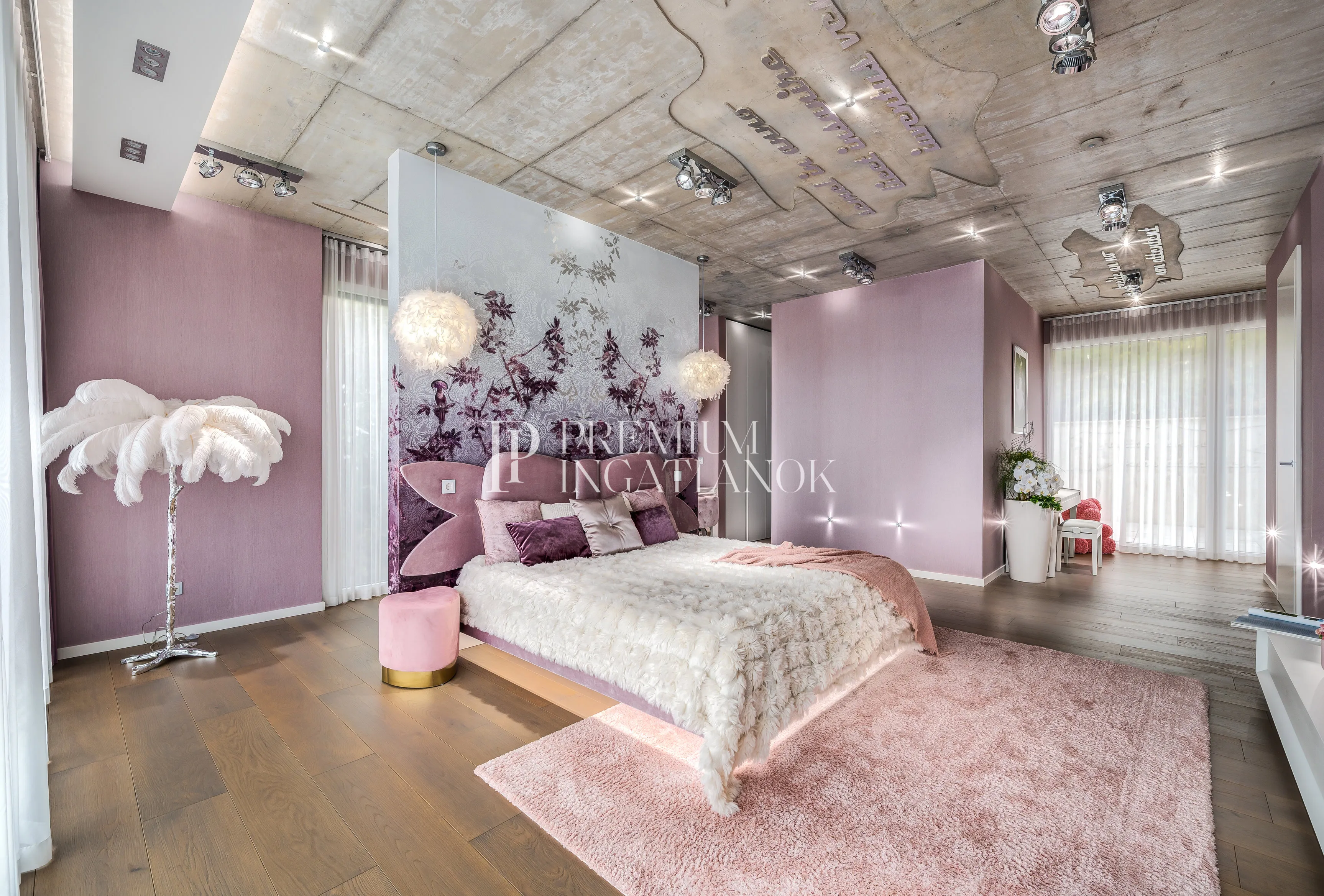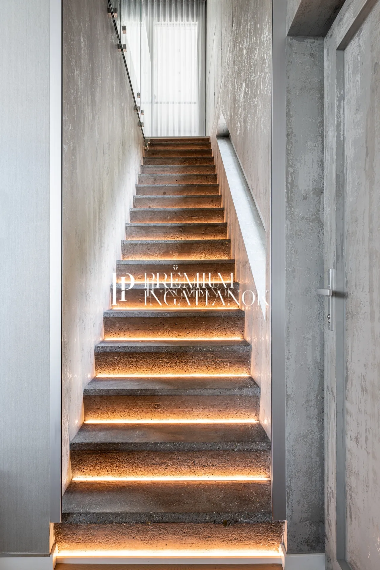 Az extra nagy belmagasságú terek, a különleges látszóbeton mennyezet, designer falfelületek és extra világítástechnikai megoldások elegáns és modern megjelenést kölcsönöznek a villának. A nemes és luxus anyagokból berendezett enteriőrök pedig kényelmet és stílust adnak az itt lakóknak.