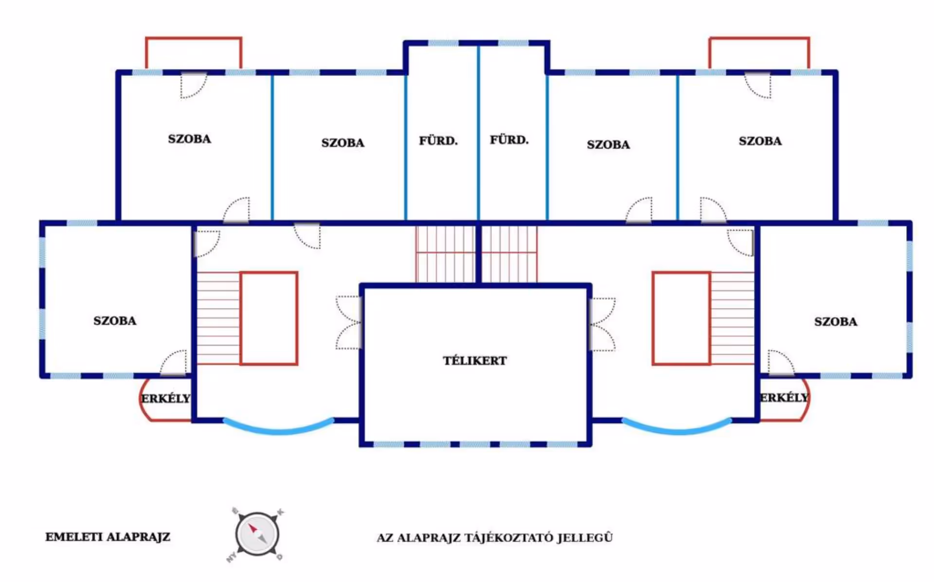 Az impresszív DNY fekvésű műemlék épület szimmetrikusan két szárnyból áll 4 szinten, majd az 5. emeleti padlástérből lehet kijutni a varázslatos tetőteraszra, ahonnan a fák teteje felett belátható a környék. Az emeleteket az eredeti, már helyreállított díszes tölgyfalépcsők kötik össze. A közös előtérből egy-egy még ma is jól helyreállítható díszes tölgyfalépcsőn át közelíthetők meg a különálló télikerttel, teraszokkal és erkélyekkel rendelkező épületszárnyak. Noha a lakrészek elkülönülnek, az emelet középtengelyében található nagyméretű közös veranda mindkét oldalról egyaránt megközelíthető.