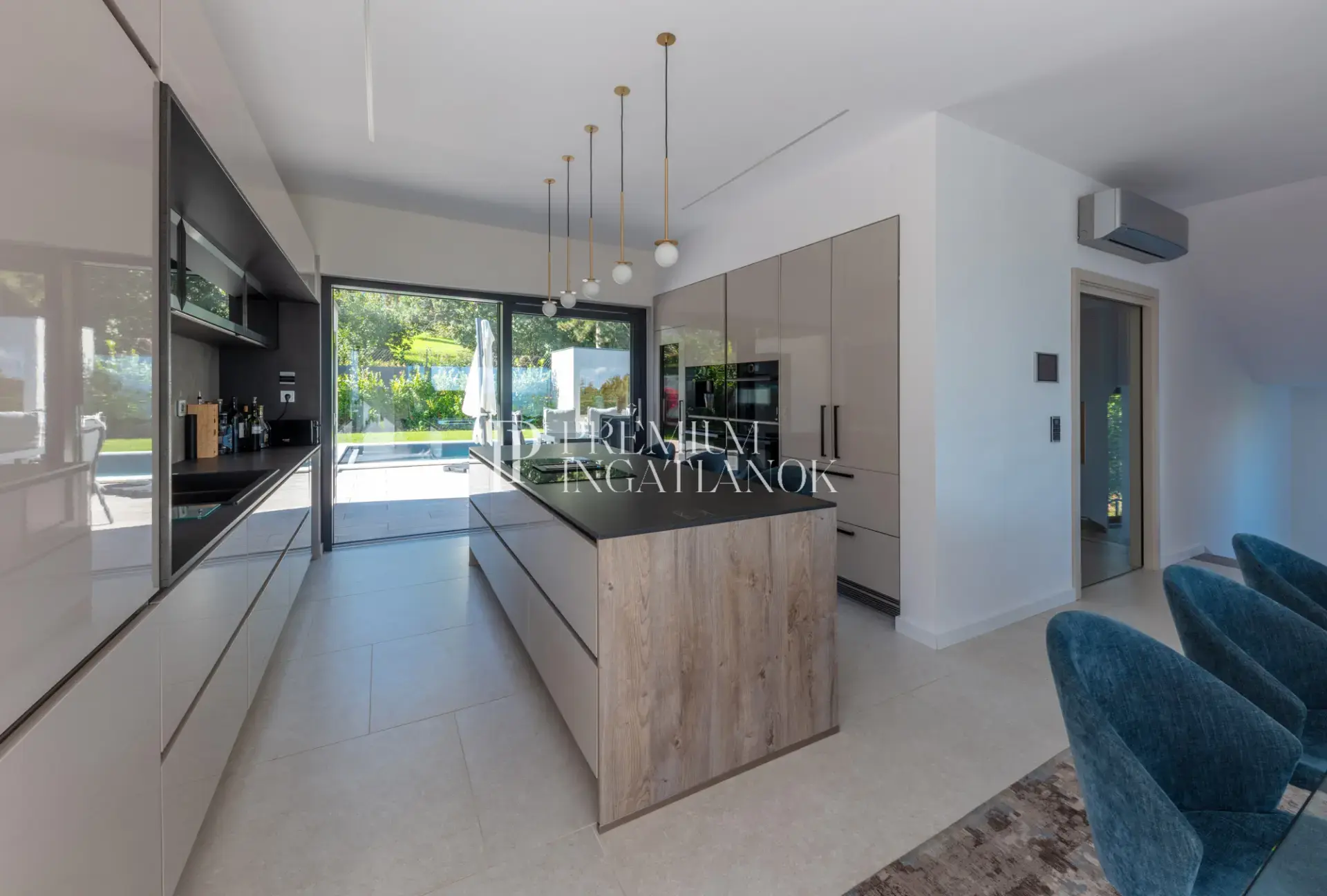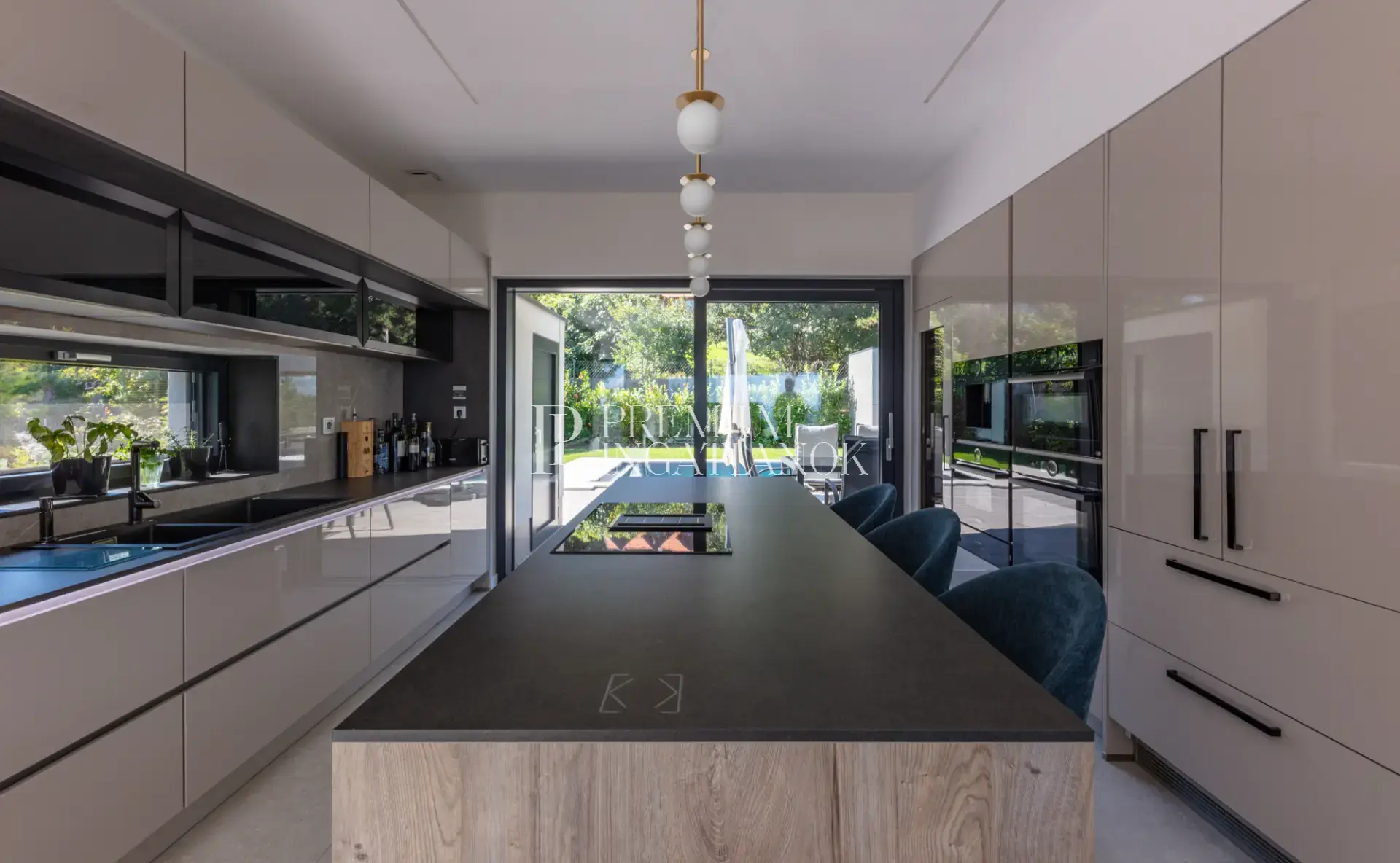 A 180 m²-nyi terasz körbeöleli a házat – a kültéri és beltéri terek szinte észrevétlenül kapcsolódnak össze. Az örökpanoráma minden helyiségből lenyűgöző.