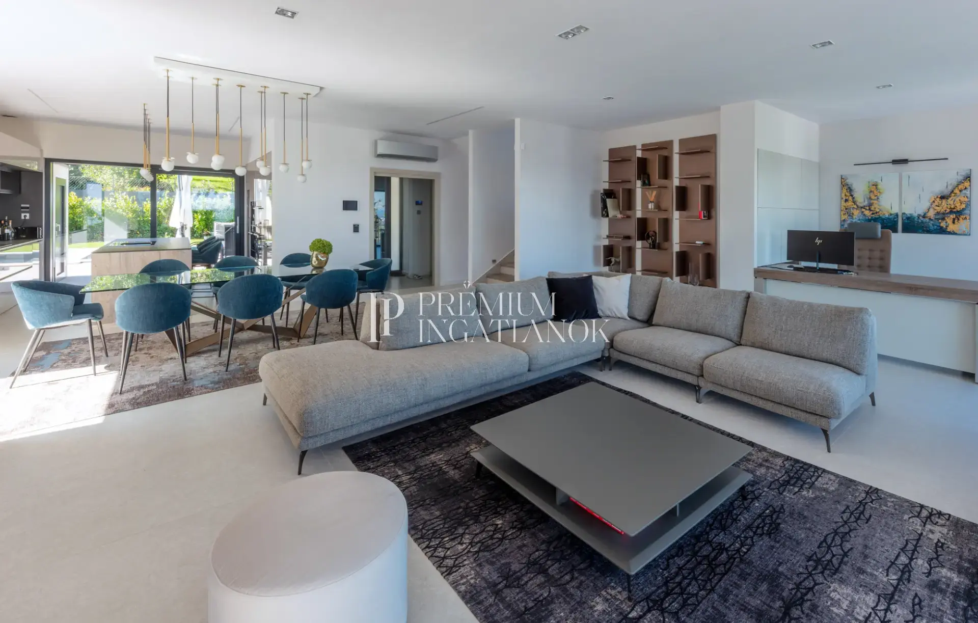 A 937 m²-es, parkosított telken elhelyezkedő, 325 m² hasznos alapterületű otthon négy tágas hálószobát, három luxusminőségű fürdőszobát, gardróbokat, valamint egy látványos nappali-konyha-étkező teret kínál, ahol a dolgozósarok és vendégmosdó is külön helyet kapott.