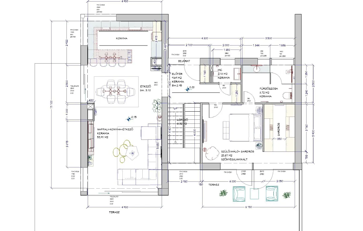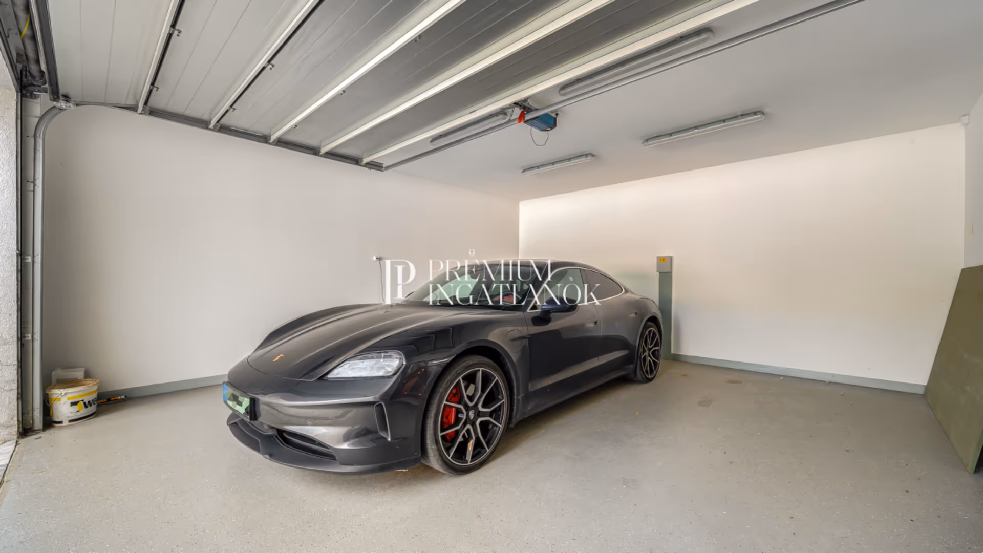 • Alsó szint: 2 állásos garázs elektromos töltő kiállással, hatalmas moziszoba vagy szabadidőszoba, tárolók és gépészeti helyiségek.