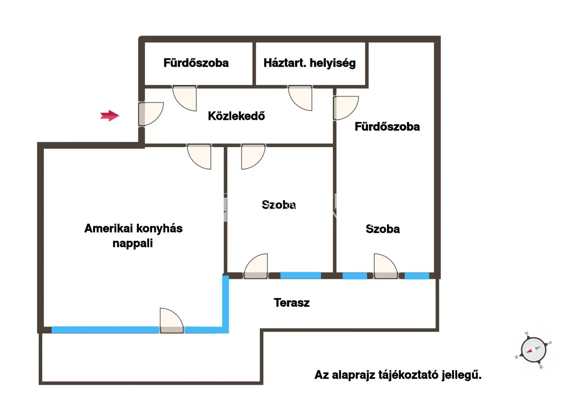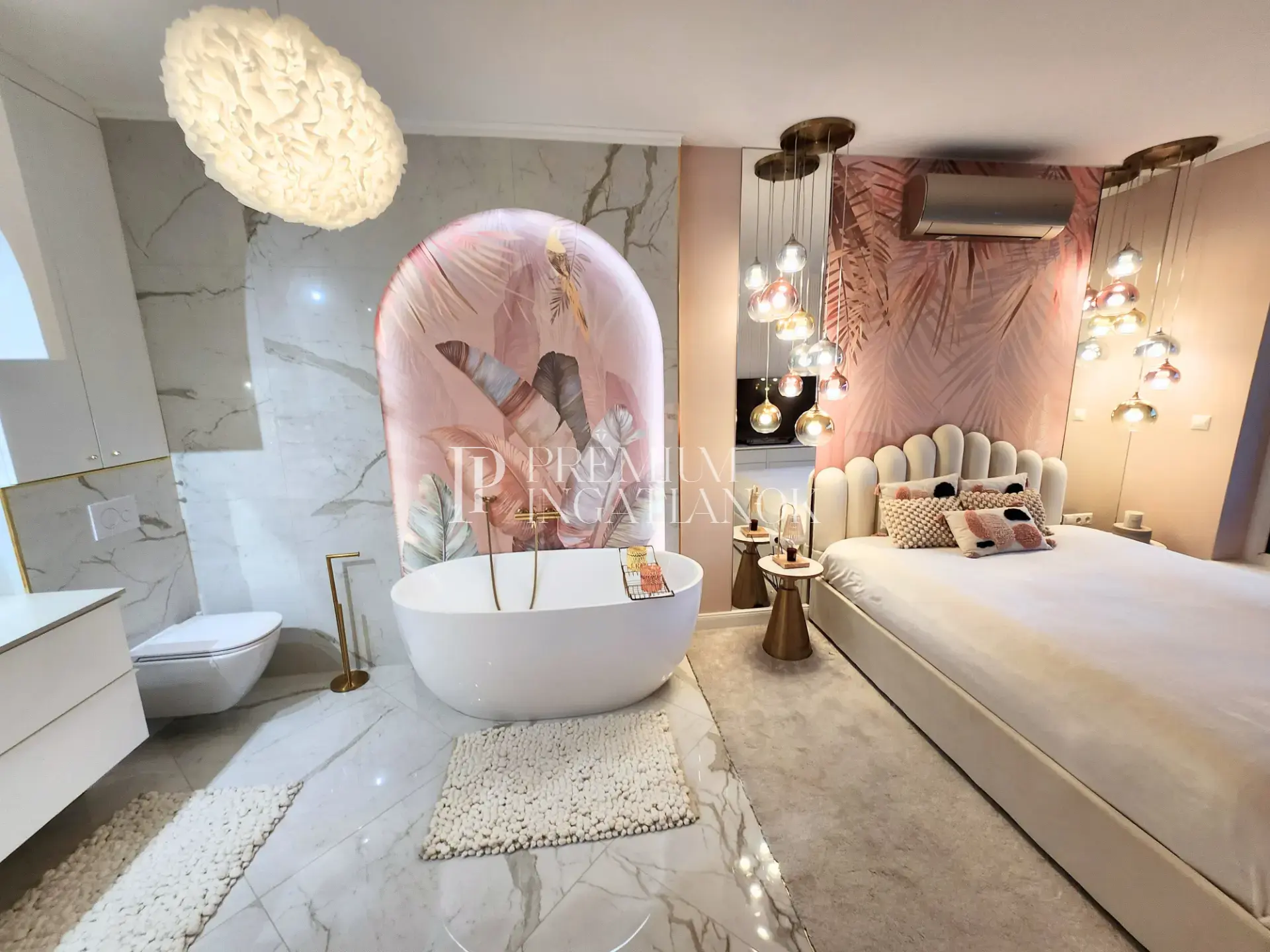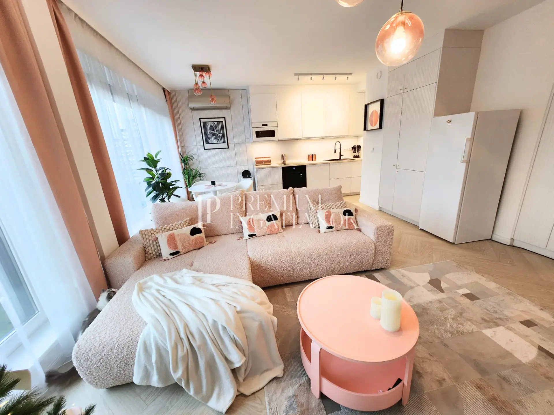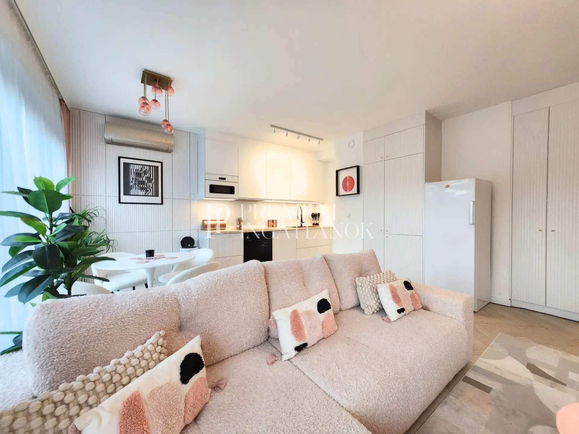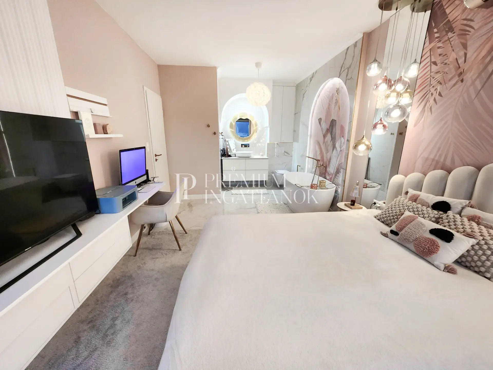 A praktikus elrendezés része két jól szeparált hálószoba, valamint egy tágas, amerikai konyhás nappali. A két fürdőszoba közül az egyik közvetlenül kapcsolódik a master bedroomhoz, megteremtve a kényelmes, prémium otthoni élményt. A lakás továbbá egy külön gardróbhelyiséget is kínál, amely még rendezettebb és kényelmesebb mindennapokat biztosít.