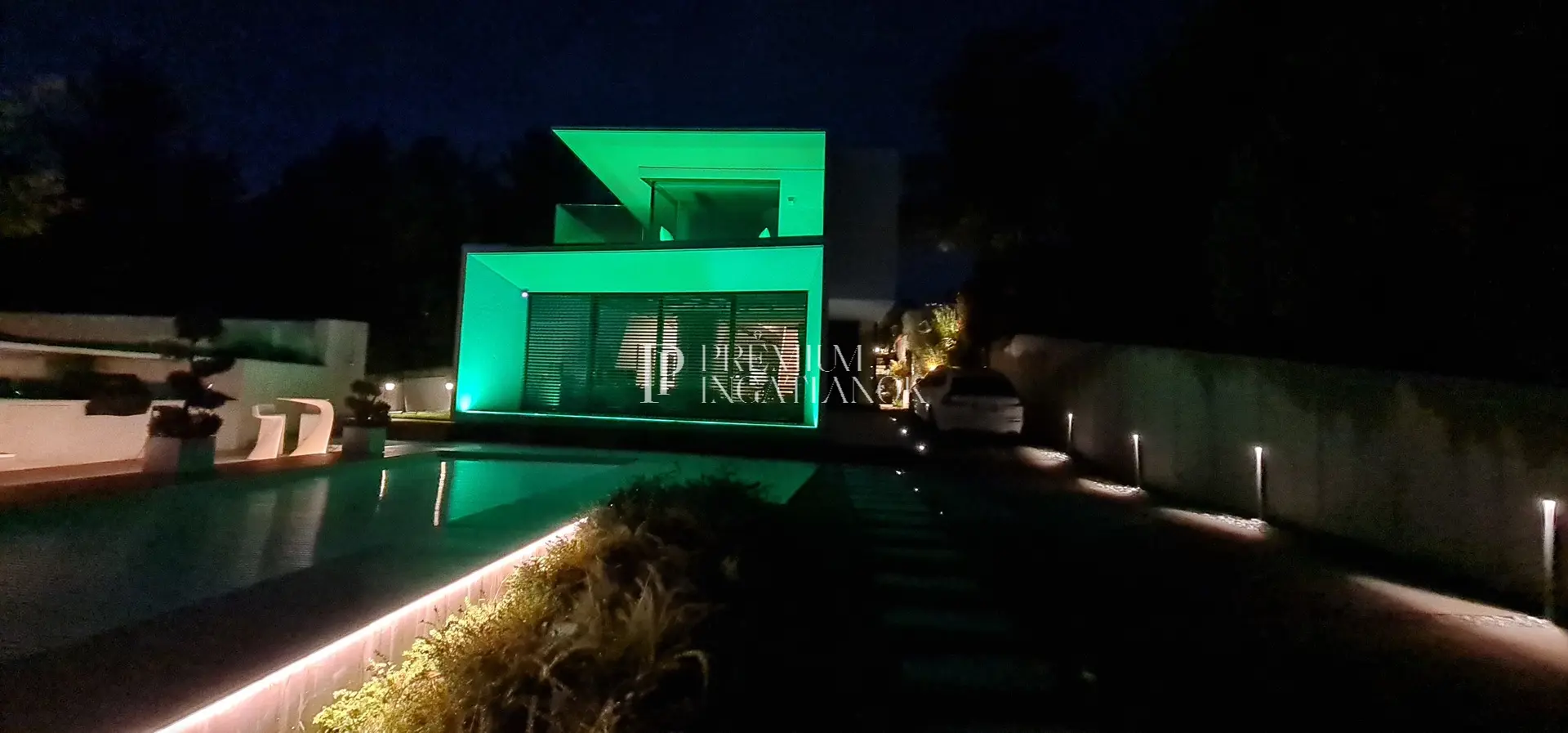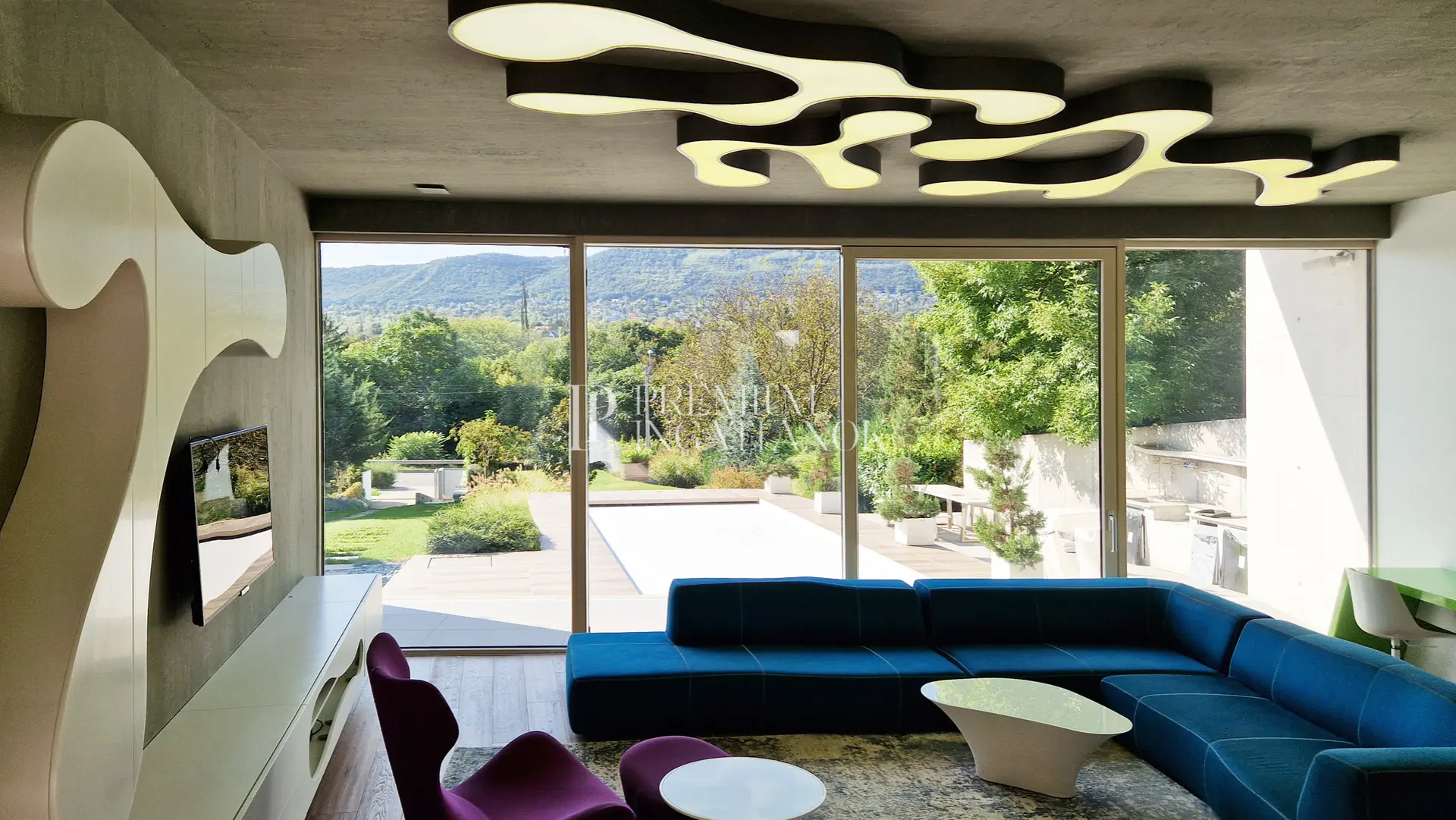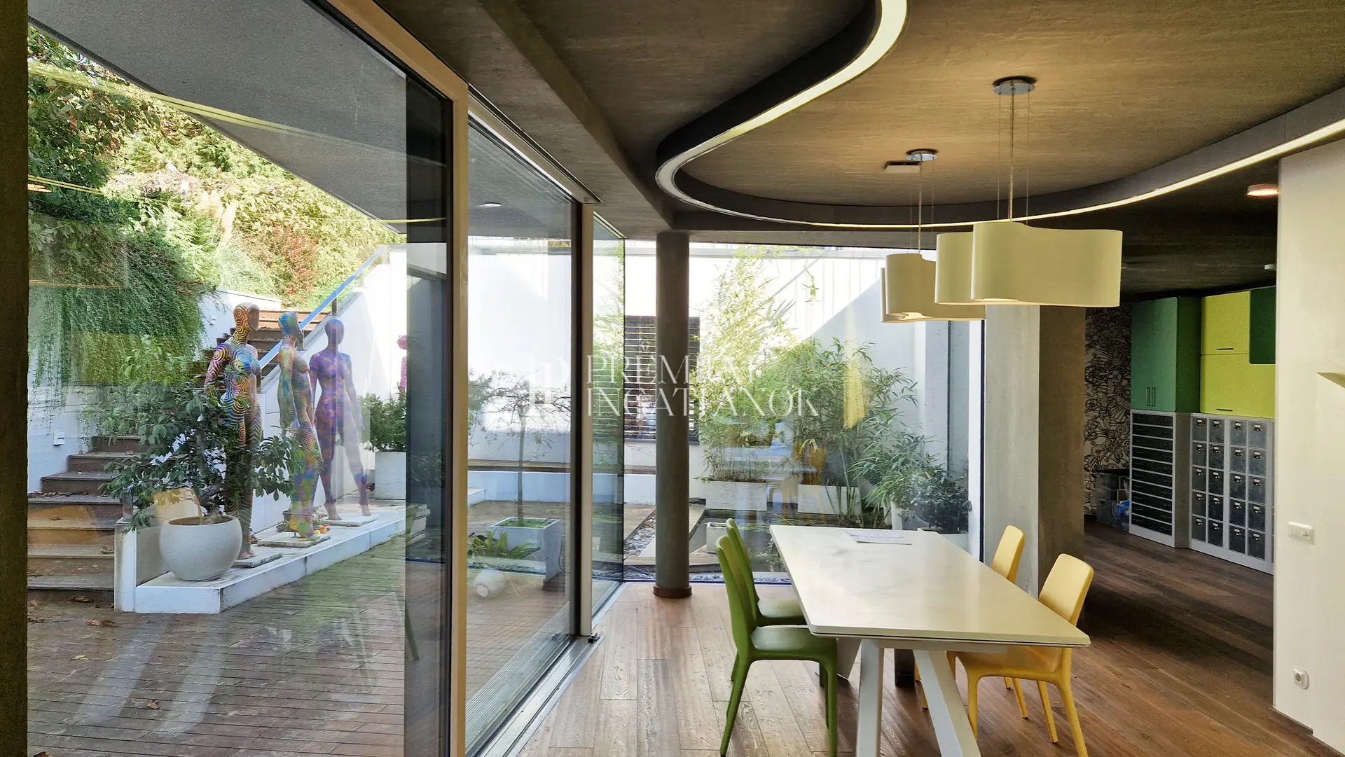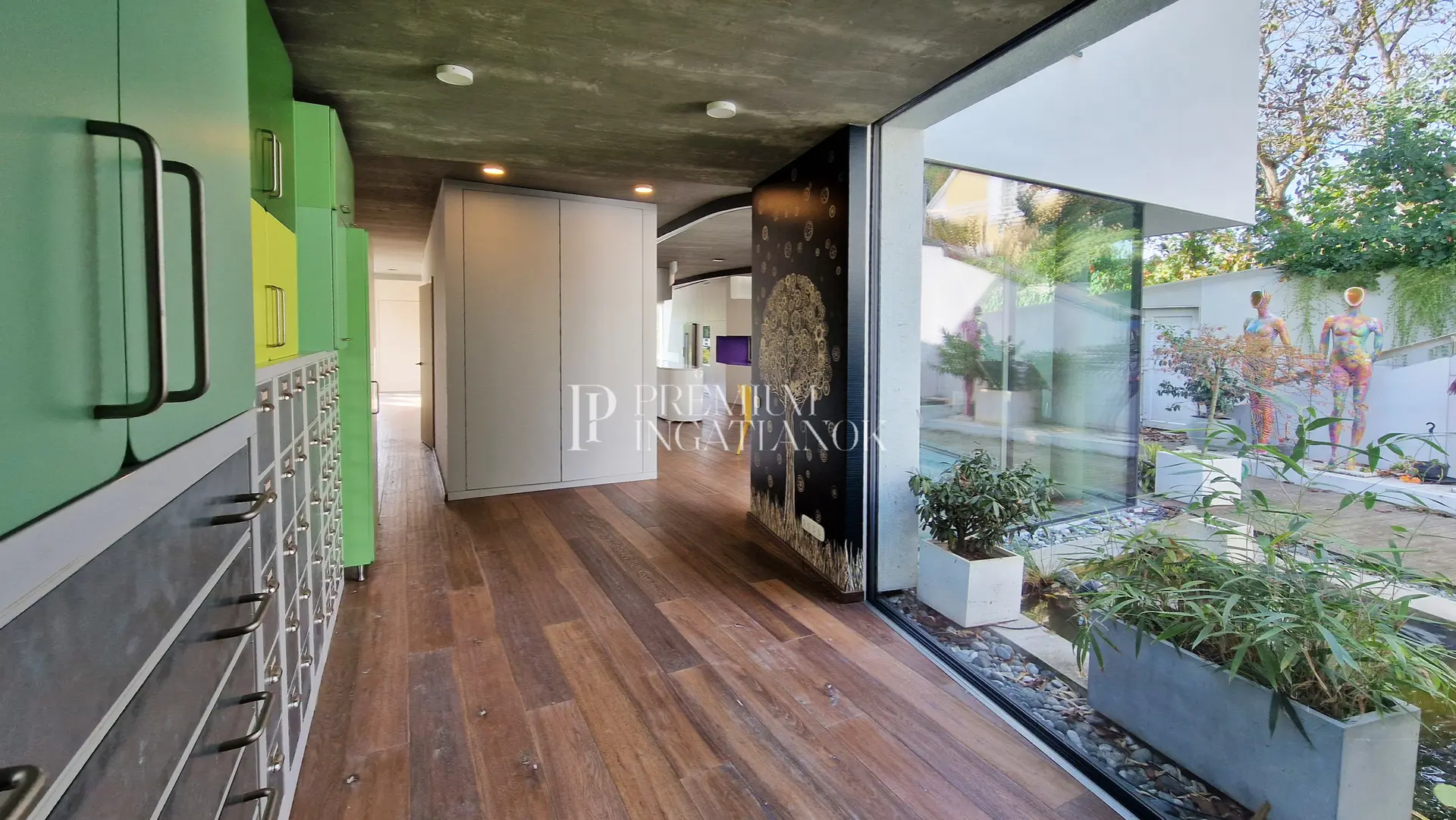 A földszinti 40 m2-es napsütötte, déli tájolású nappaliból tudunk kilépni a medencés teraszra. Az öntözőrendszerrel felszerelt, gyönyörűen parkosított kert igazi megnyugvást ad egy sűrű nap után. A házhoz tartozik kerti konyha, szauna, jacuzzi és saját fitness terem is.