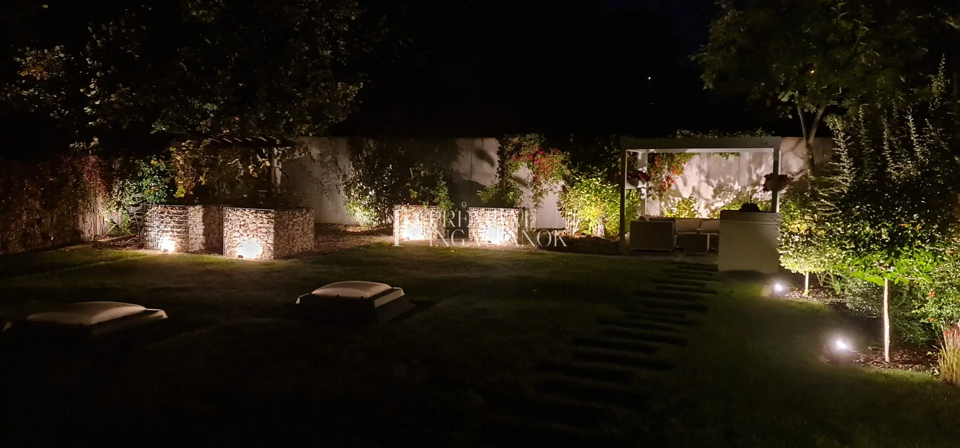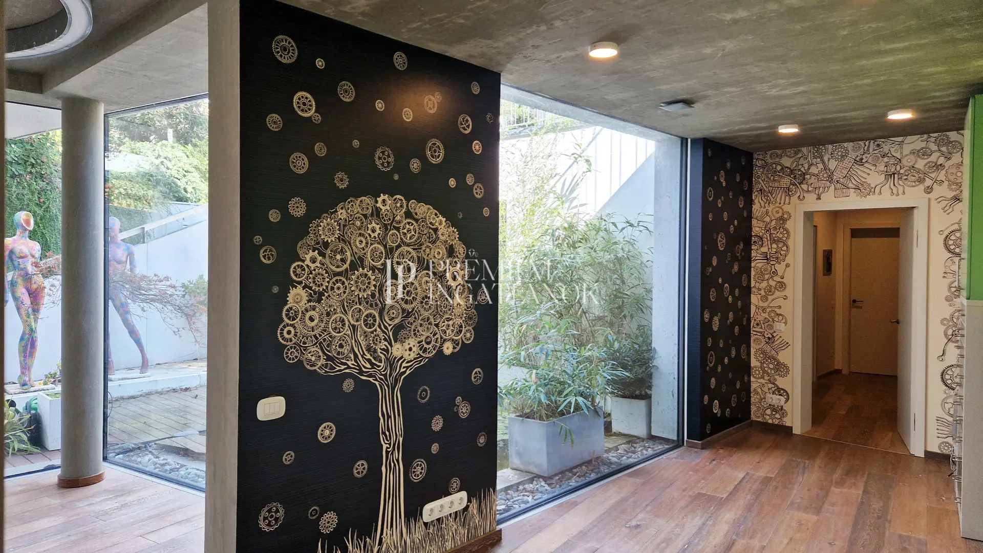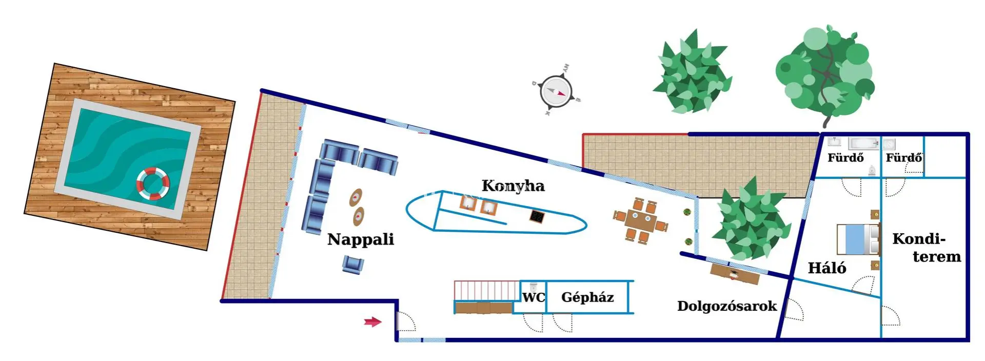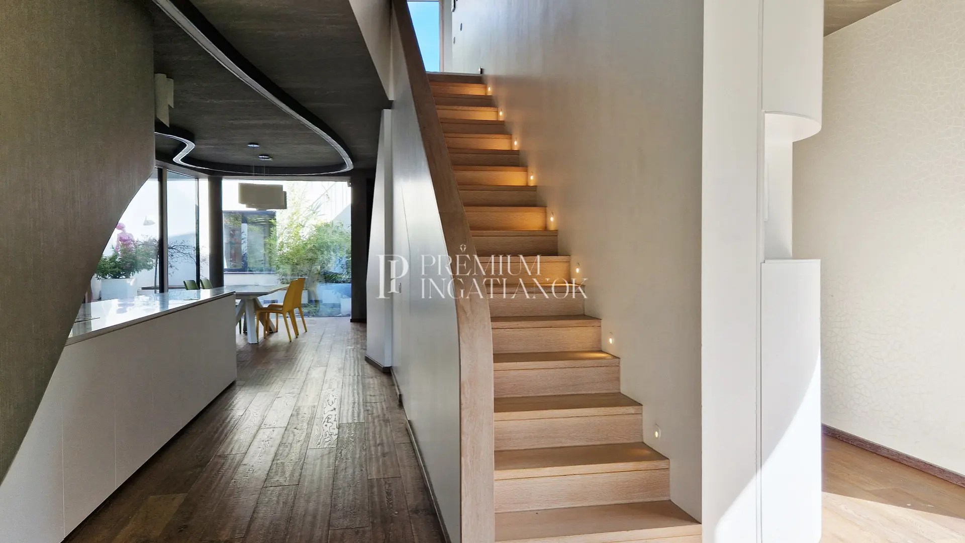 A földszinti 40 m2-es napsütötte, déli tájolású nappaliból tudunk kilépni a medencés teraszra. Az öntözőrendszerrel felszerelt, gyönyörűen parkosított kert igazi megnyugvást ad egy sűrű nap után. A házhoz tartozik kerti konyha, szauna, jacuzzi és saját fitness terem is.