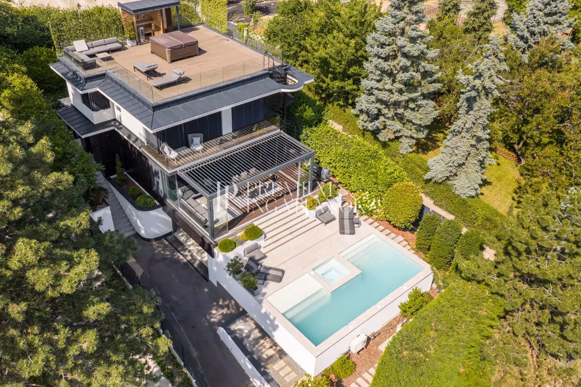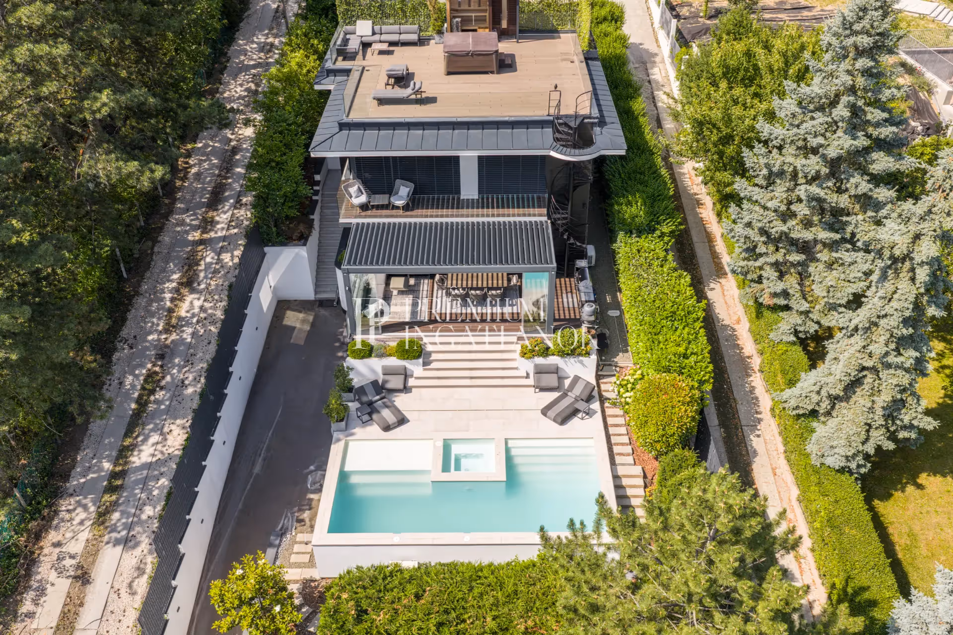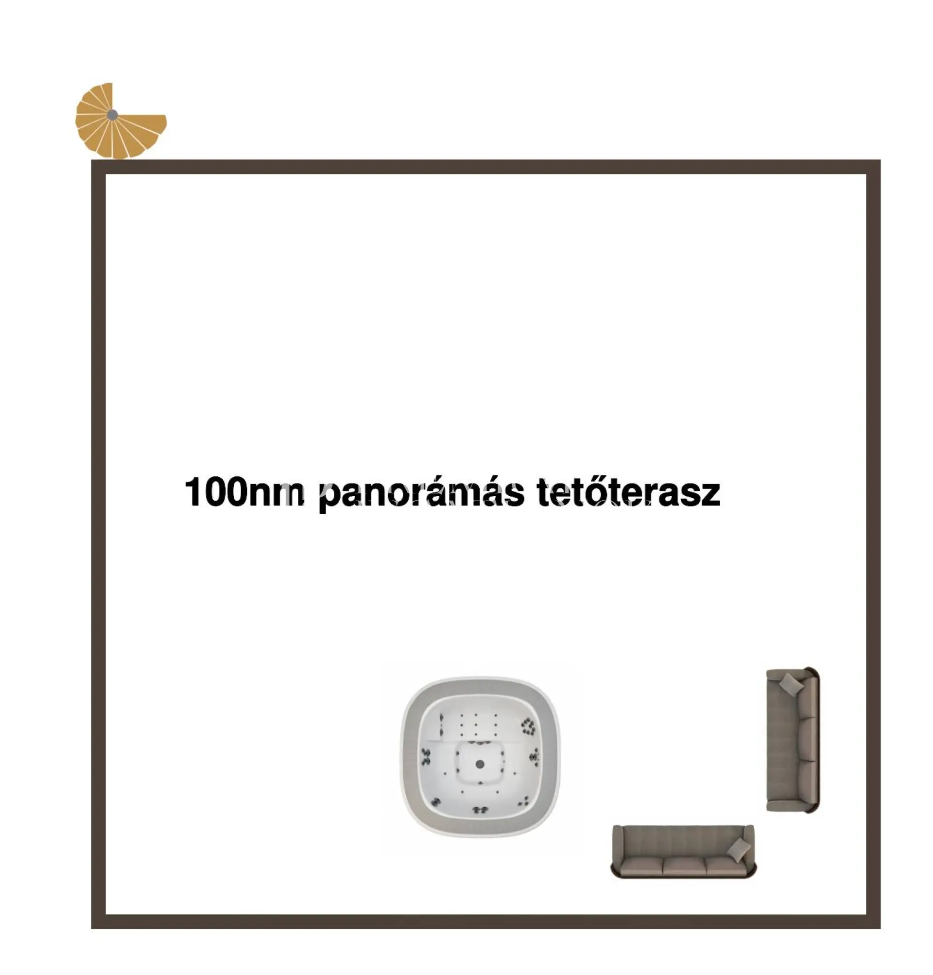 100 m² panoráma tetőterasz HotSpring jakuzzival, panorámás infra- és finn szaunával